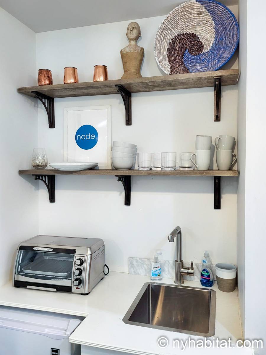 Entrando nel soggiorno contemporaneo, troverete un divano, un tavolo da pranzo, un condizionatore e due finestre di medie dimensioni. La cucina a vista è dotata di frigorifero, freezer e forno e ha un arredamento rustico e di classe, caratteristica rara nella Grande Mela! La camera da letto con pareti bianche include un letto a una piazza e mezza con lenzuola incluse, due finestre di medie dimensioni e un condizionatore! Il bagno in piastrelle bianche, con pavimento in piastrelle bianche e nere, dispone di una doccia con porta in vetro e di un ripostiglio!