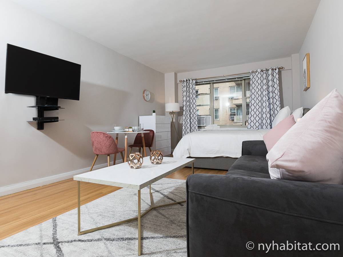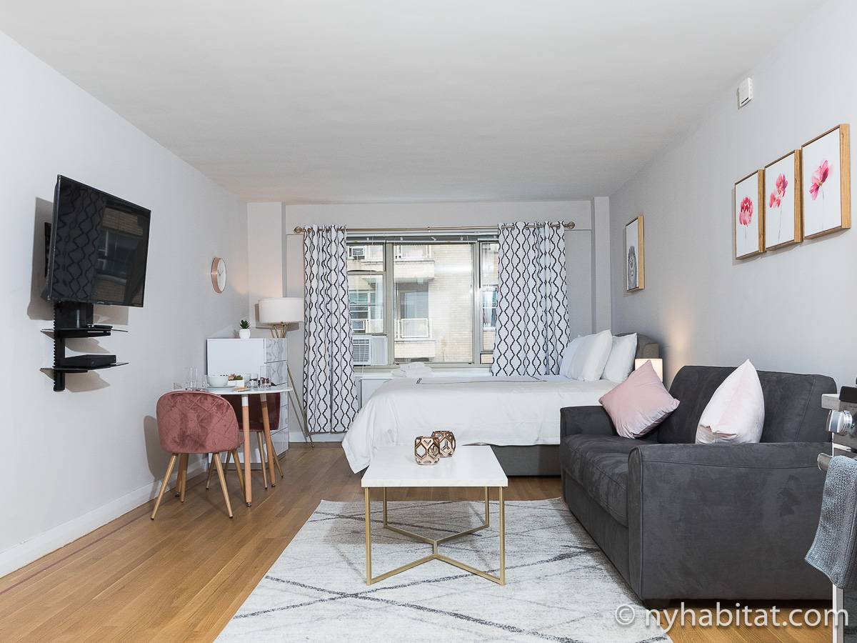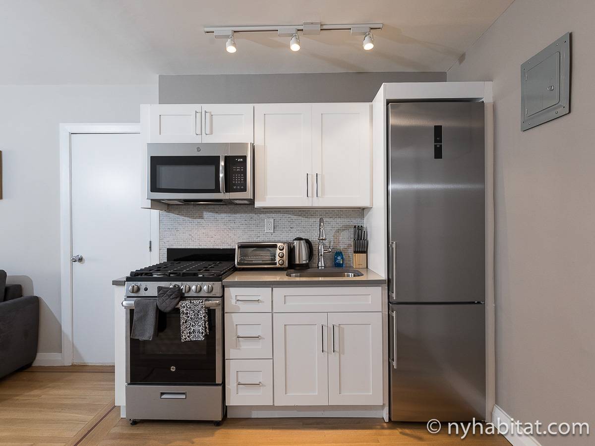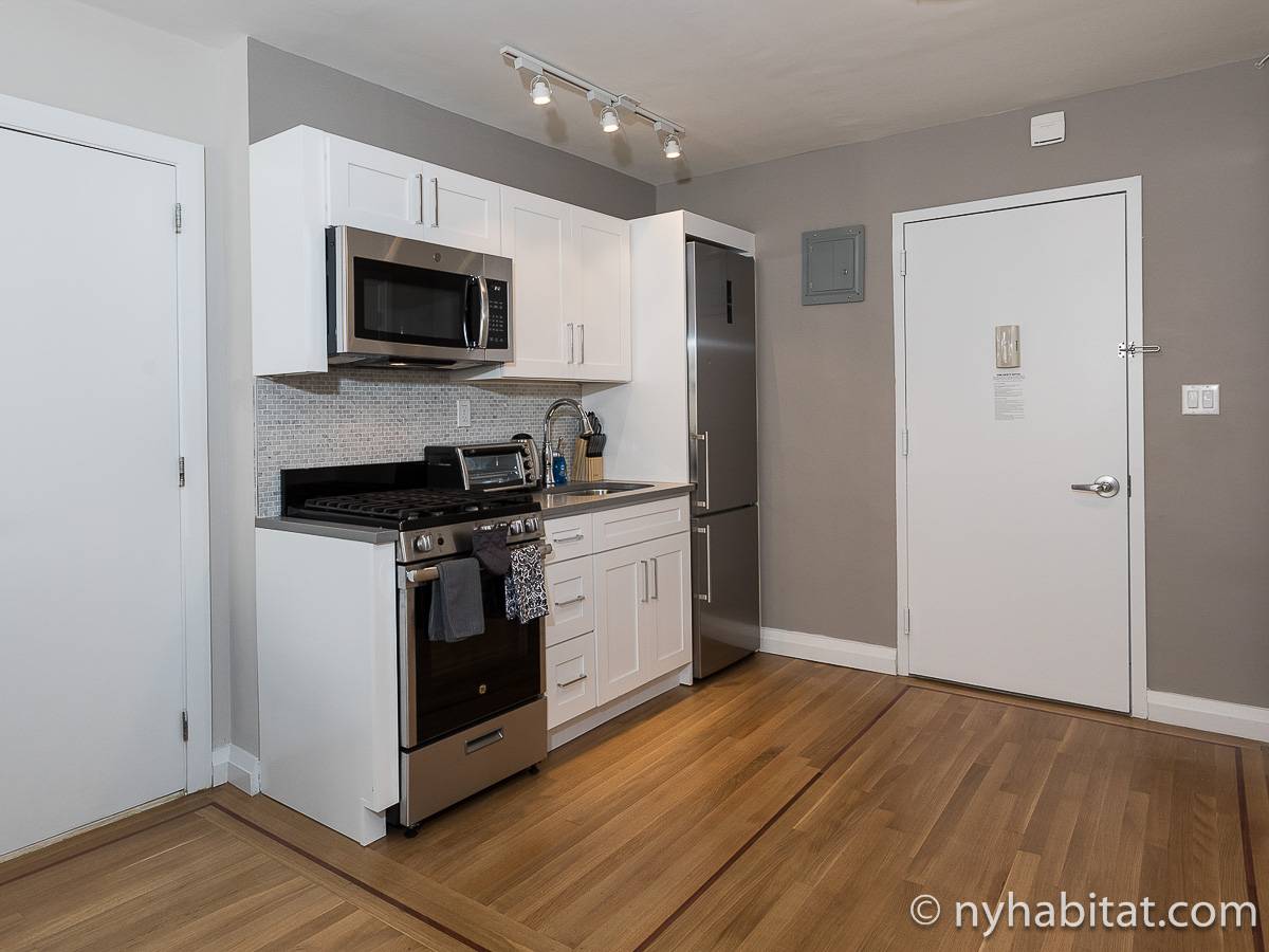 Questo stiloso monolocale dispone di tutto il necessario per aiutarvi durante il vostro trasferimento a New York City. Questo appartamento dispone di wi-fi e condizionatore. L’area soggiorno è arredata con tappeto, divano grigio scuro, tavolino e tv a schermo piatto a muro per una serata cinema in tutta comodità. Il tavolo da pranzo per due è l’ideale per gustare pasti fatti in casa. L’ampia cucina è dotata di credenza bianca, illuminazione a binario ed elettrodomestici in acciaio inox, inclusi fornelli e forno, microonde, caffettiera e frigorifero. Al capo opposto dell’appartamento, vicino alla finestra troverete un letto queen size pronto ad accogliervi dopo una lunga giornata, accompagnato da comodino e cassettiera. Il bagno bianco è dotato di una cabina doccia moderna.