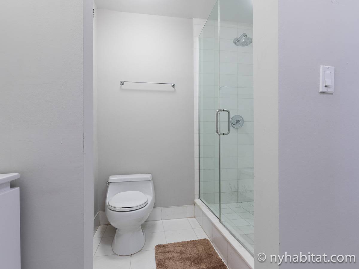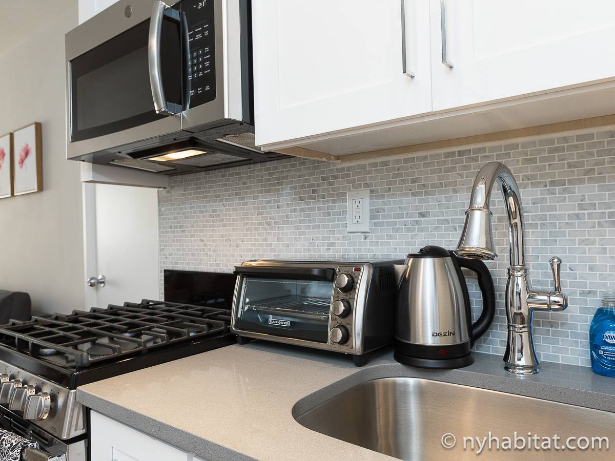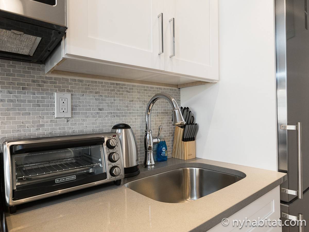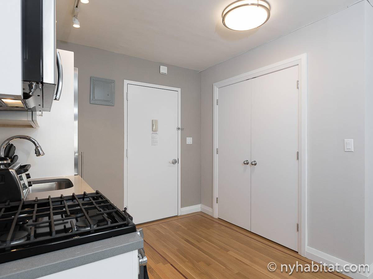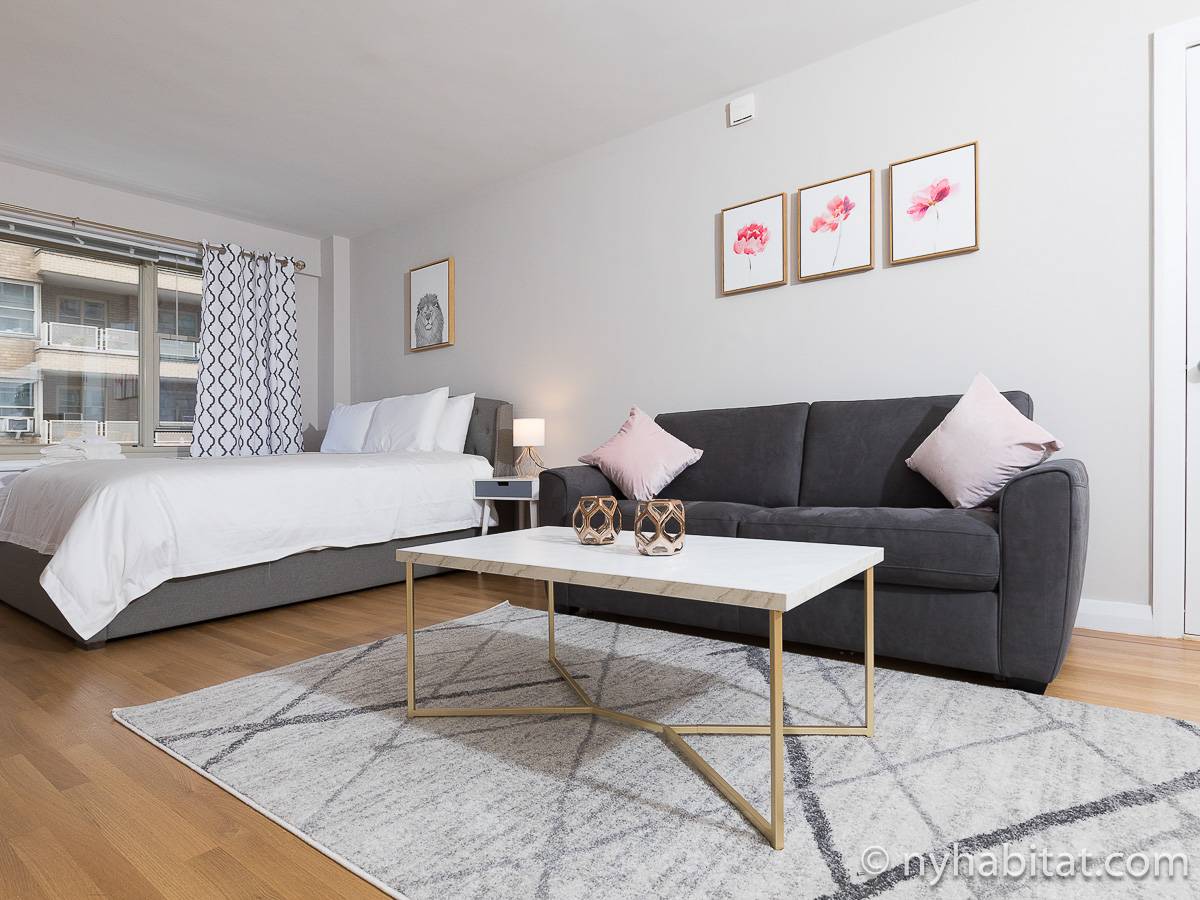 Questo stiloso monolocale dispone di tutto il necessario per aiutarvi durante il vostro trasferimento a New York City. Questo appartamento dispone di wi-fi e condizionatore. L’area soggiorno è arredata con tappeto, divano grigio scuro, tavolino e tv a schermo piatto a muro per una serata cinema in tutta comodità. Il tavolo da pranzo per due è l’ideale per gustare pasti fatti in casa. L’ampia cucina è dotata di credenza bianca, illuminazione a binario ed elettrodomestici in acciaio inox, inclusi fornelli e forno, microonde, caffettiera e frigorifero. Al capo opposto dell’appartamento, vicino alla finestra troverete un letto queen size pronto ad accogliervi dopo una lunga giornata, accompagnato da comodino e cassettiera. Il bagno bianco è dotato di una cabina doccia moderna.