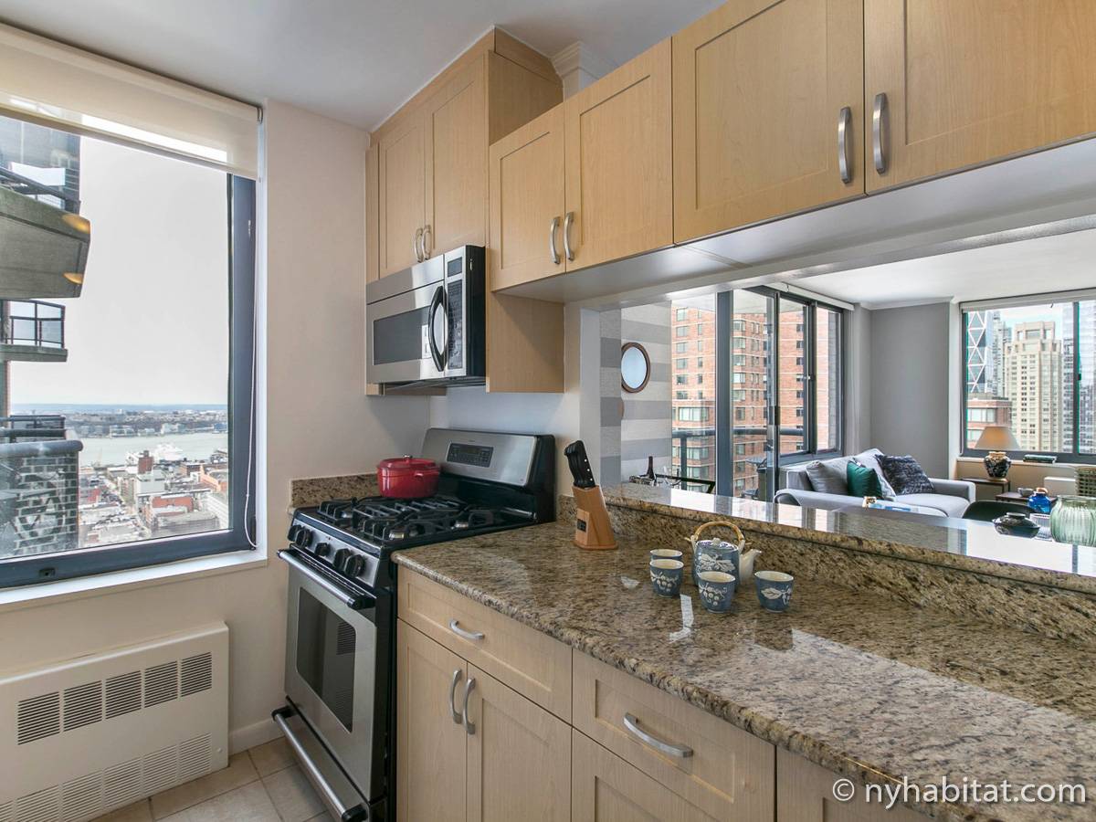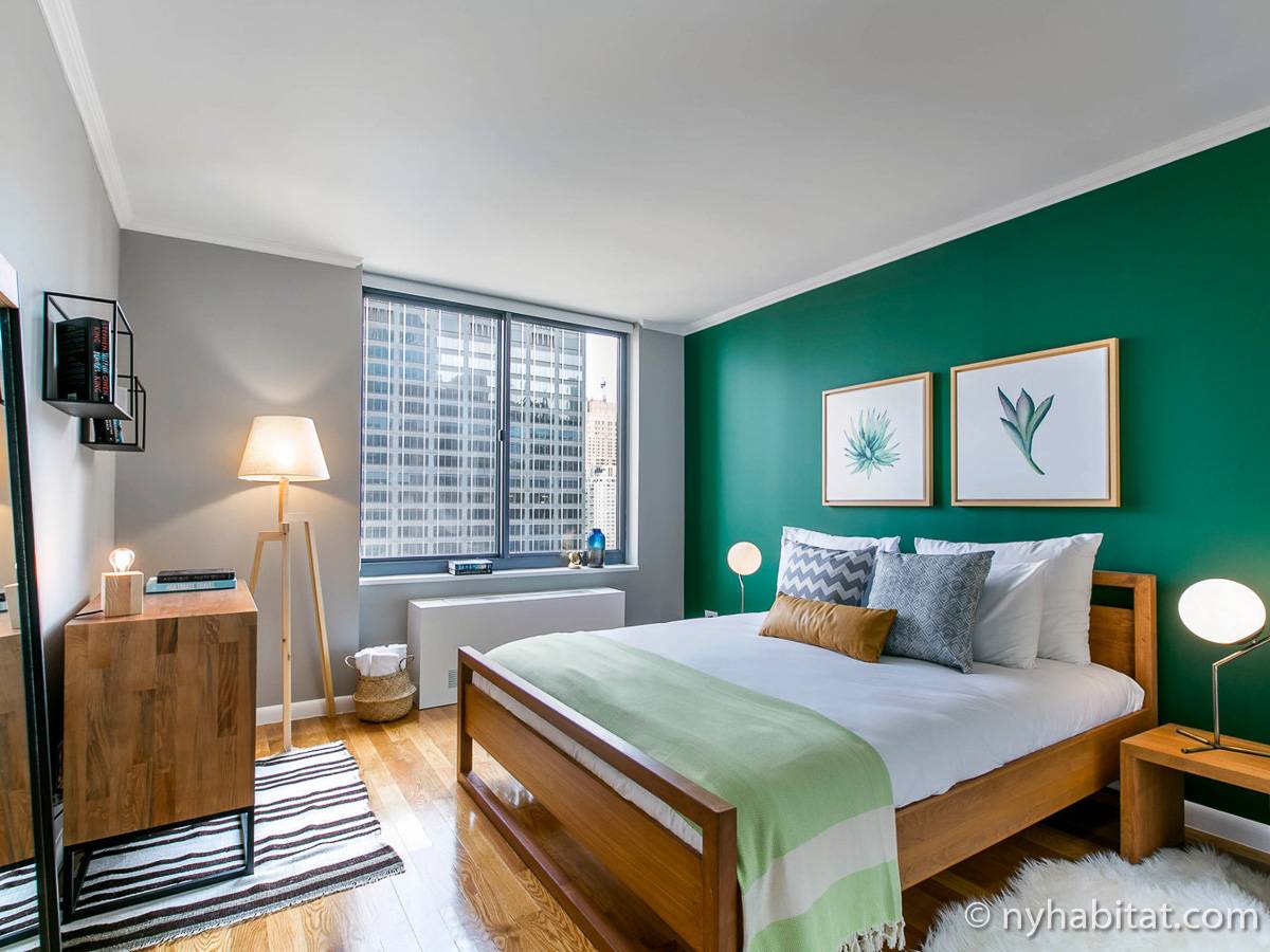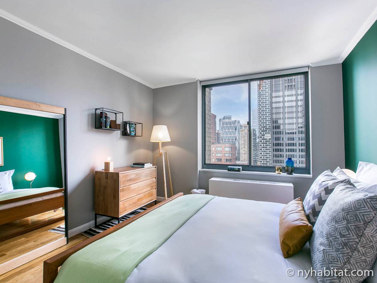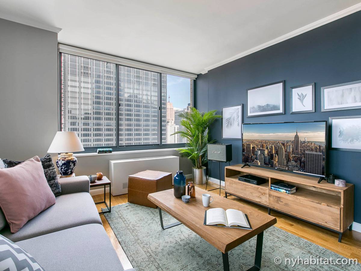 Questo appartamento ammobiliato con una camera da letto e un bagno si trova a Midtown West, a New York City, al 57° piano (equivalente al 56° piano europeo) di un alto edificio tra la West 48th Street e 8th Avenue. È dotato di una lavanderia, di un ascensore, di una palestra, di un parcheggio coperto e di un servizio di sicurezza a tempo pieno.