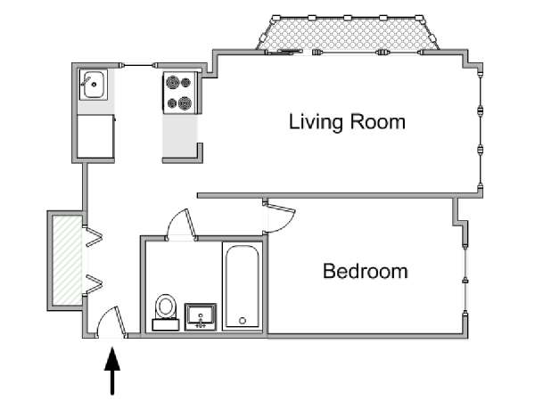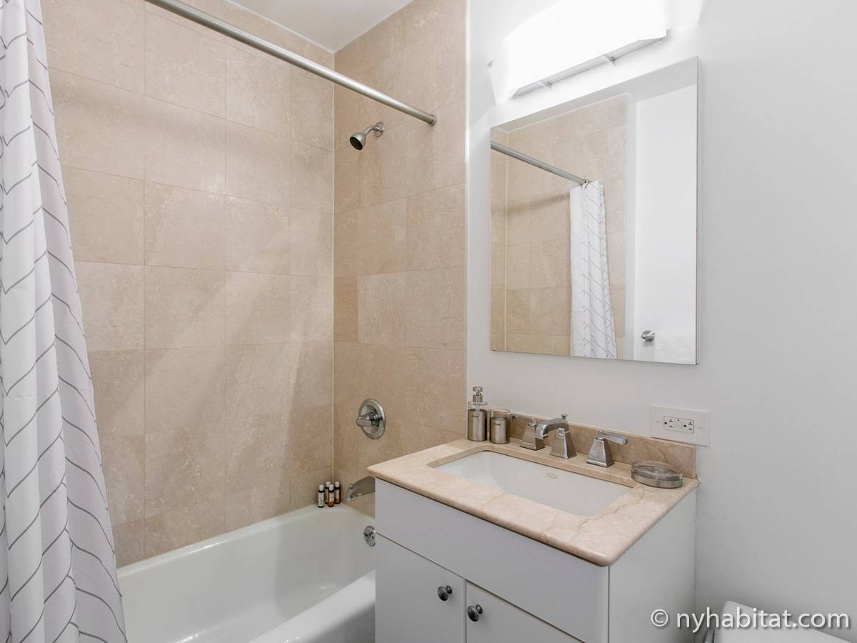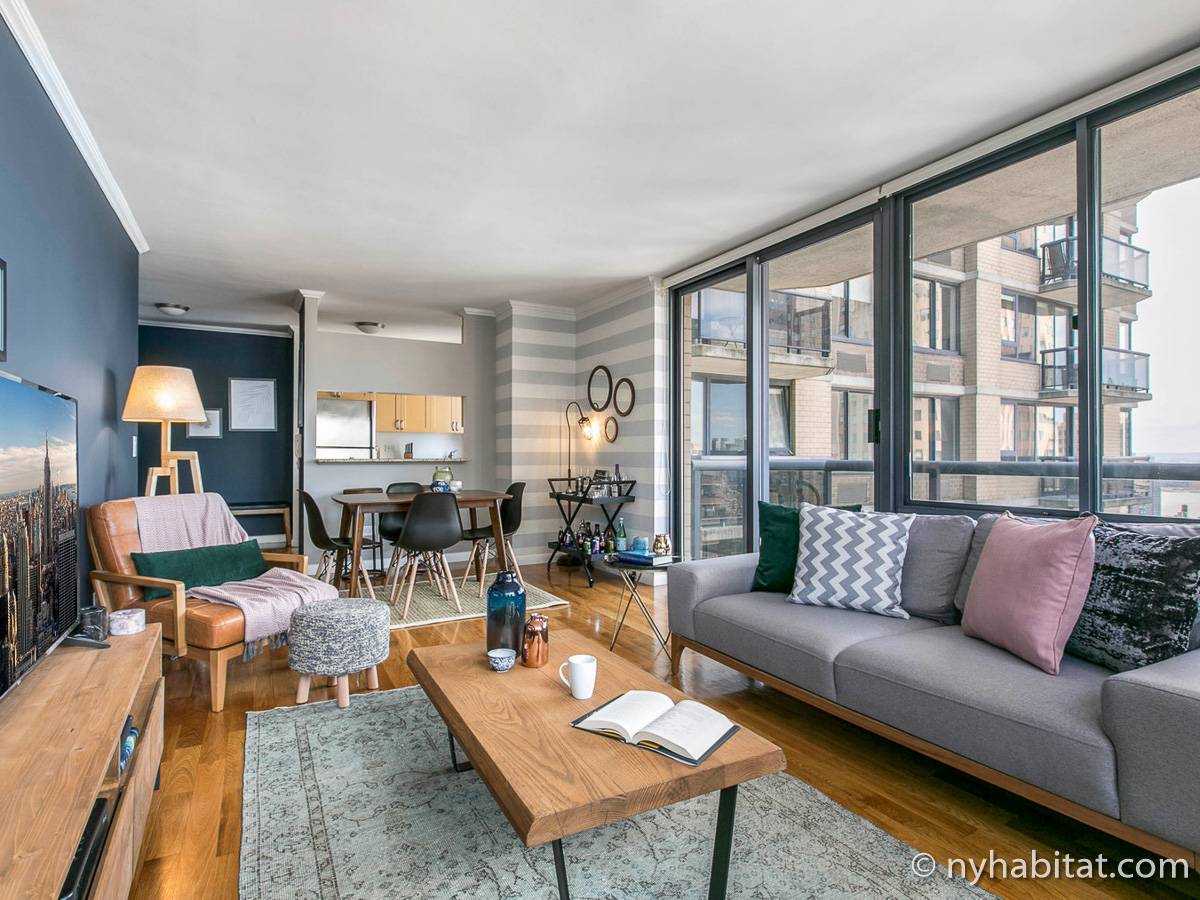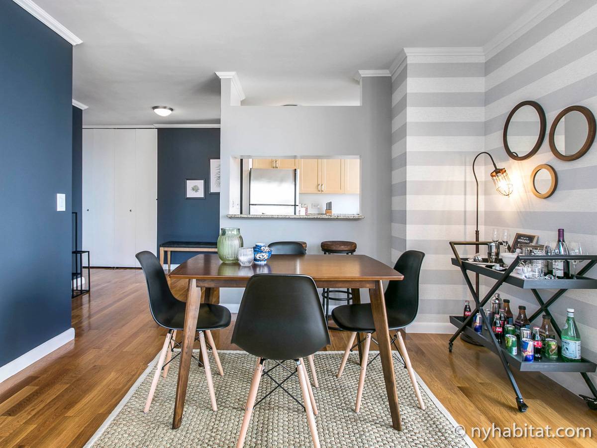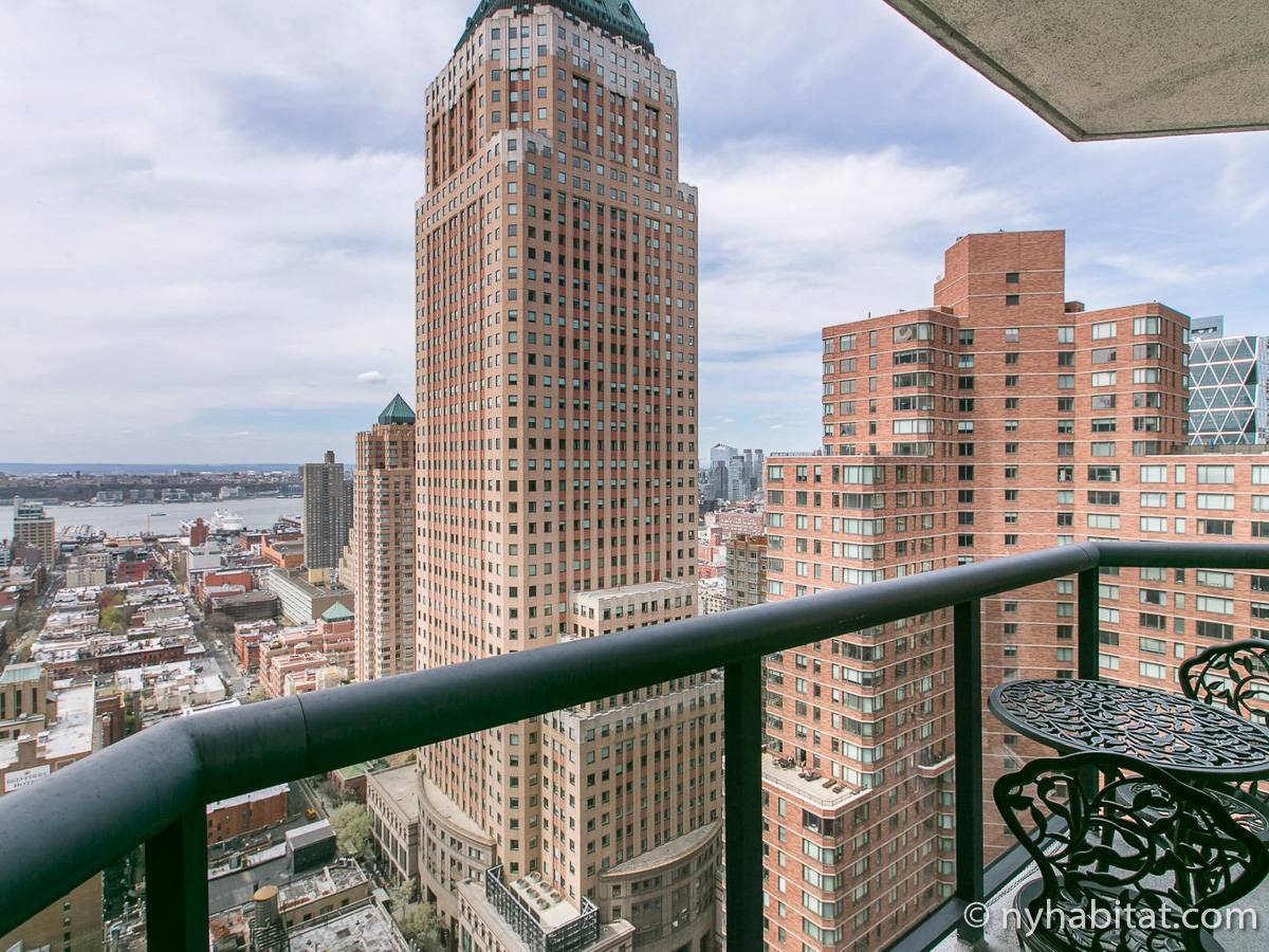 Questo appartamento ammobiliato con una camera da letto e un bagno si trova a Midtown West, a New York City, al 57° piano (equivalente al 56° piano europeo) di un alto edificio tra la West 48th Street e 8th Avenue. È dotato di una lavanderia, di un ascensore, di una palestra, di un parcheggio coperto e di un servizio di sicurezza a tempo pieno.