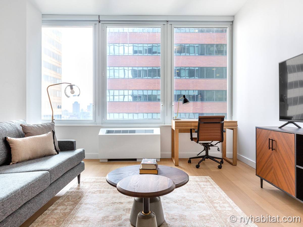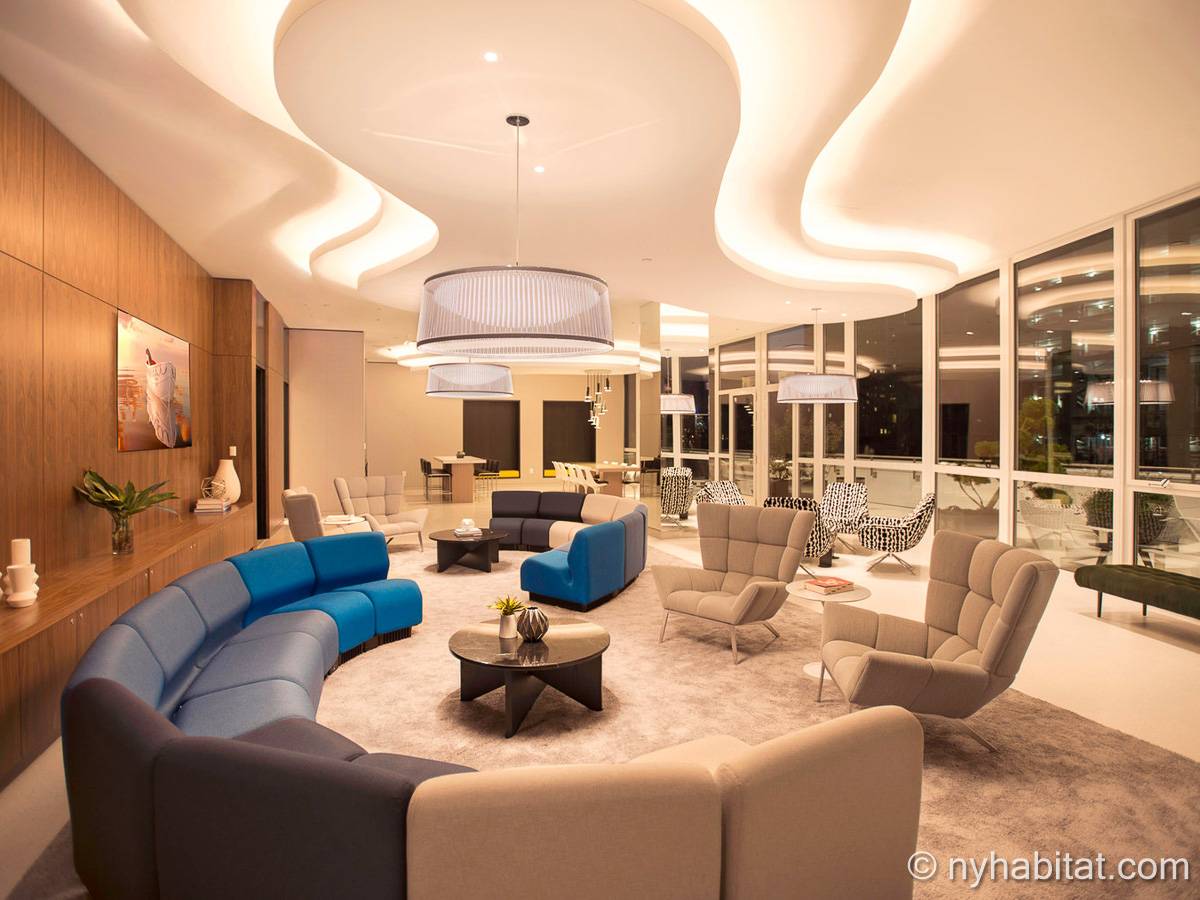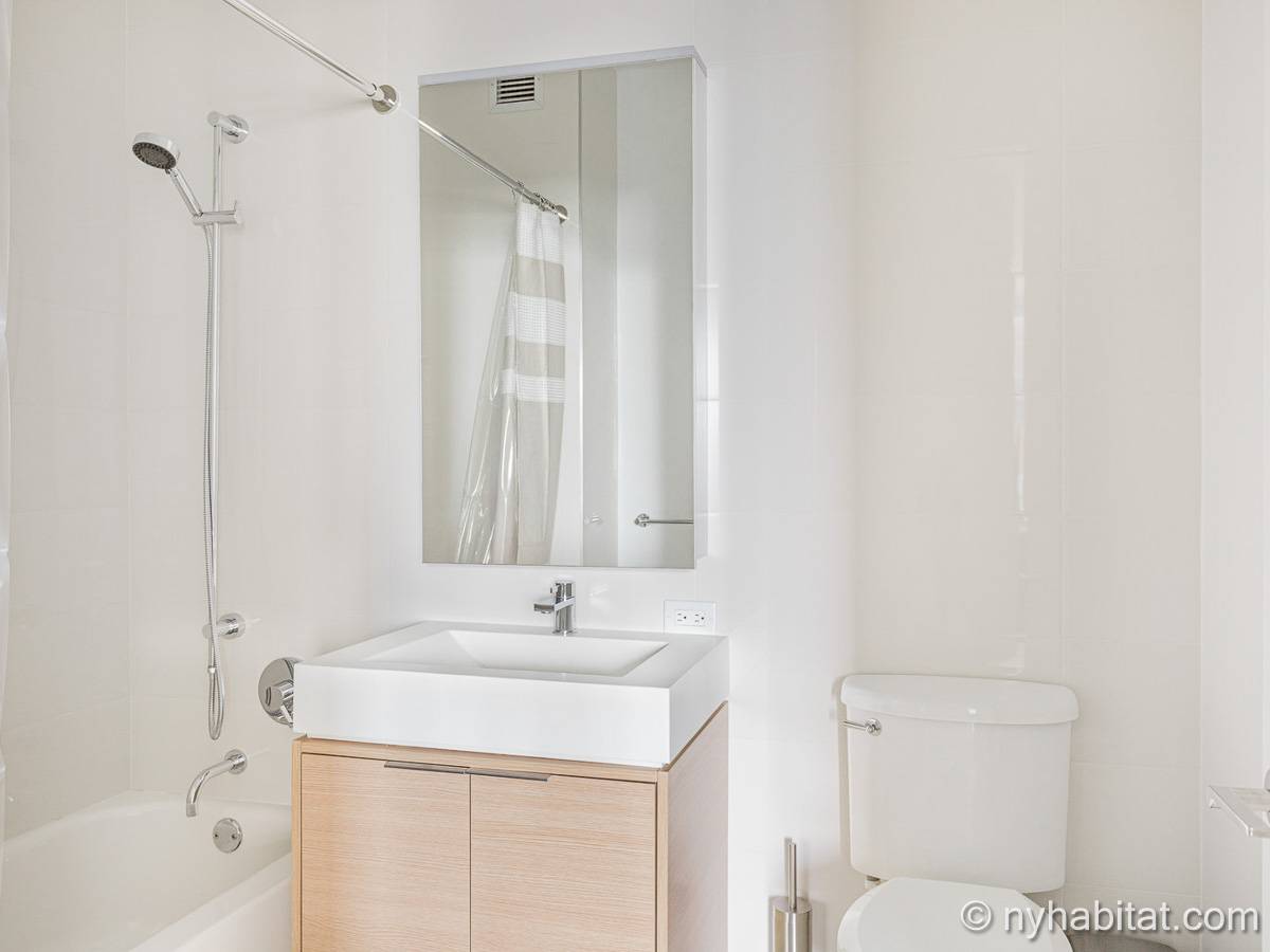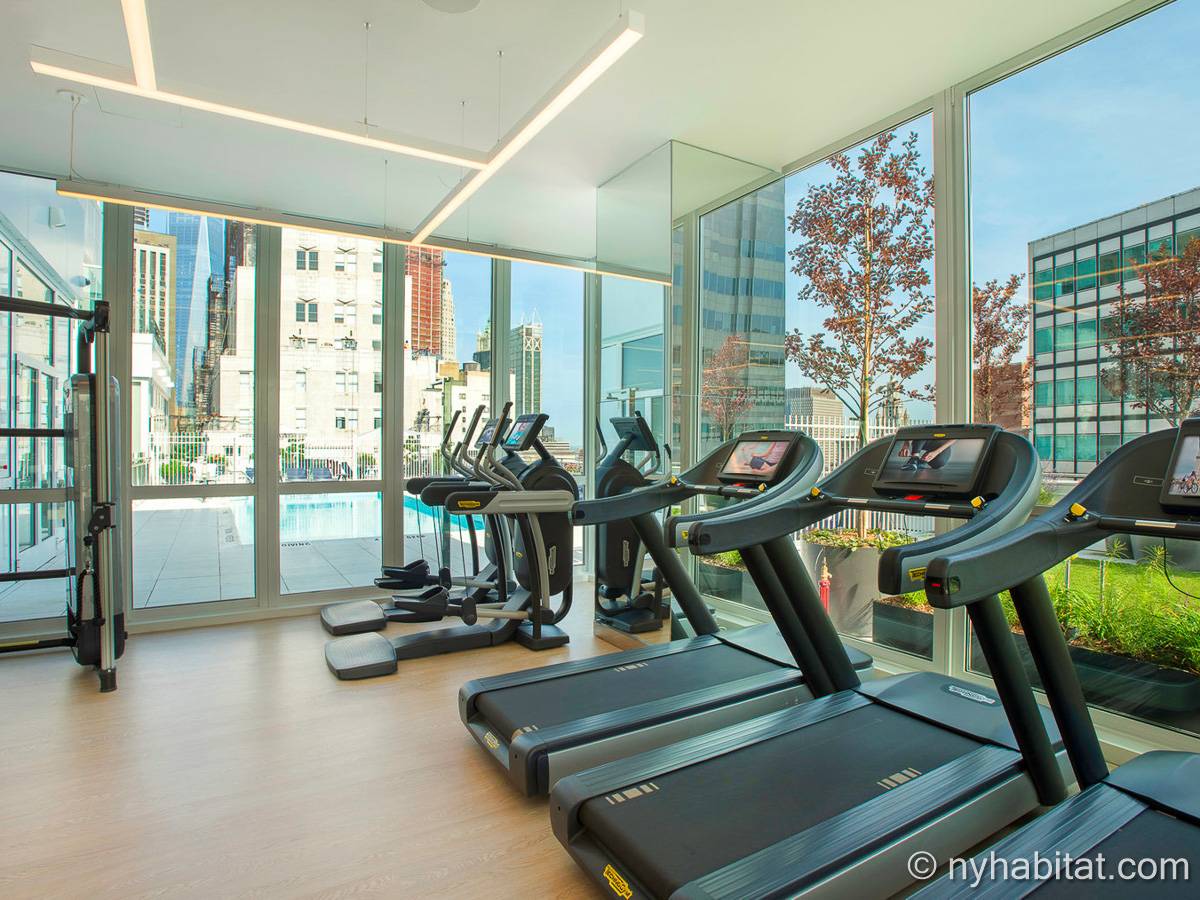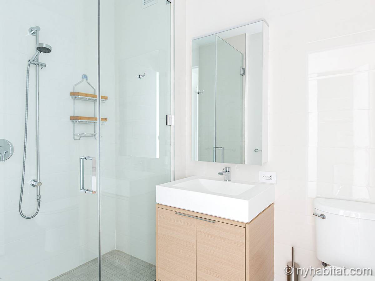 Questo lussuoso appartamento ammobiliato con una camera da letto e due bagni si trova al 12esimo piano (undicesimo piano europeo) di un grattacielo nel distretto finanziario di New York City. Quest’edificio su Water Street e Pearl Street è dotato di portiere, palestra, piscina e ascensore.