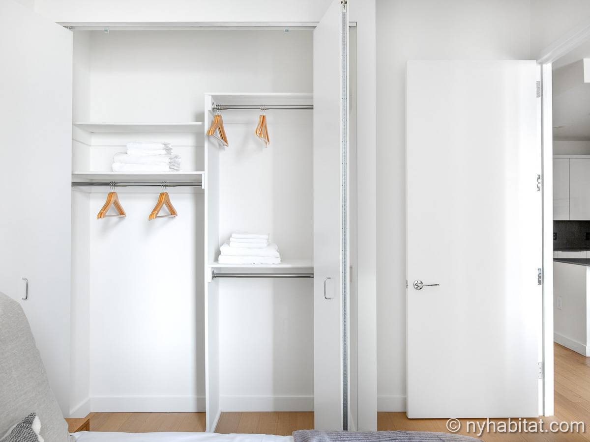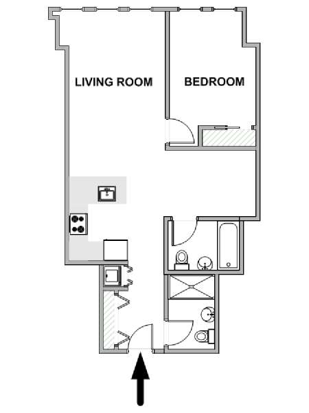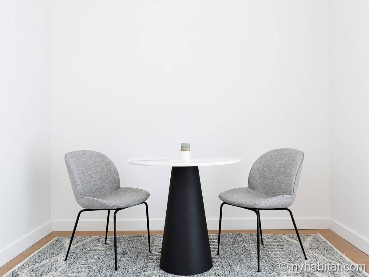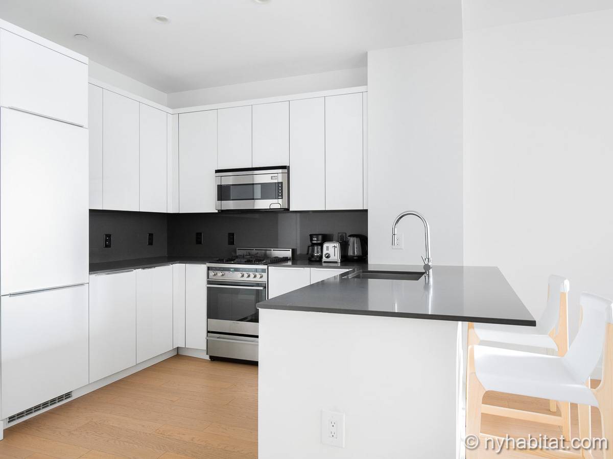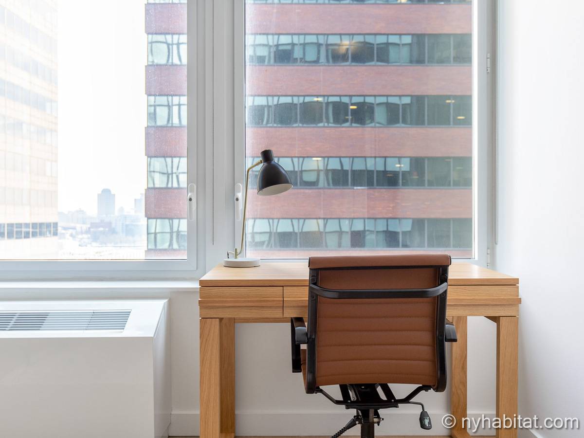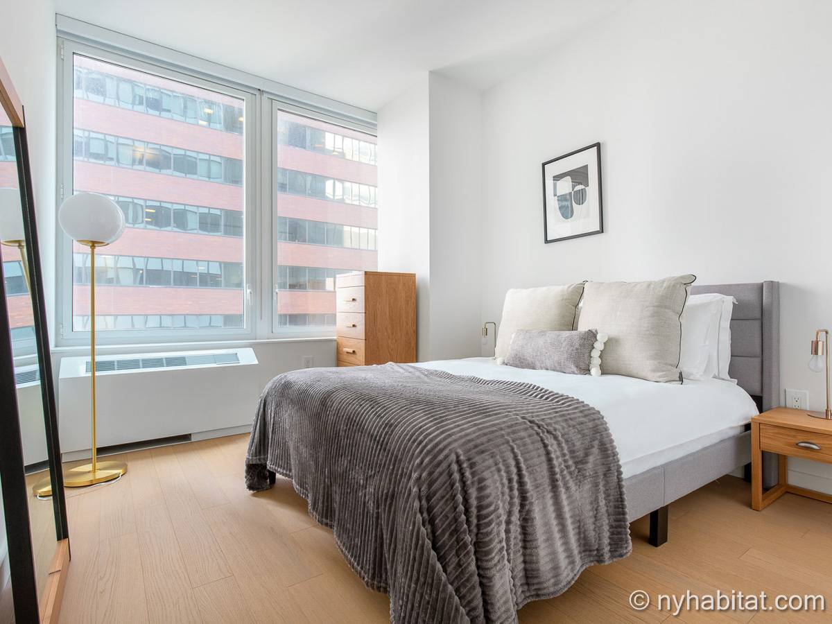 Questo lussuoso appartamento ammobiliato con una camera da letto e due bagni si trova al 12esimo piano (undicesimo piano europeo) di un grattacielo nel distretto finanziario di New York City. Quest’edificio su Water Street e Pearl Street è dotato di portiere, palestra, piscina e ascensore.