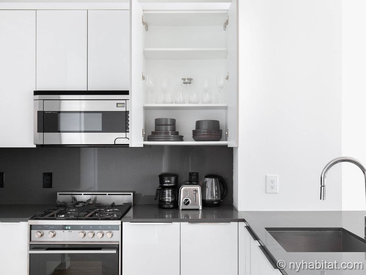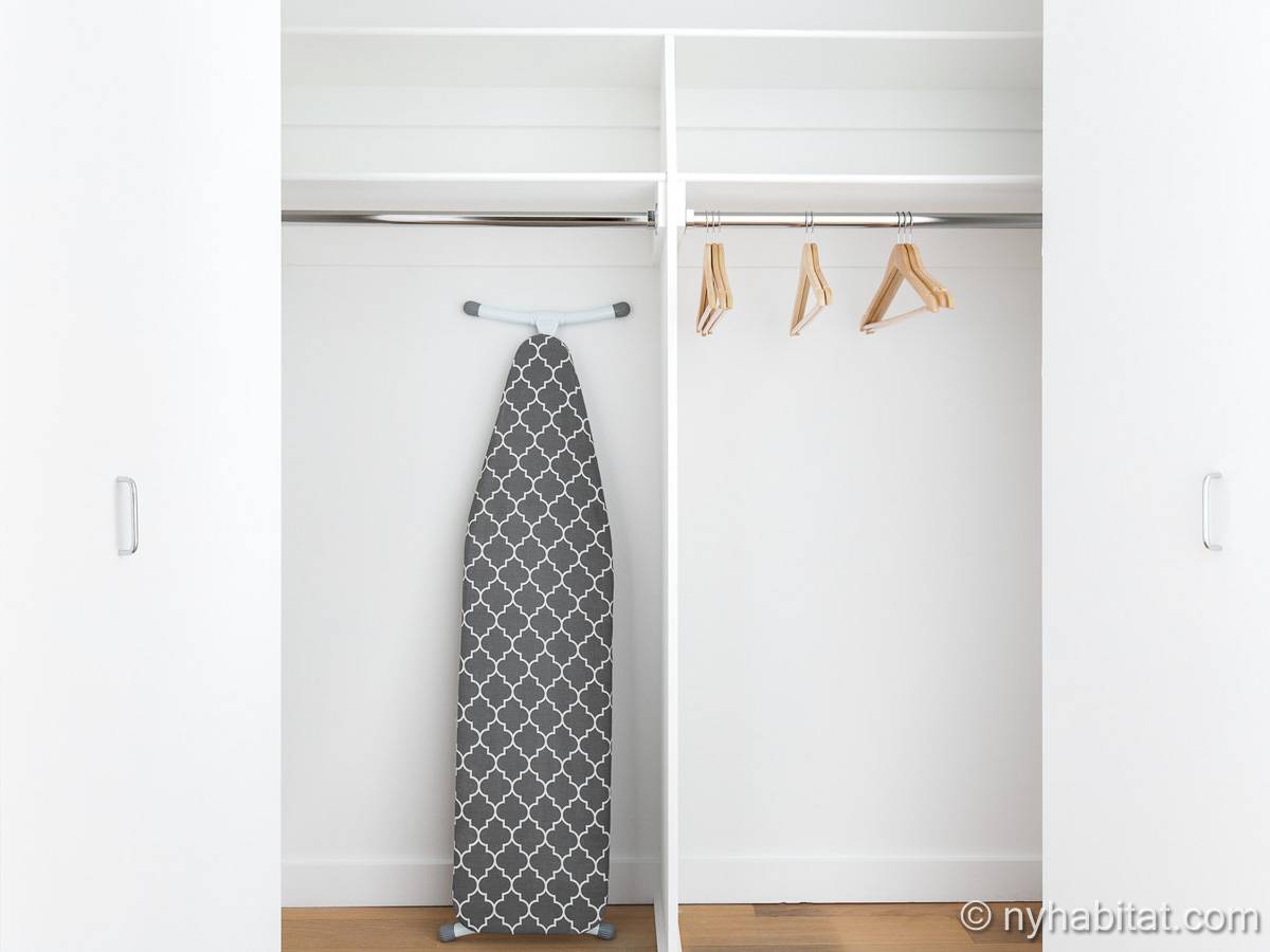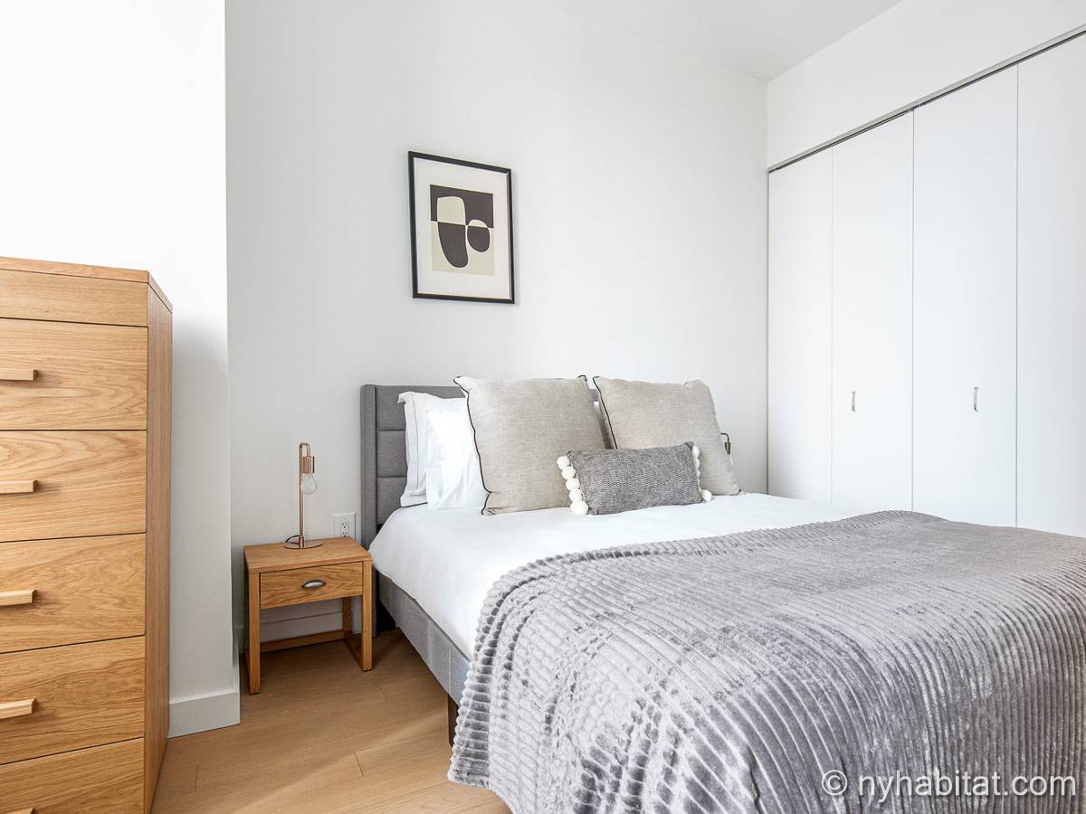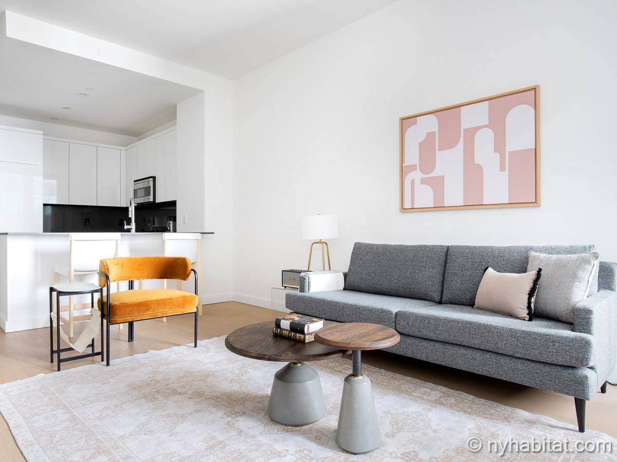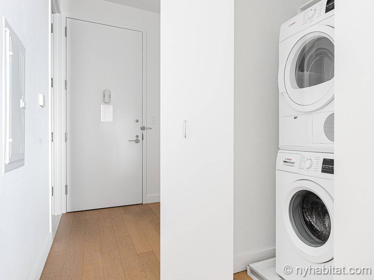 Questo appartamento dallo stile contemporaneo è dotato di pavimenti in legno massello, elettrodomestici in acciaio inox, condizionatore e lavatrice e asciugatrice direttamente nell’appartamento. Quest’appartamento di 849 piedi quadri (79 m2 circa) include una camera da letto, due bagni, soggiorno e cucina americana. La camera da letto dispone di un letto queen size, cassettiera e armadio. Il bagno n°1 è dotato di vasca con doccia integrata, mentre il bagno n°2 ha la doccia. Nel soggiorno troverete divano, tavolino, sedie, mobile multimediale e tv. La cucina americana include un'area in cui mangiare, frigo, forno, microonde, caffettiera, tostapane e lavastoviglie.