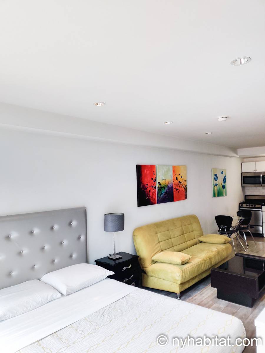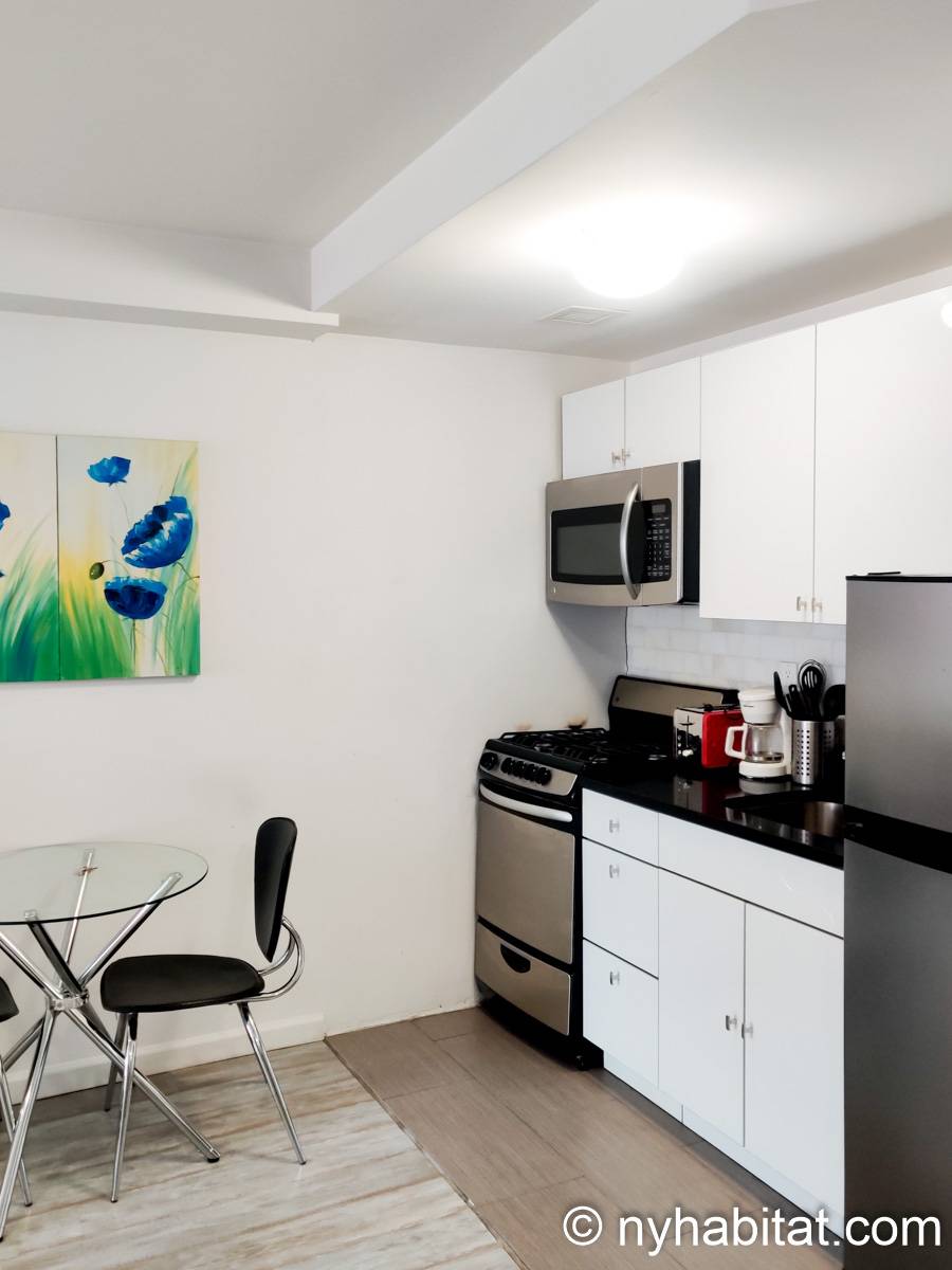 Questo confortevole e accogliente appartamento ammobiliato dispone di pavimenti in legno massello, finestre e vari spazi nei quali potrete conservare i vostri effetti personali. La cucina è dotata di elettrodomestici in acciaio inox, tra cui un piano cottura, un frigorifero, un forno a microonde, un tostapane e una macchinetta per il caffè americano. Nel soggiorno/camera da letto troverete un letto queen size, un divano, un televisore e un tavolo da pranzo, mentre il bagno dispone di una vasca con doccia.