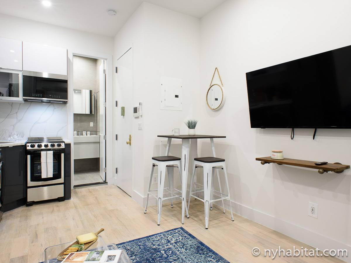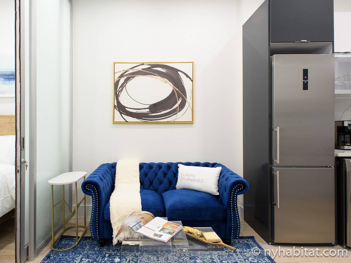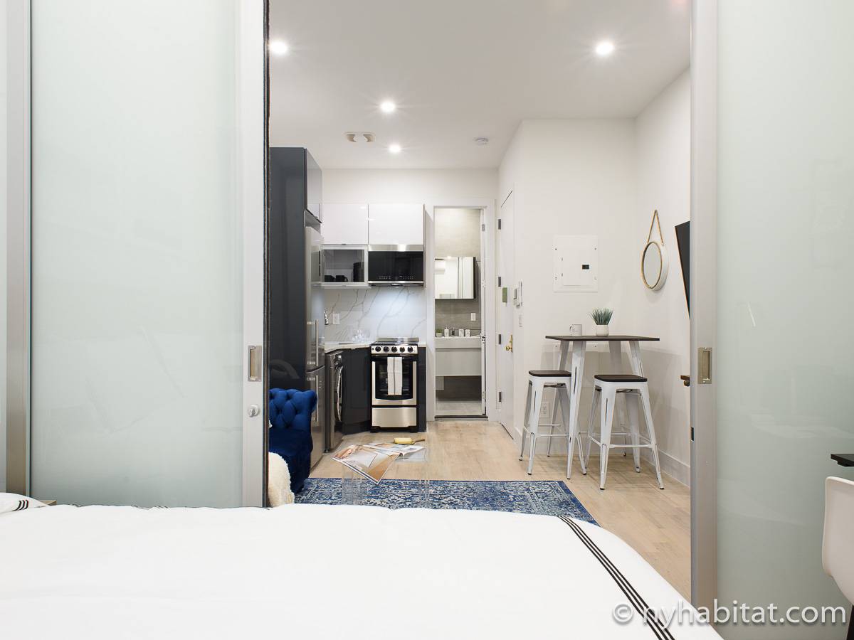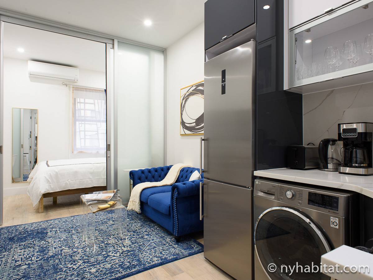 Questo appartamento in affitto di circa 32 m2 presenta arredi moderni come un divano, una TV e un tavolo da pranzo. La cucina moderna dispone di un paraschizzi e un piano di lavoro marmorizzati e di elettrodomestici in acciaio inossidabile, tra cui un frigorifero/congelatore, un forno, un microonde, un tostapane e una macchina per il caffè. Oltre le porte scorrevoli in vetro si trova la camera da letto, dotata di una scrivania, un armadio e un letto matrimoniale. Il bagno riprende il tocco moderno con le sue pareti interamente piastrellate nella doccia.