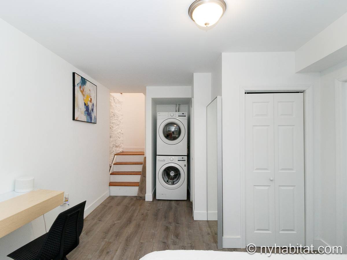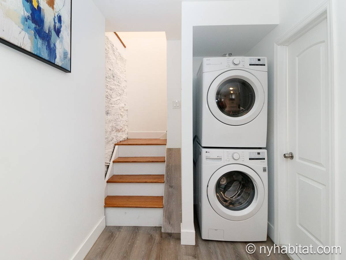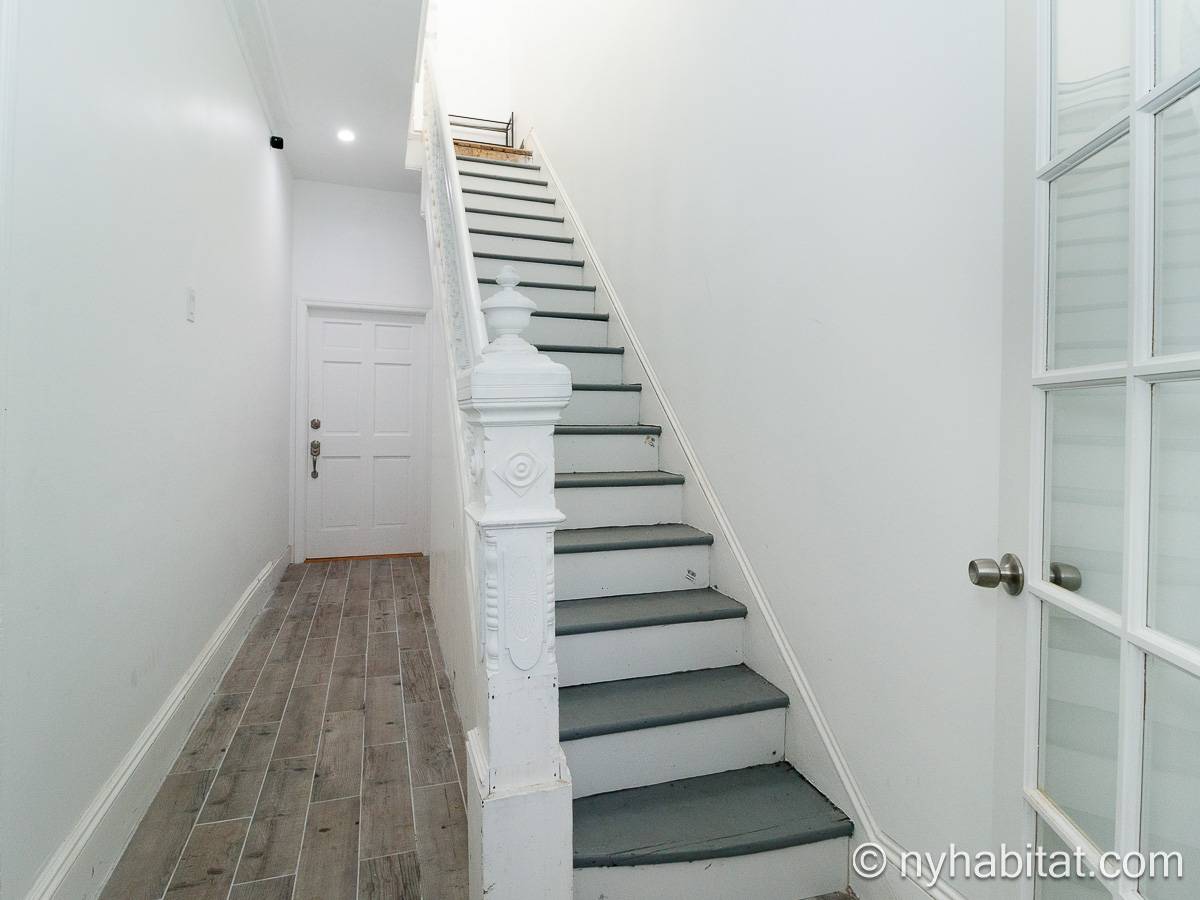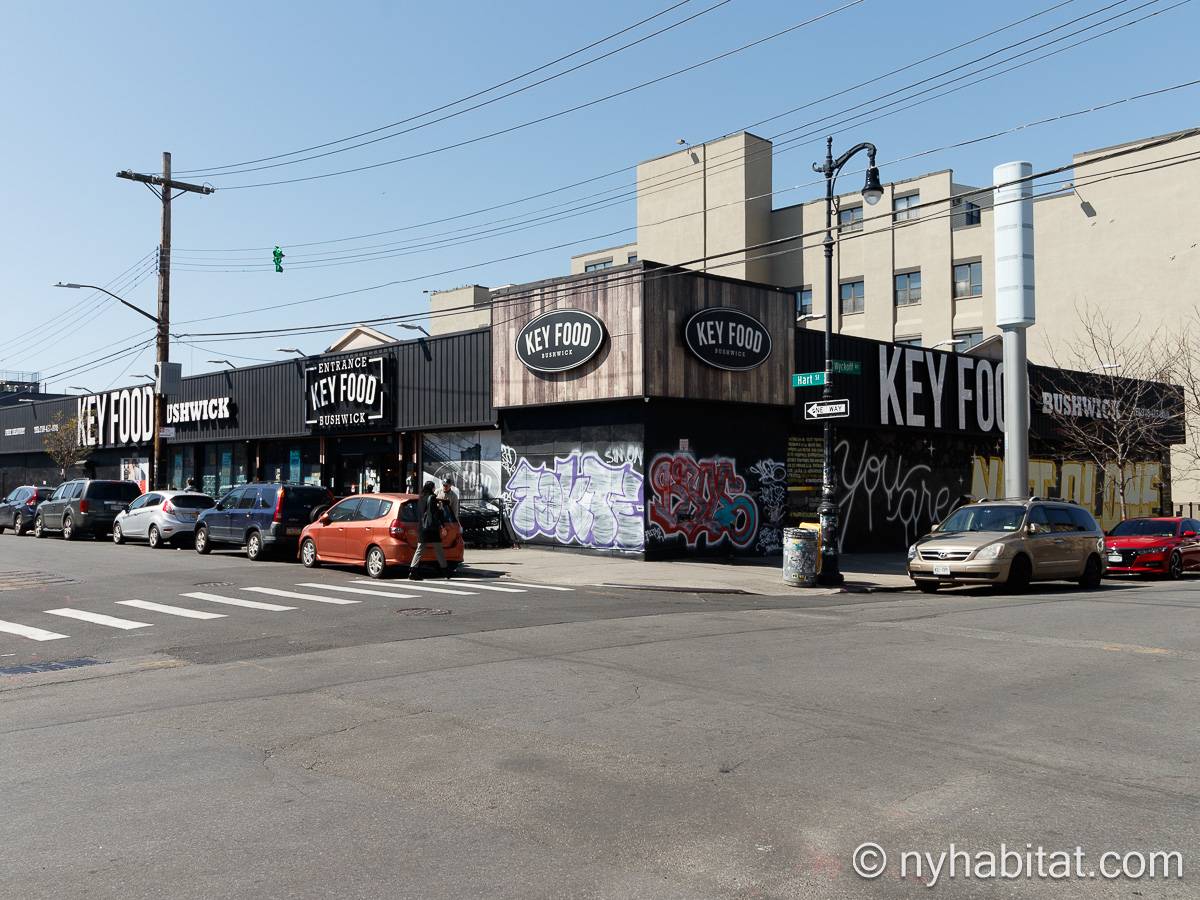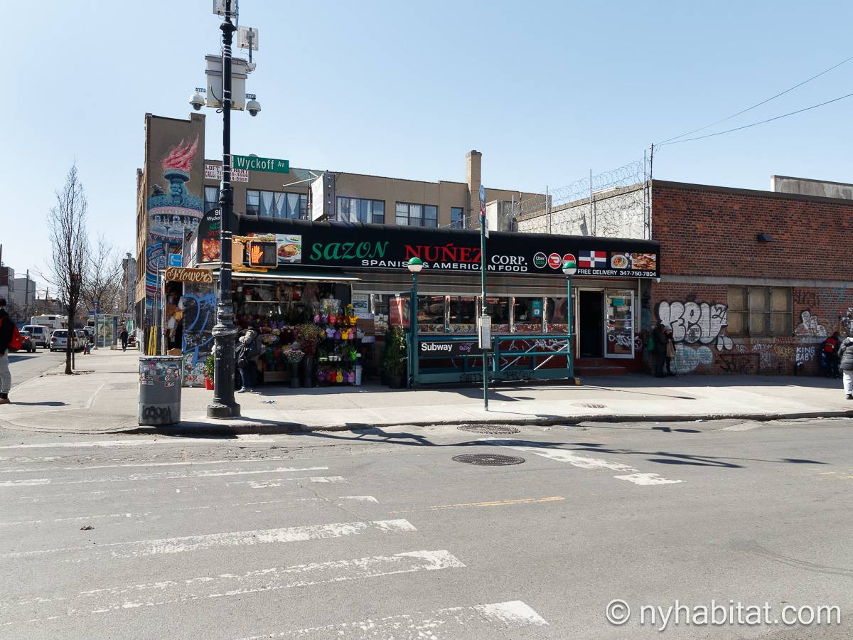 Questo appartamento ammobiliato duplex con una camera da letto, un bagno e un bagno di servizio si trova nel quartiere di Bushwick, a Brooklyn. L’appartamento ha una superficie di circa 53 m² ed è vicino all’angolo tra Hart Street e St Nicholas Avenue. Si trova tra il primo piano (corrispondente al piano terra europeo) e il piano seminterrato* di una villetta a schiera. Al suo interno troverete lavatrice, asciugatrice, soffitti alti e illuminazione ad incasso.