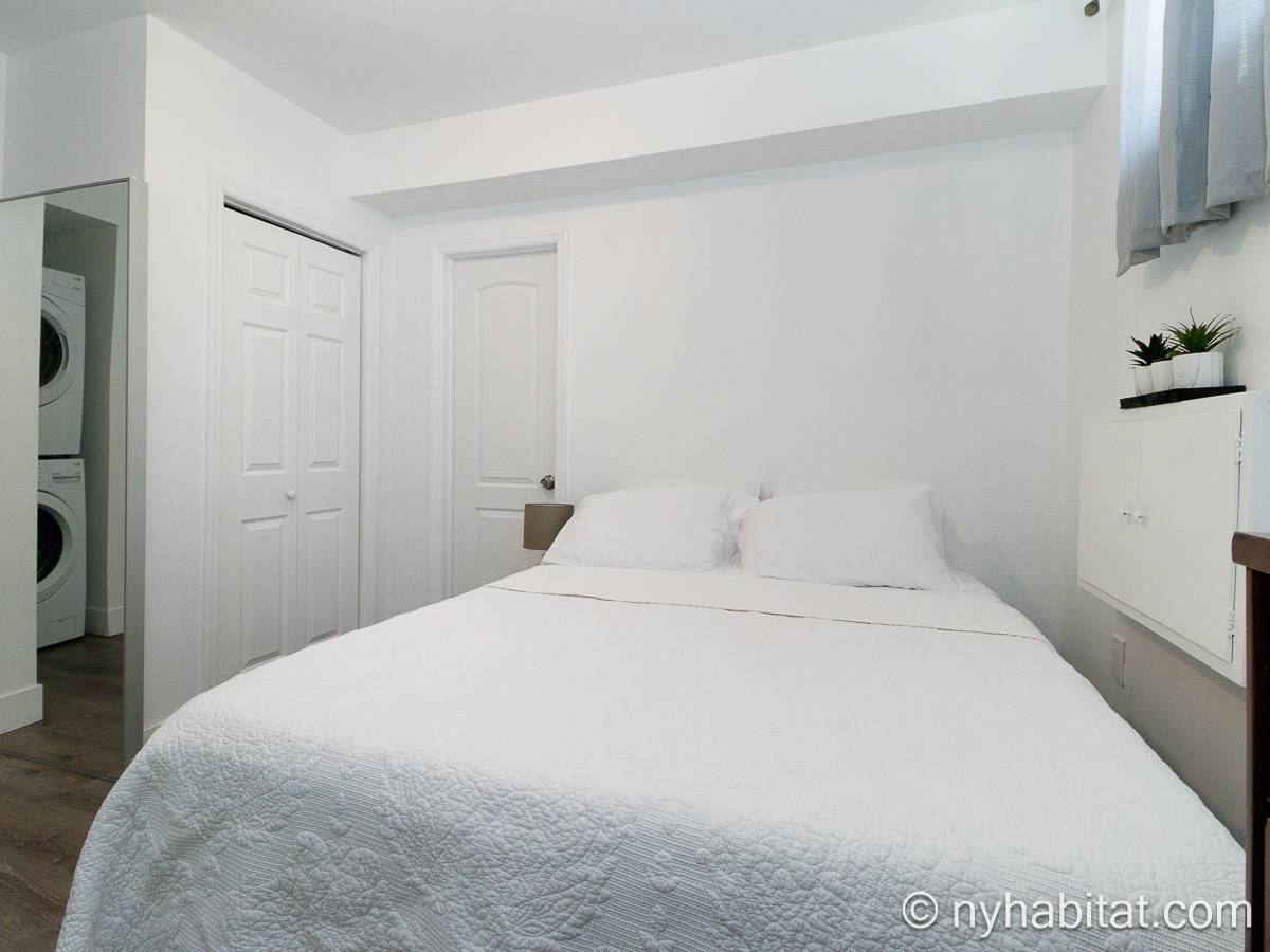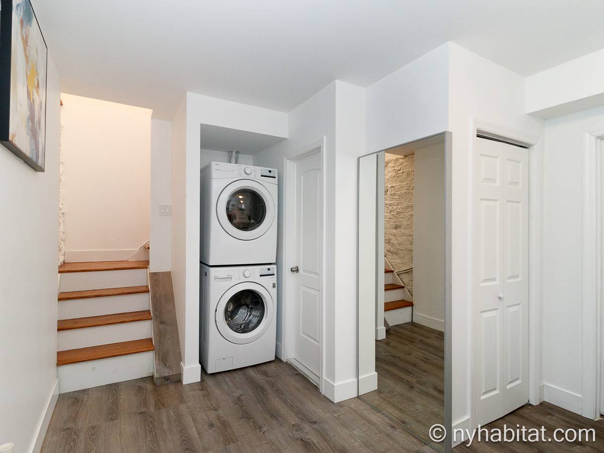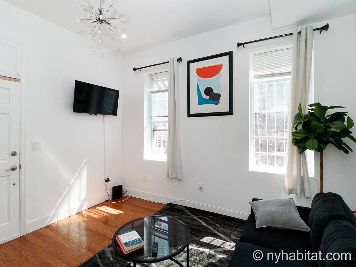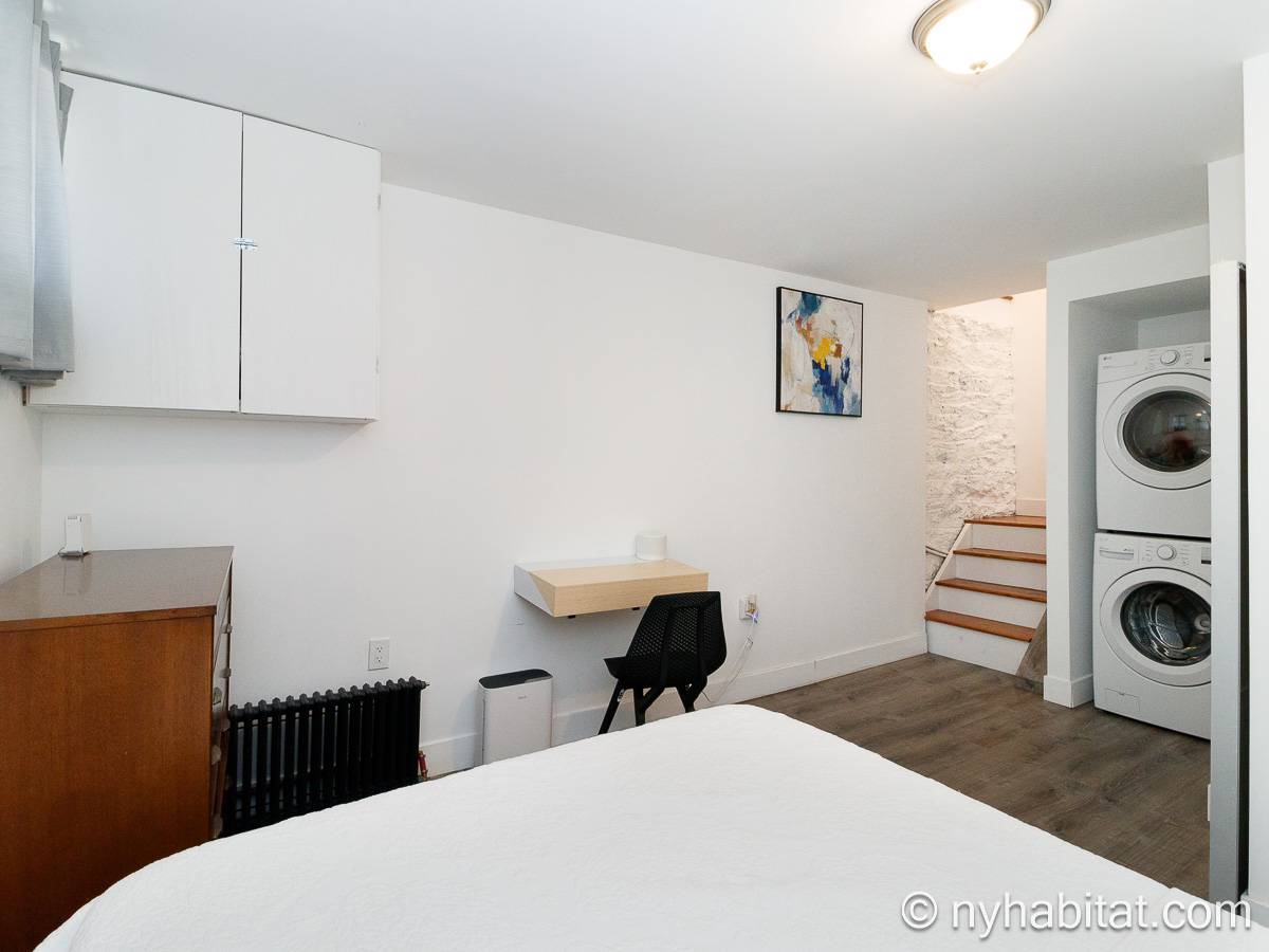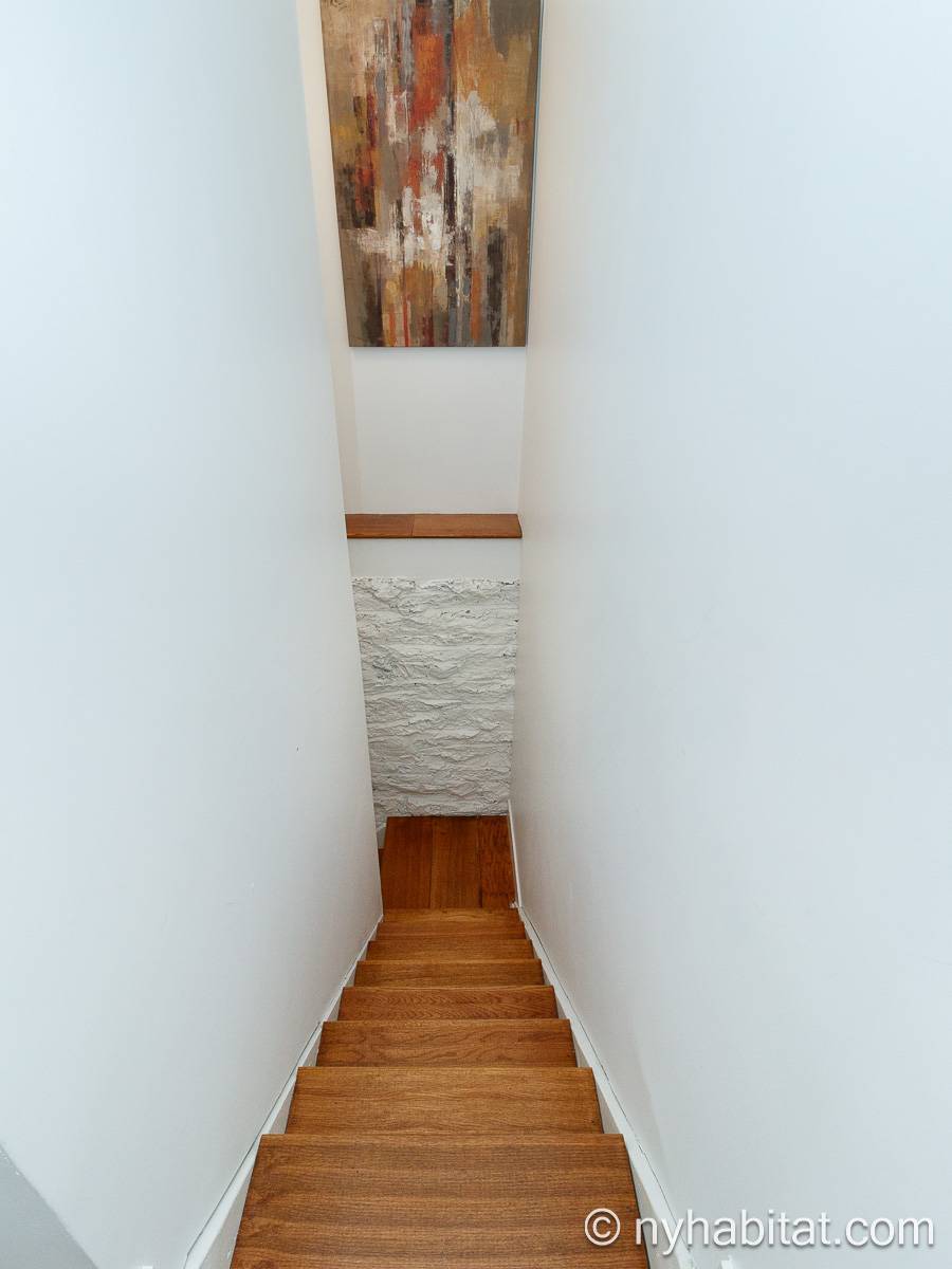 Questo appartamento ammobiliato duplex con una camera da letto, un bagno e un bagno di servizio si trova nel quartiere di Bushwick, a Brooklyn. L’appartamento ha una superficie di circa 53 m² ed è vicino all’angolo tra Hart Street e St Nicholas Avenue. Si trova tra il primo piano (corrispondente al piano terra europeo) e il piano seminterrato* di una villetta a schiera. Al suo interno troverete lavatrice, asciugatrice, soffitti alti e illuminazione ad incasso.