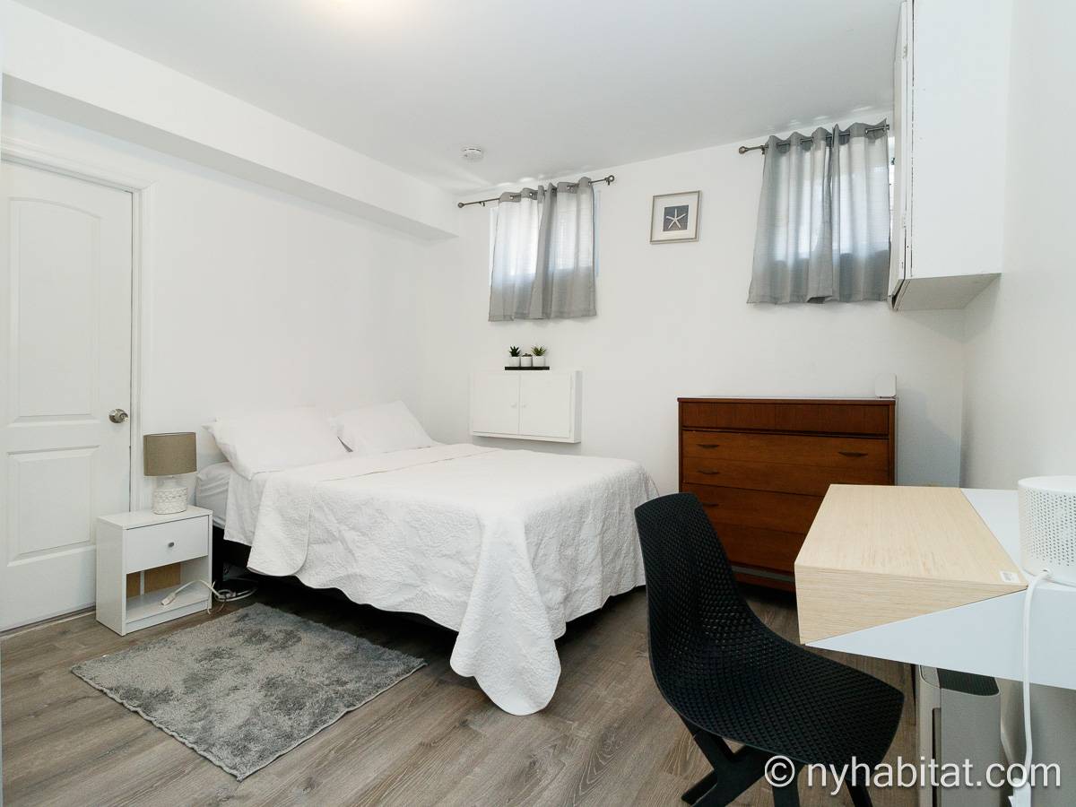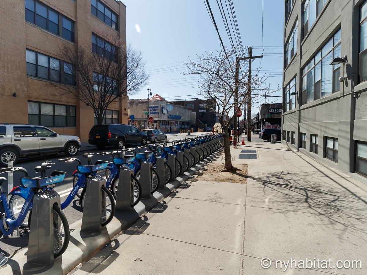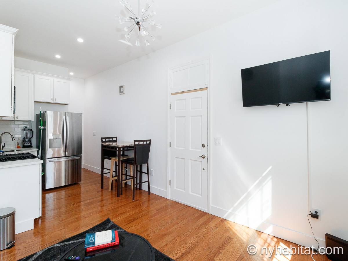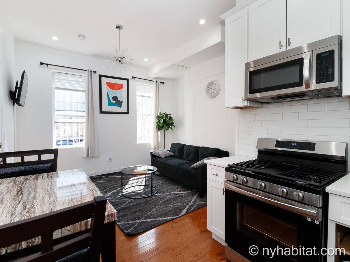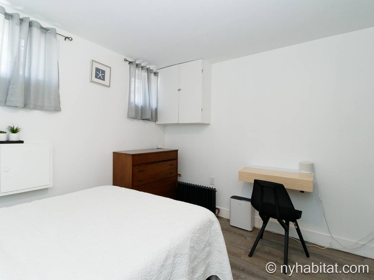 Questo appartamento ammobiliato duplex con una camera da letto, un bagno e un bagno di servizio si trova nel quartiere di Bushwick, a Brooklyn. L’appartamento ha una superficie di circa 53 m² ed è vicino all’angolo tra Hart Street e St Nicholas Avenue. Si trova tra il primo piano (corrispondente al piano terra europeo) e il piano seminterrato* di una villetta a schiera. Al suo interno troverete lavatrice, asciugatrice, soffitti alti e illuminazione ad incasso.