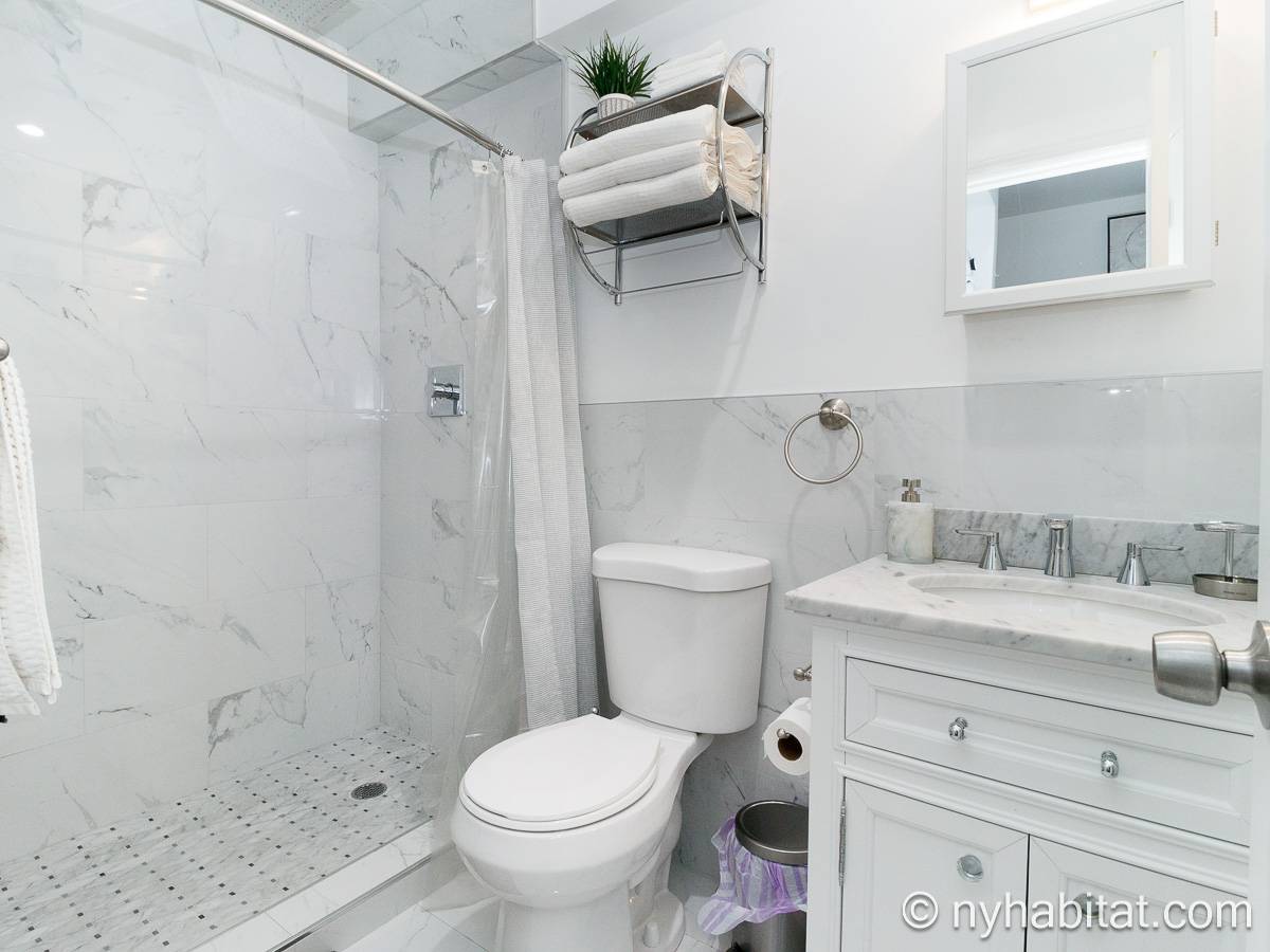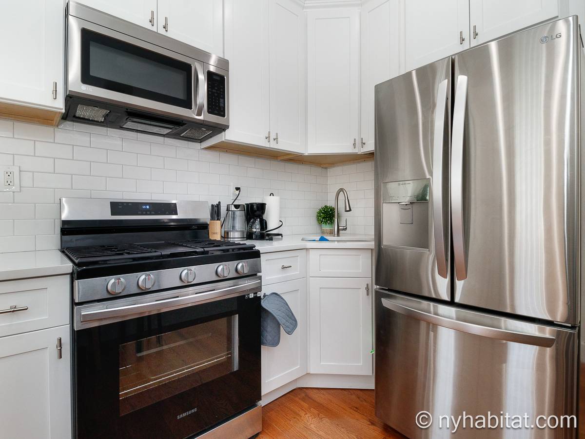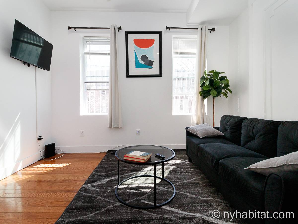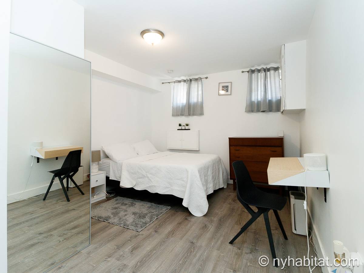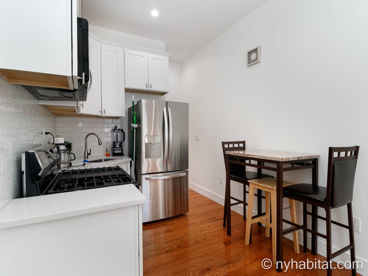 Questo appartamento ammobiliato duplex con una camera da letto, un bagno e un bagno di servizio si trova nel quartiere di Bushwick, a Brooklyn. L’appartamento ha una superficie di circa 53 m² ed è vicino all’angolo tra Hart Street e St Nicholas Avenue. Si trova tra il primo piano (corrispondente al piano terra europeo) e il piano seminterrato* di una villetta a schiera. Al suo interno troverete lavatrice, asciugatrice, soffitti alti e illuminazione ad incasso.