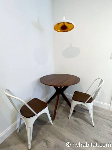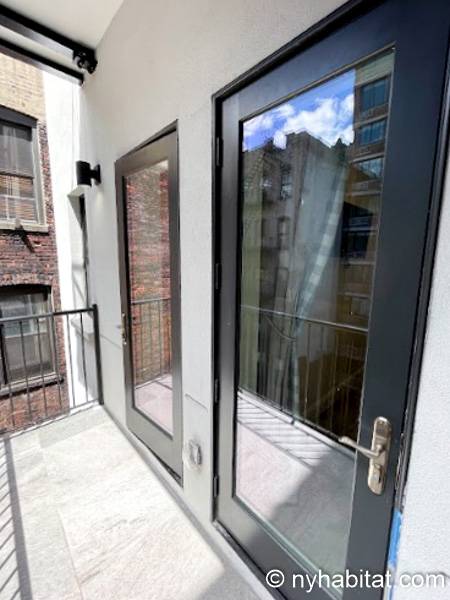 Questo appartamento ammobiliato a Manhattan si trova al quinto piano (equivalente al quarto piano europeo) vicino all'angolo tra East 15th Street e 1st Avenue. L'appartamento è composto da soggiorno e cucina. Il soggiorno dispone di un tavolo da pranzo, mentre la cucina è dotata di frigorifero, freezer, microonde in acciaio inossidabile e tostapane. In entrambe le camere da letto sono presenti letti matrimoniali. Il bagno è provvisto di doccia. Inoltre, questo appartamento comprende una lavanderia e un balcone, mentre l'edificio dispone di un ascensore.