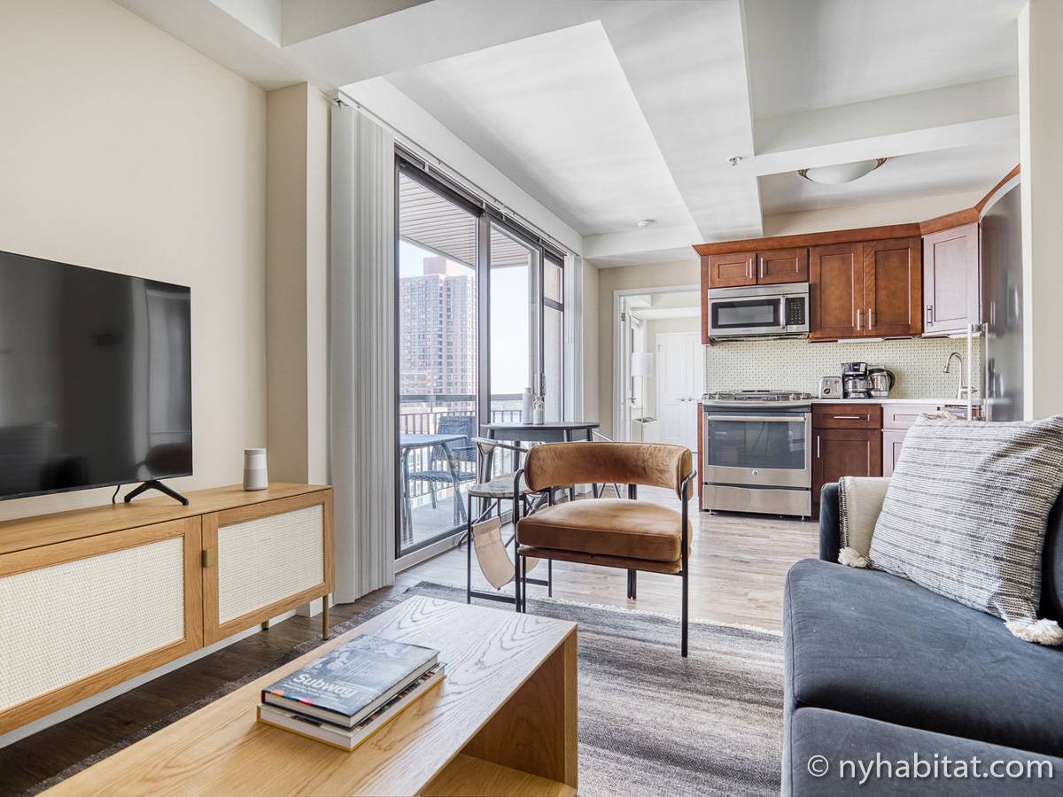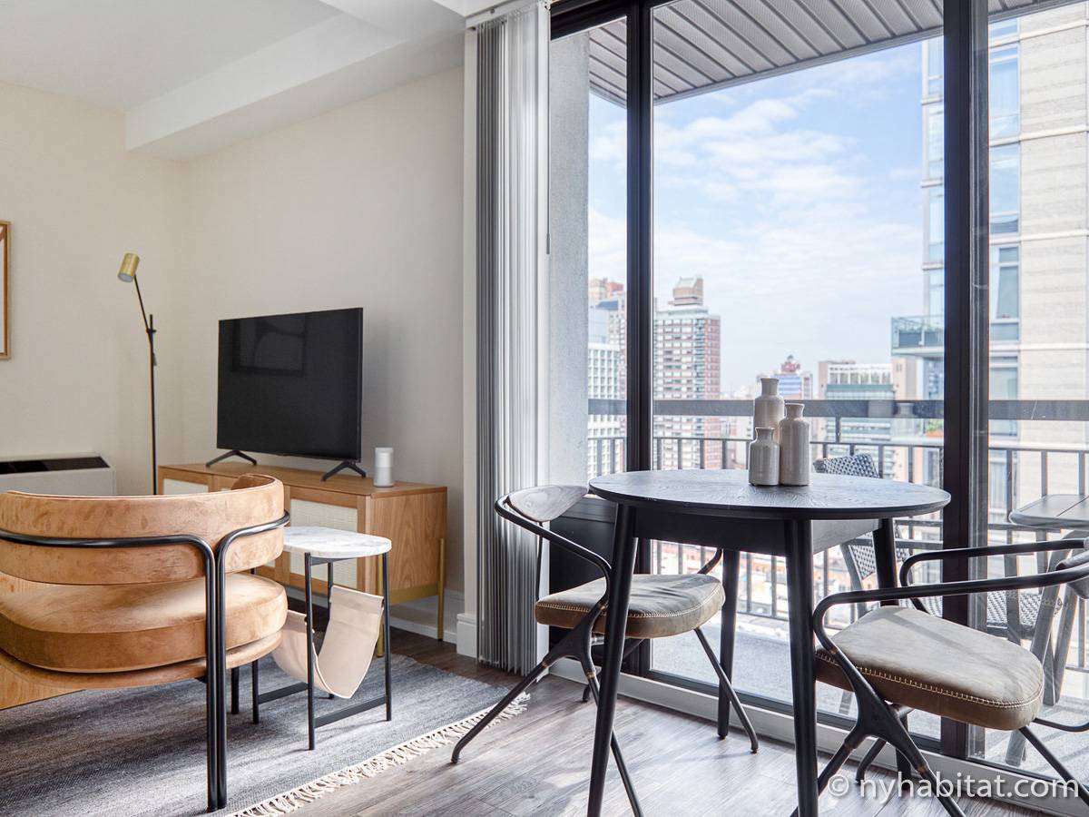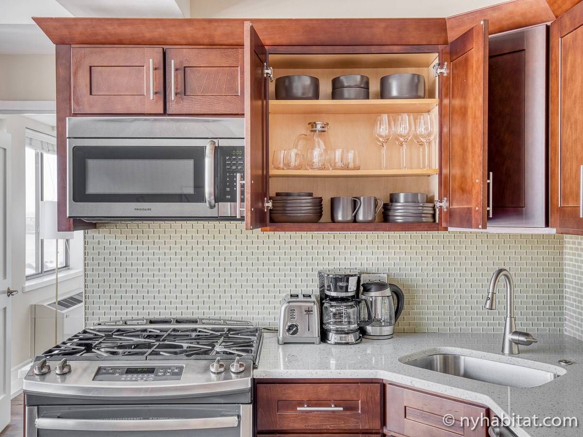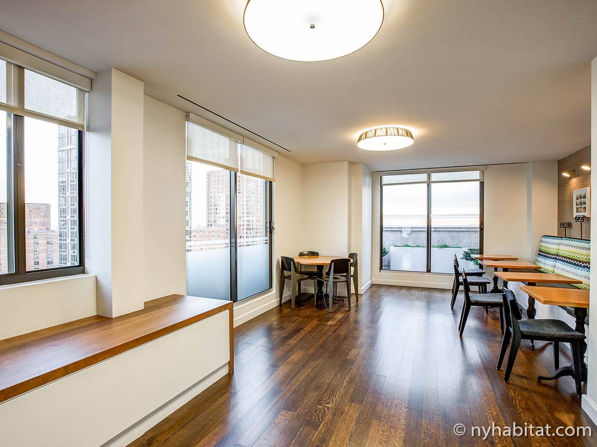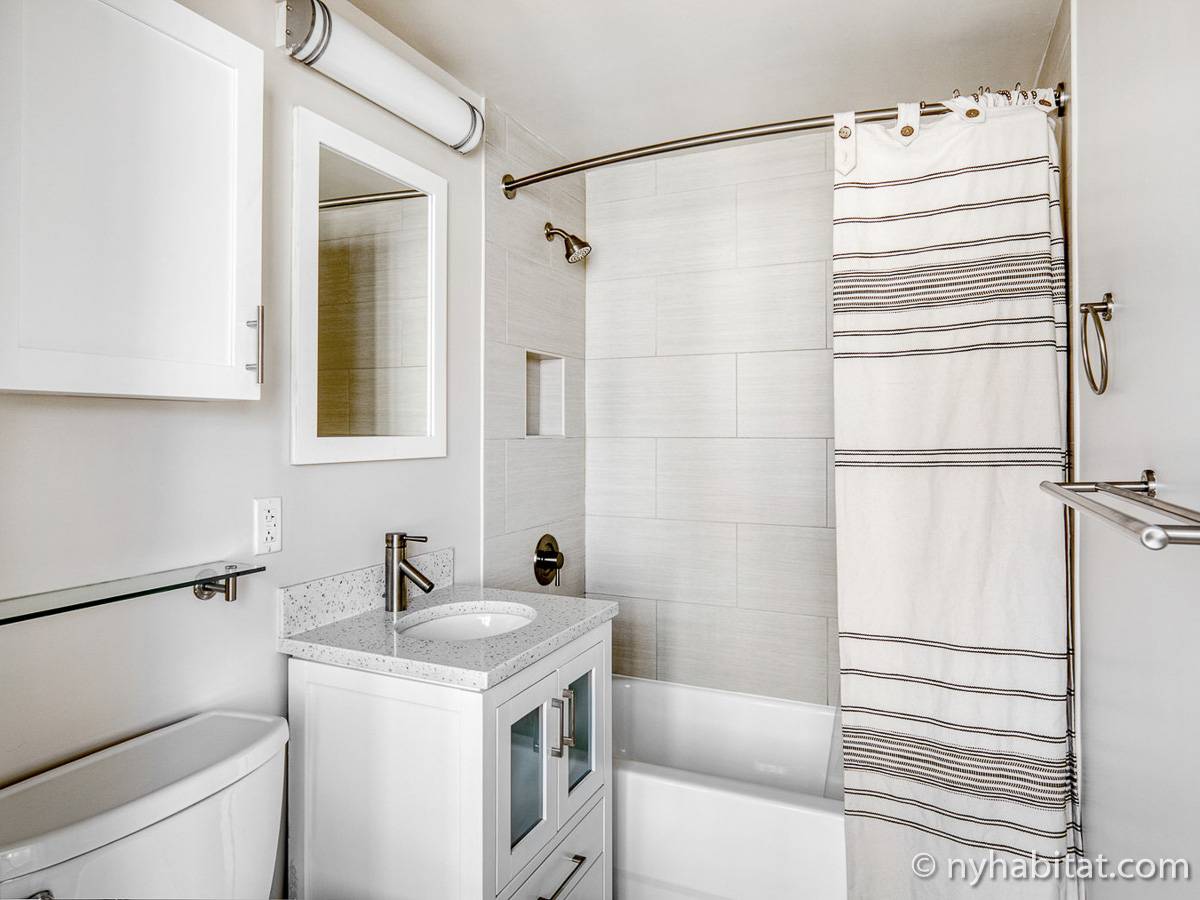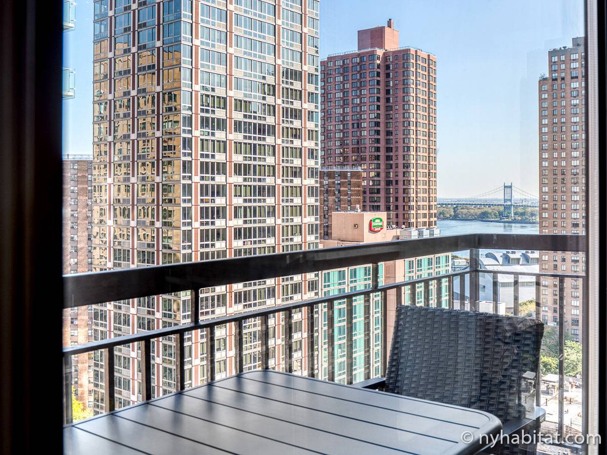 Situato al diciannovesimo piano (equivalente al diciottesimo piano europeo) di un edificio con portineria, questo appartamento ammobiliato di circa 60 m2 si trova vicino all'angolo tra East 91st Street e 1st Avenue. Il grattacielo dispone di lavanderia, palestra e ascensore. Nell'appartamento, il soggiorno comprende divano, televisione, tavolo da pranzo, armadio, aria condizionata e accesso a un balcone che si affaccia sul quartiere. La cucina a vista è dotata di frigorifero, freezer, forno, microonde, lavastoviglie, macchina del caffè e tostapane in acciaio inossidabile, oltre a un'altra area per sedersi. La camera da letto presenta un letto queen size e un armadio. Nel bagno troverete una combinazione di vasca con doccia e un mobile sotto il lavandino.