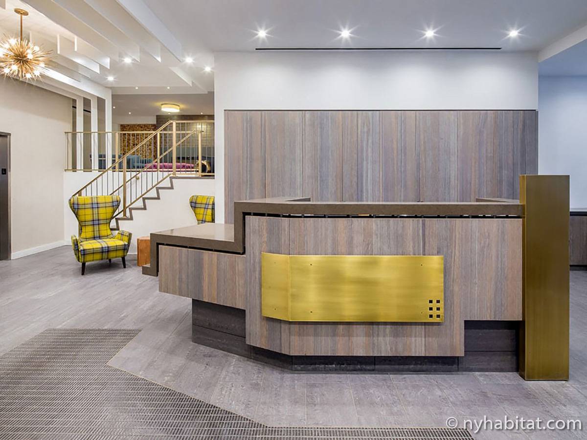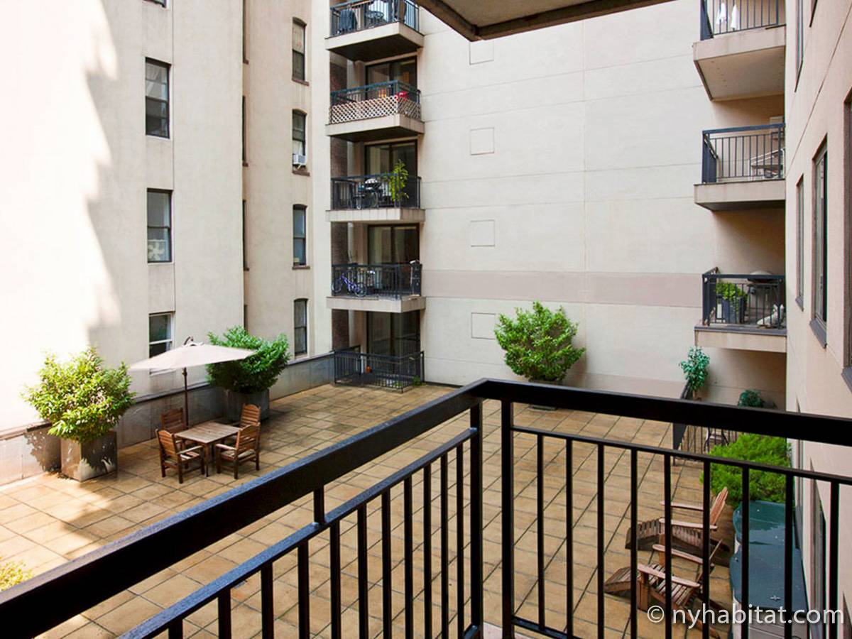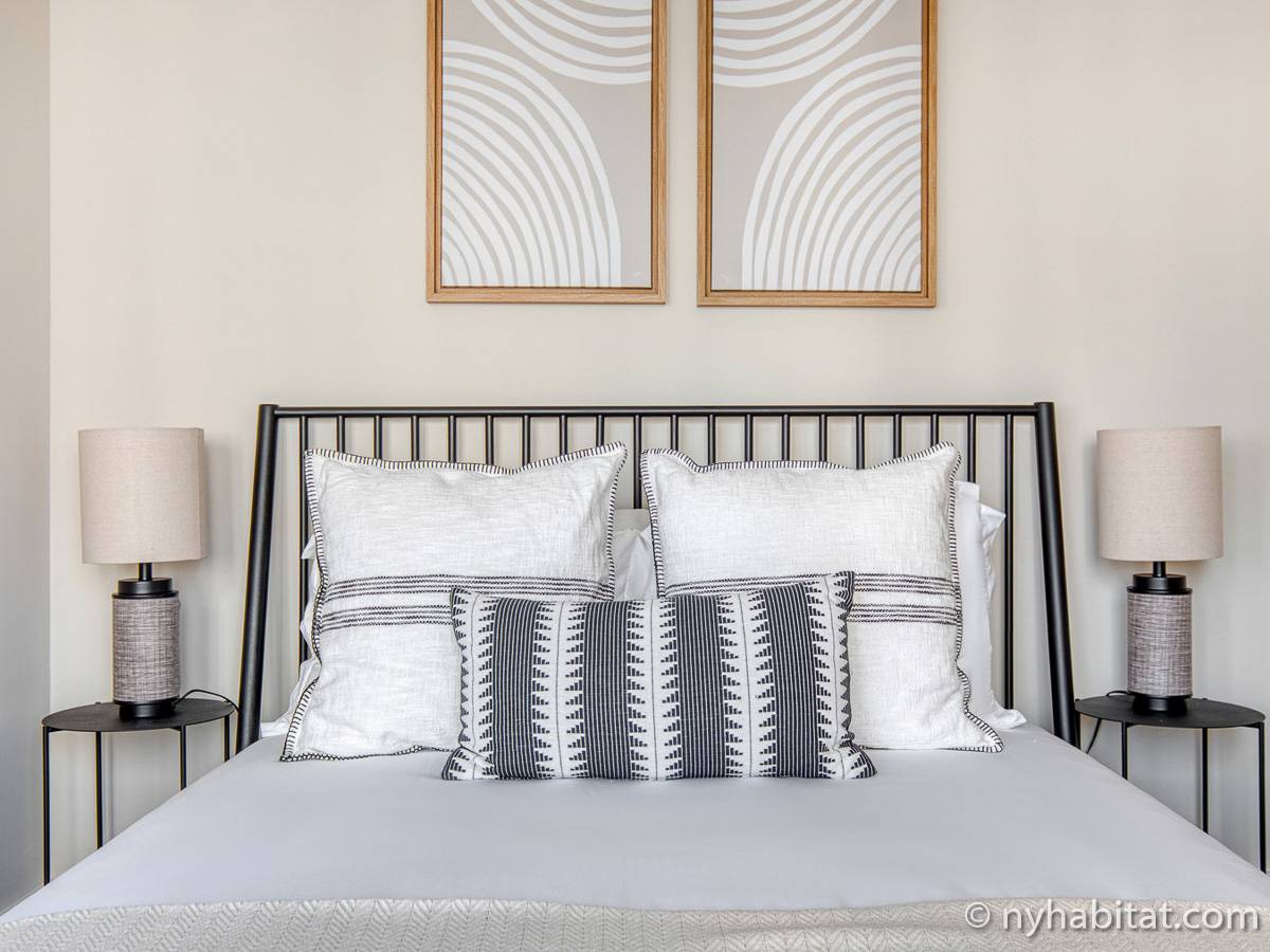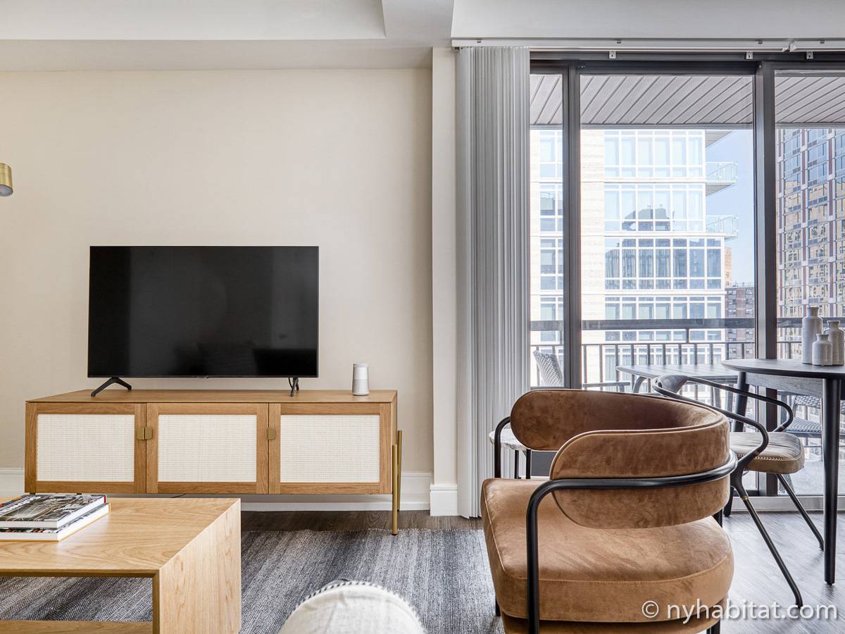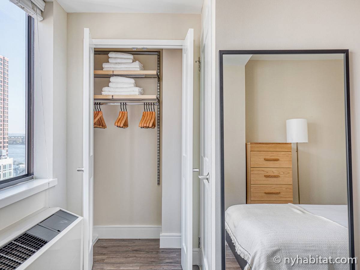 Situato al diciannovesimo piano (equivalente al diciottesimo piano europeo) di un edificio con portineria, questo appartamento ammobiliato di circa 60 m2 si trova vicino all'angolo tra East 91st Street e 1st Avenue. Il grattacielo dispone di lavanderia, palestra e ascensore. Nell'appartamento, il soggiorno comprende divano, televisione, tavolo da pranzo, armadio, aria condizionata e accesso a un balcone che si affaccia sul quartiere. La cucina a vista è dotata di frigorifero, freezer, forno, microonde, lavastoviglie, macchina del caffè e tostapane in acciaio inossidabile, oltre a un'altra area per sedersi. La camera da letto presenta un letto queen size e un armadio. Nel bagno troverete una combinazione di vasca con doccia e un mobile sotto il lavandino.