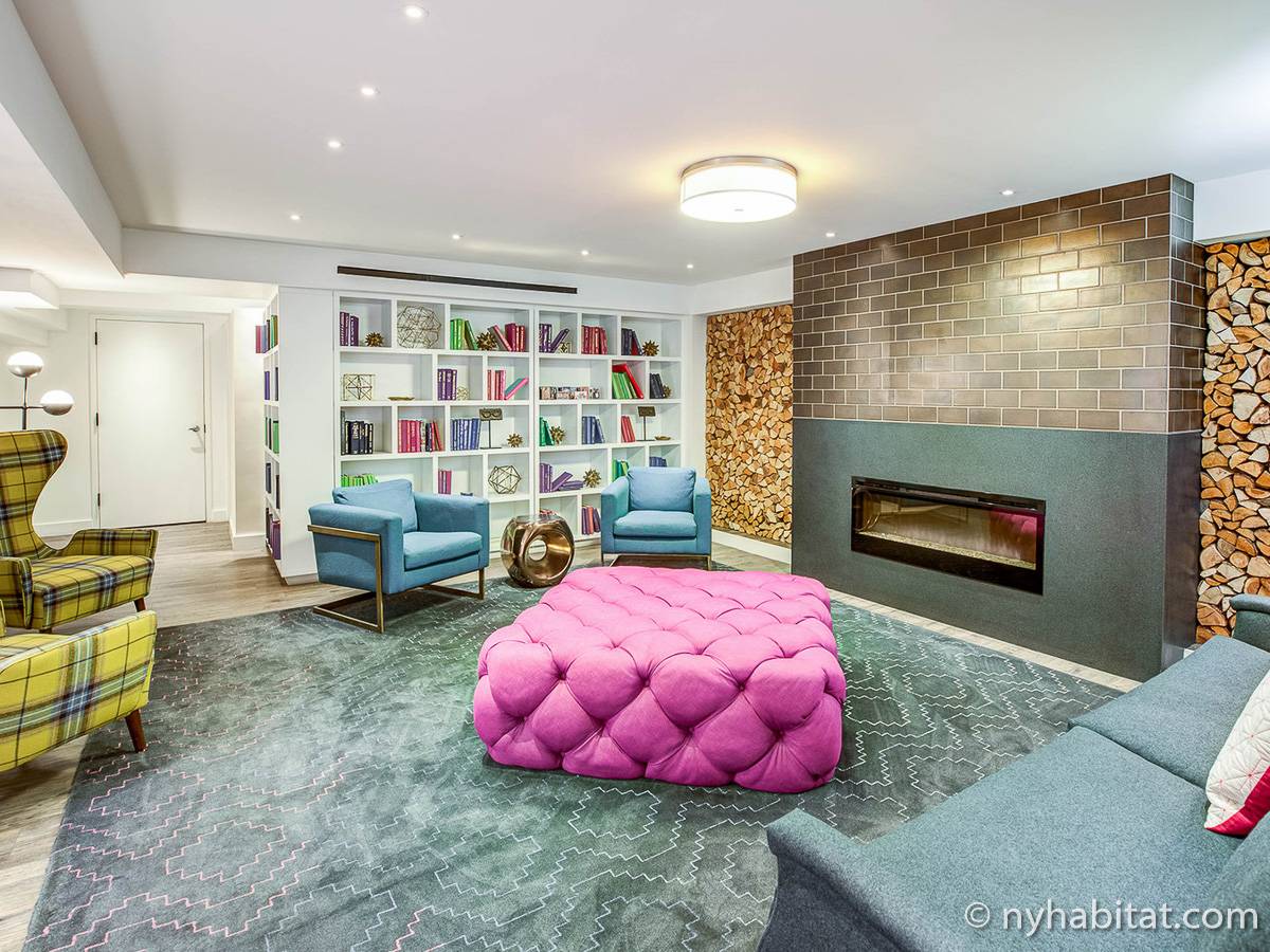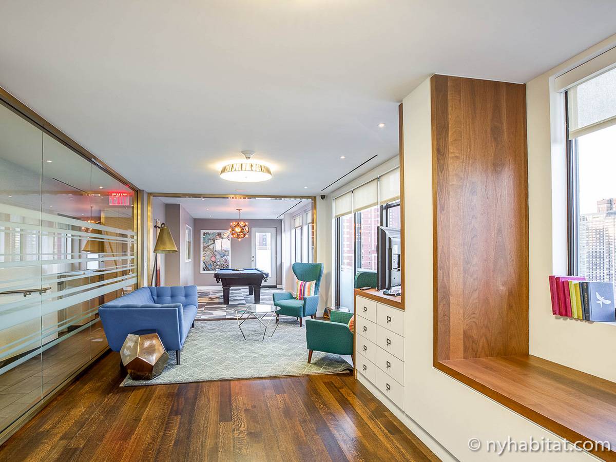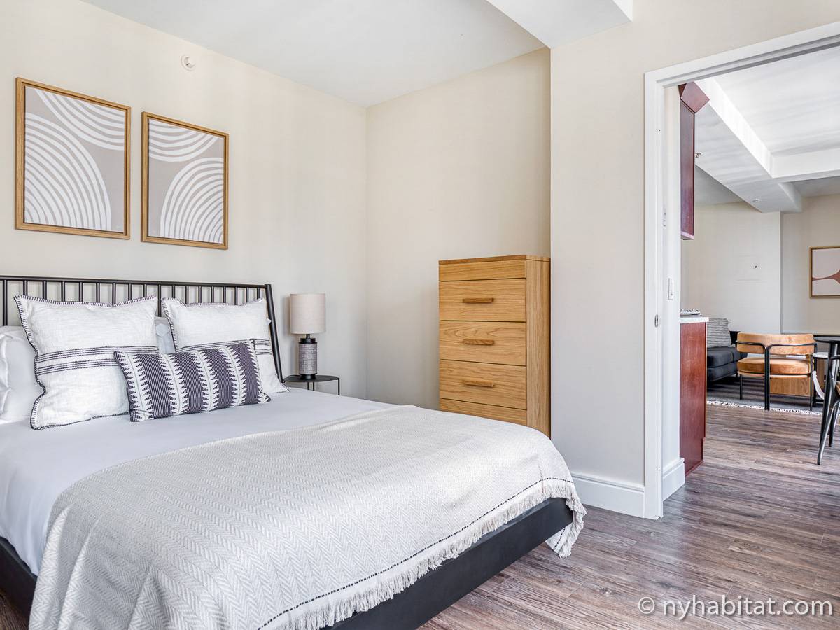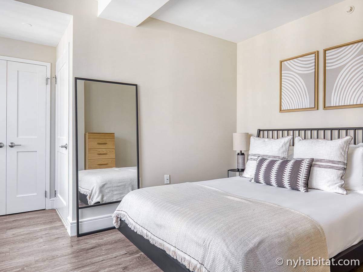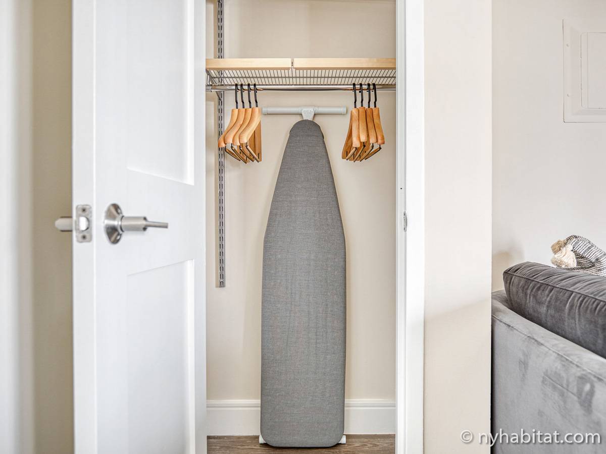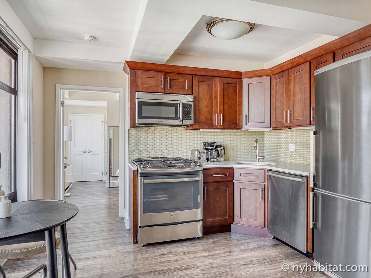 Situato al diciannovesimo piano (equivalente al diciottesimo piano europeo) di un edificio con portineria, questo appartamento ammobiliato di circa 60 m2 si trova vicino all'angolo tra East 91st Street e 1st Avenue. Il grattacielo dispone di lavanderia, palestra e ascensore. Nell'appartamento, il soggiorno comprende divano, televisione, tavolo da pranzo, armadio, aria condizionata e accesso a un balcone che si affaccia sul quartiere. La cucina a vista è dotata di frigorifero, freezer, forno, microonde, lavastoviglie, macchina del caffè e tostapane in acciaio inossidabile, oltre a un'altra area per sedersi. La camera da letto presenta un letto queen size e un armadio. Nel bagno troverete una combinazione di vasca con doccia e un mobile sotto il lavandino.