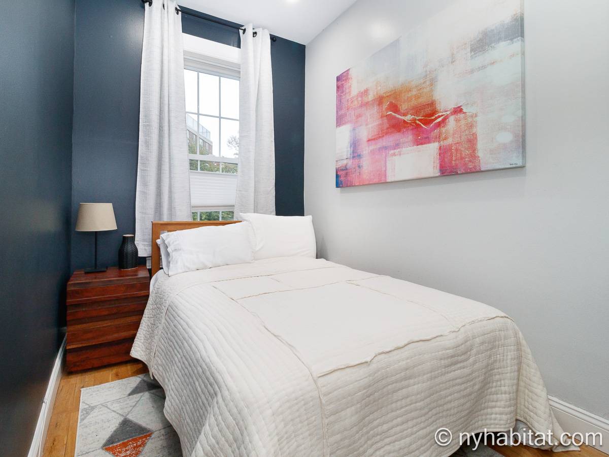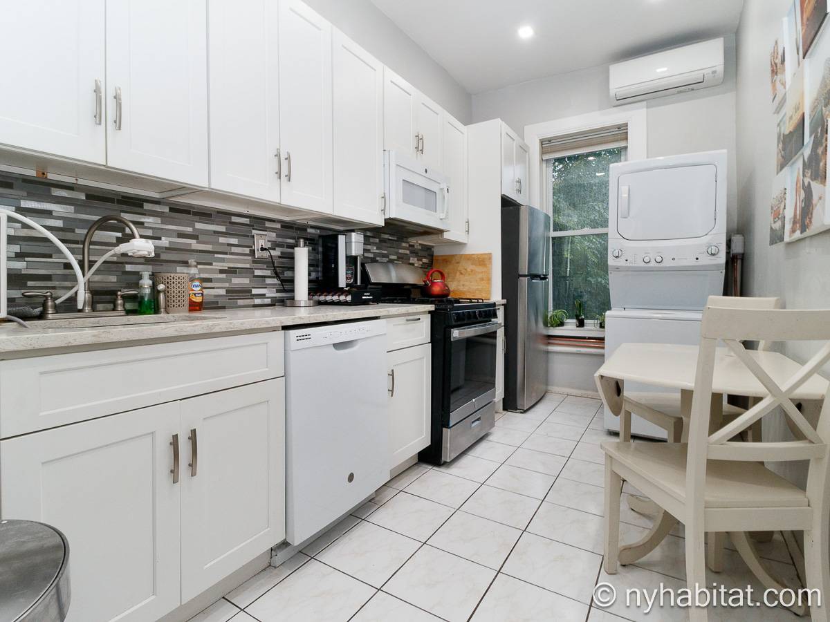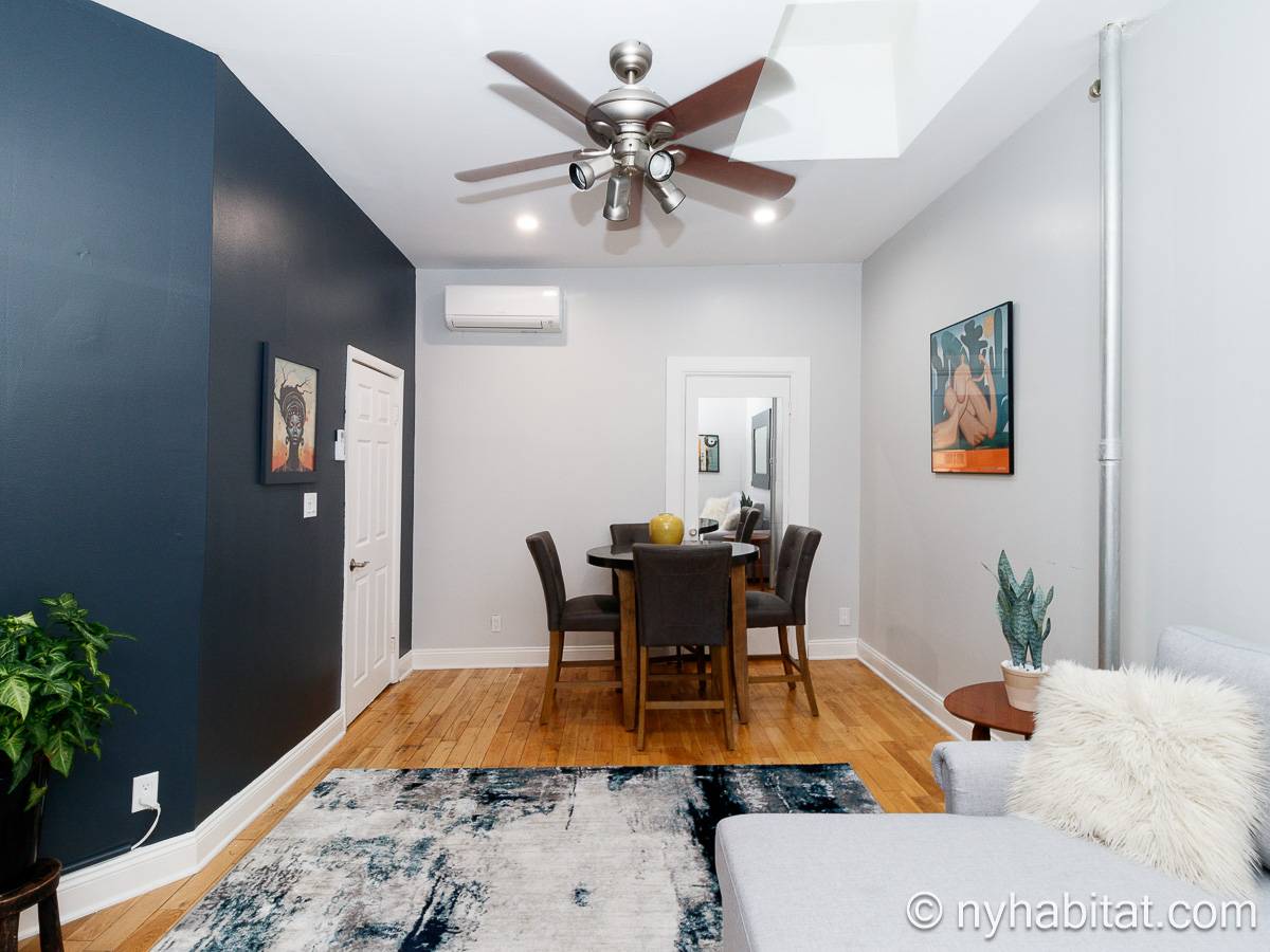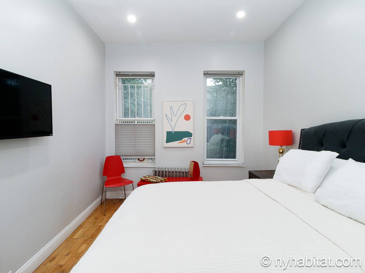 L’appartamento ammobiliato ha una superficie di 93 m2 e si trova all’ultimo piano di una villetta a schiera di tre piani, situata vicino all’angolo tra Bergen Street e Ralph Avenue. Nel soggiorno troverete aria condizionata, un tavolo da pranzo, una TV e un divano estraibile che si trasforma in un divano letto matrimoniale. La cucina separata è completa di frigorifero con freezer, microonde, forno, lavastoviglie, tostapane e macchina per il caffè. Le tre camere da letto dispongono tutte di aria condizionata e di una finestra che affaccia sulla strada o sul cortile. La prima e la seconda camera da letto presentano un letto queen size e una TV, mentre nella terza si trova un letto matrimoniale. Il bagno è fornito di vasca con doccia e di armadietti sotto il lavandino. Nell’appartamento troverete anche lavatrice e asciugatrice.