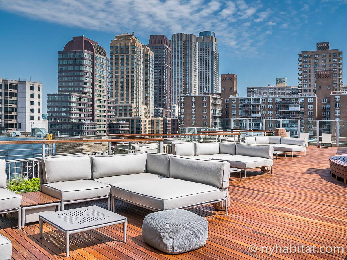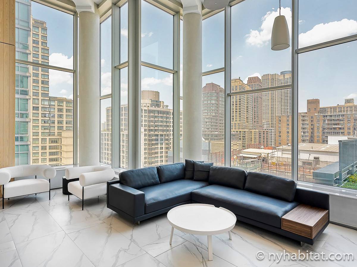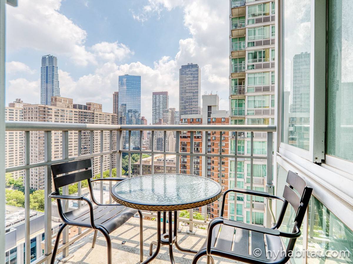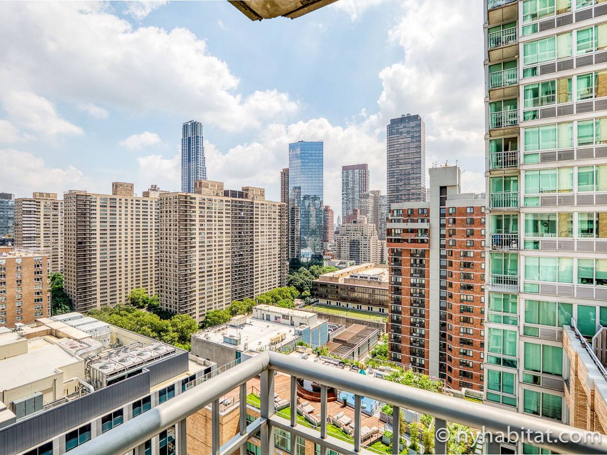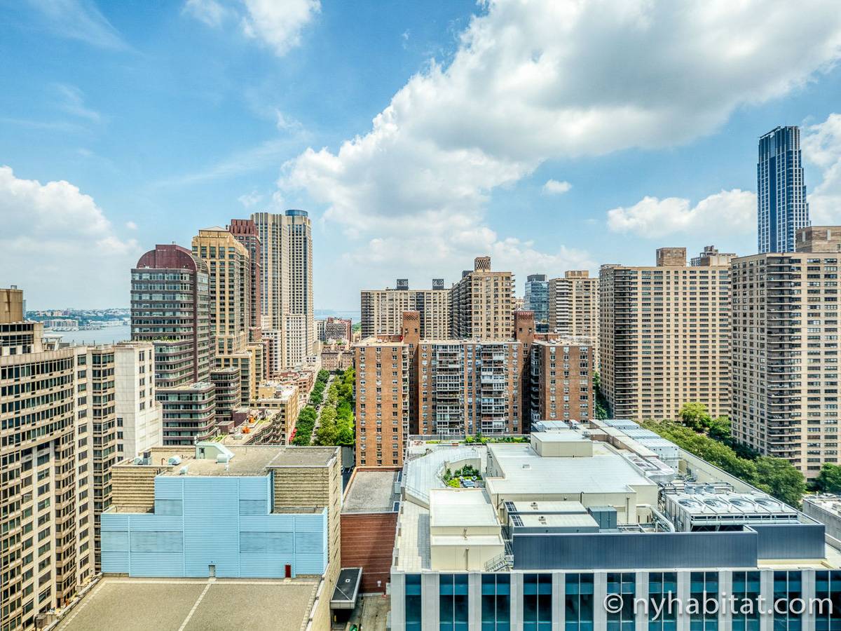 Situato al 23° piano (equivalente al 22° piano in Europa) di un grattacielo di trentacinque piani con portiere, vicino all'incrocio tra West End Avenue e West 64th Street, questo appartamento in affitto ha una superficie di 85 m². L'edificio dispone di un ascensore e una palestra, mentre all’interno dell'appartamento sono presenti aria condizionata, lavatrice, asciugatrice e – per sfruttare l'altezza – un balcone.