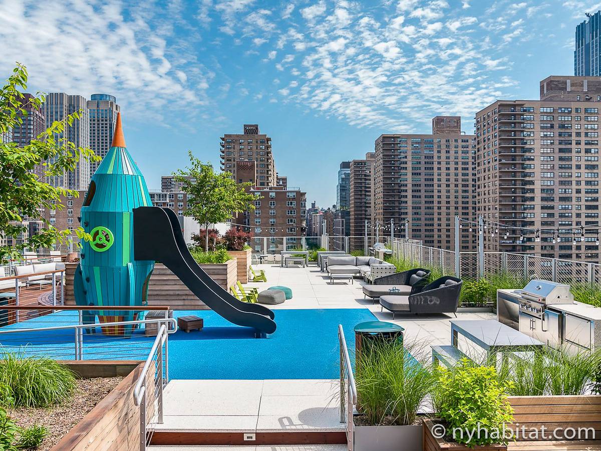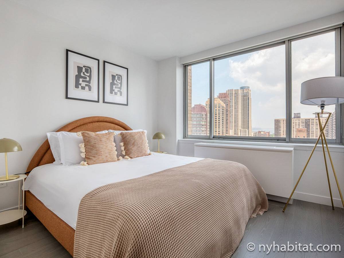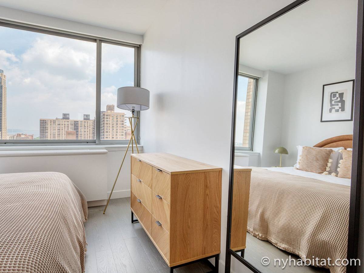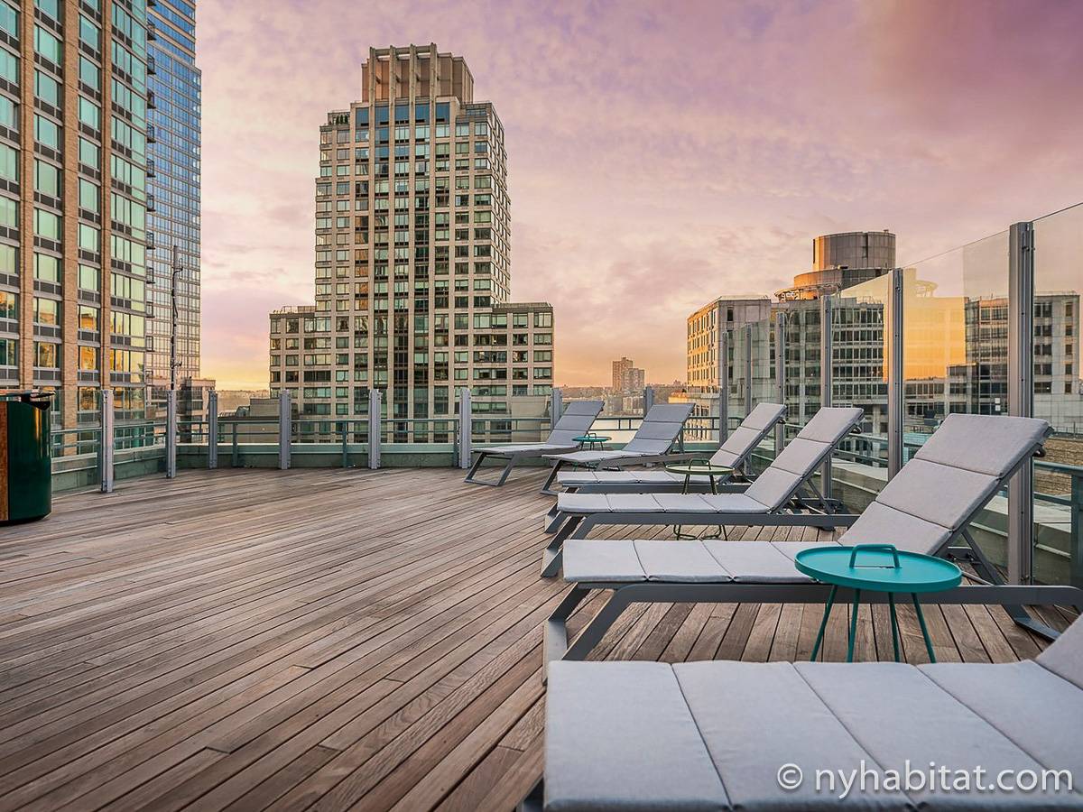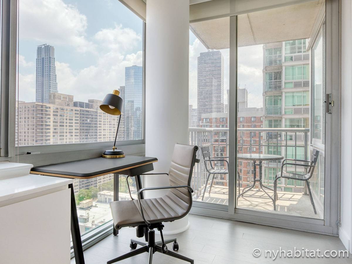 Situato al 23° piano (equivalente al 22° piano in Europa) di un grattacielo di trentacinque piani con portiere, vicino all'incrocio tra West End Avenue e West 64th Street, questo appartamento in affitto ha una superficie di 85 m². L'edificio dispone di un ascensore e una palestra, mentre all’interno dell'appartamento sono presenti aria condizionata, lavatrice, asciugatrice e – per sfruttare l'altezza – un balcone.