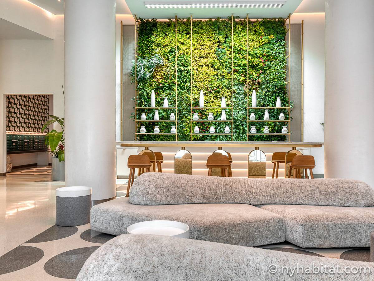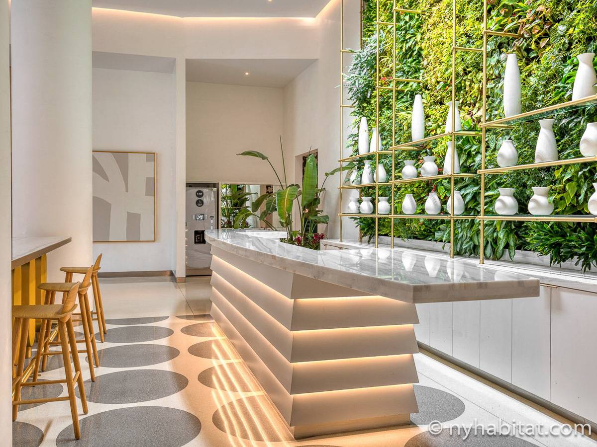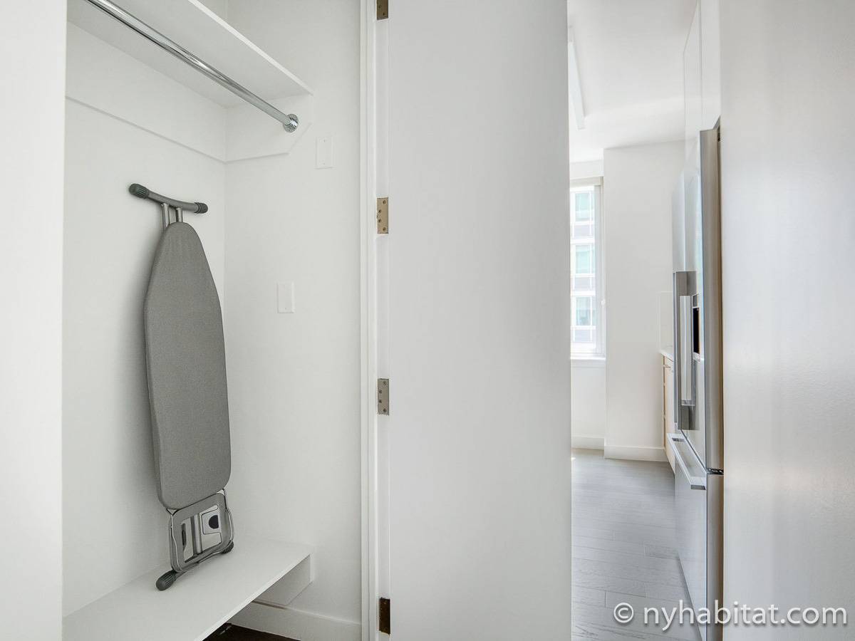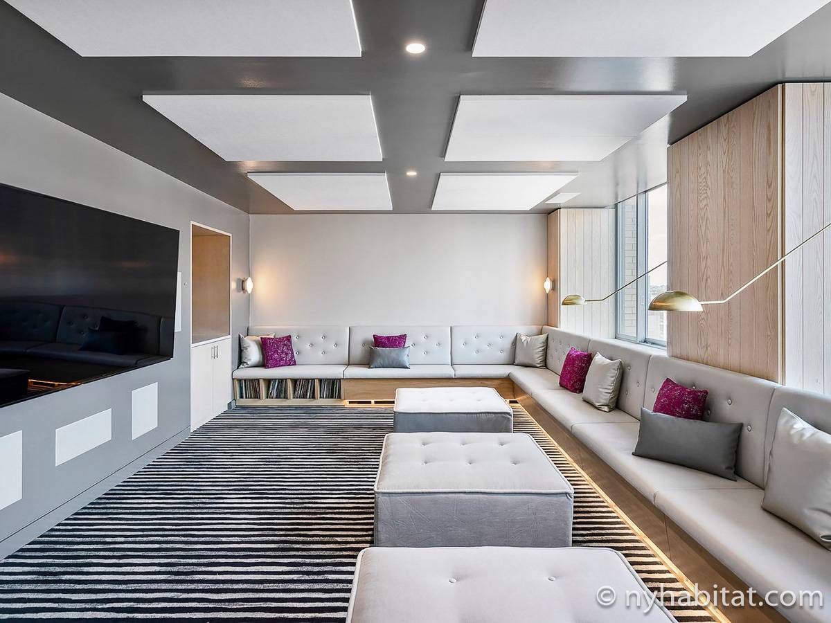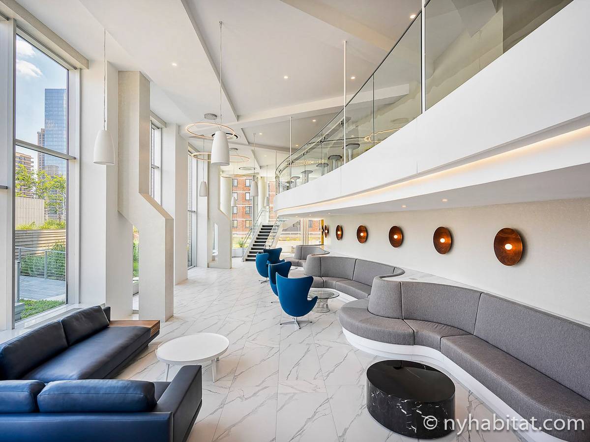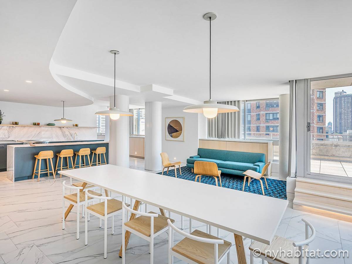 Situato al 23° piano (equivalente al 22° piano in Europa) di un grattacielo di trentacinque piani con portiere, vicino all'incrocio tra West End Avenue e West 64th Street, questo appartamento in affitto ha una superficie di 85 m². L'edificio dispone di un ascensore e una palestra, mentre all’interno dell'appartamento sono presenti aria condizionata, lavatrice, asciugatrice e – per sfruttare l'altezza – un balcone.