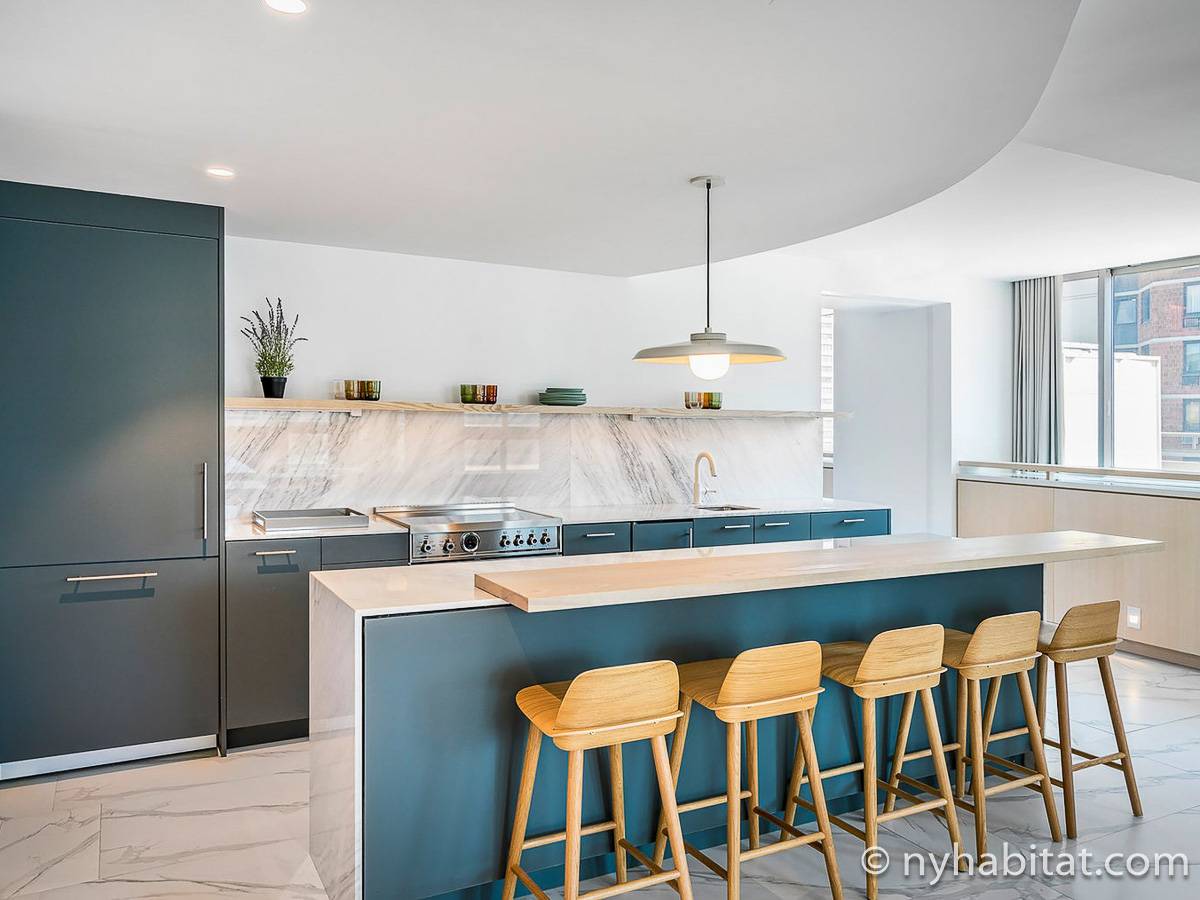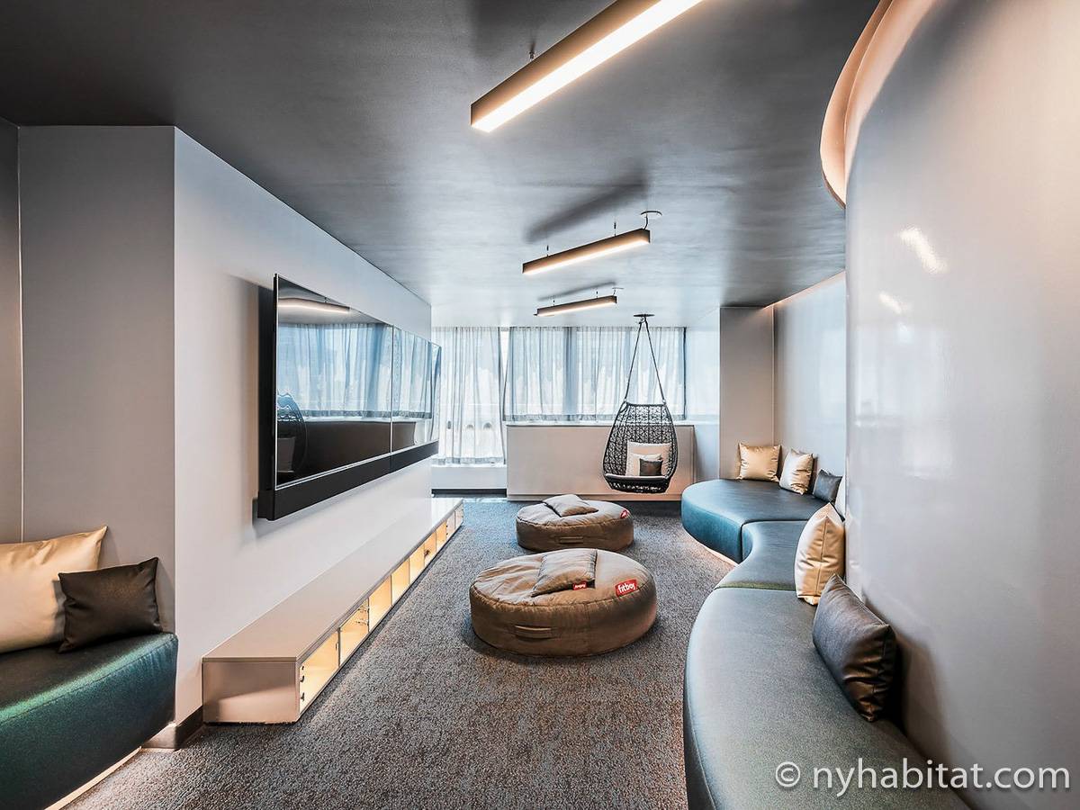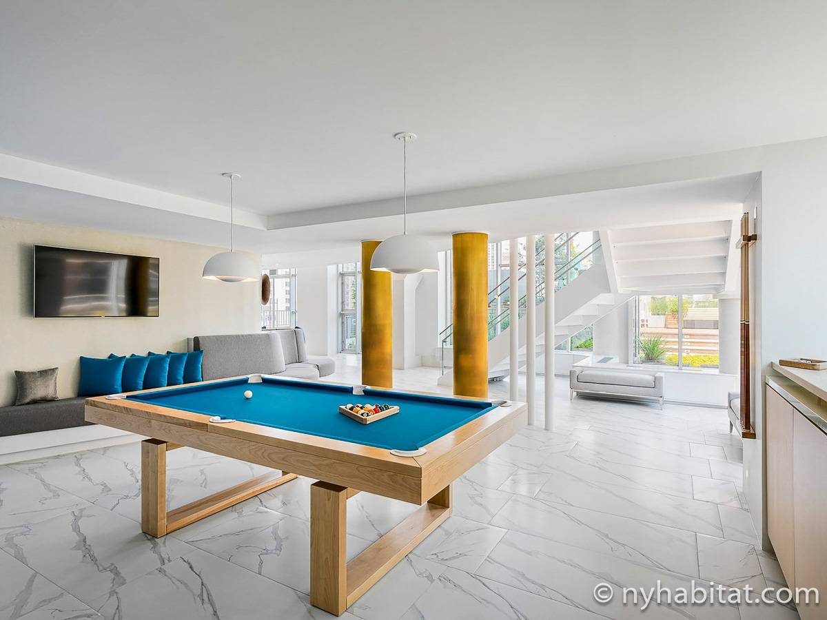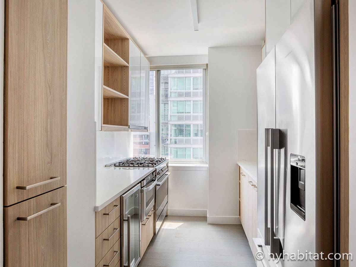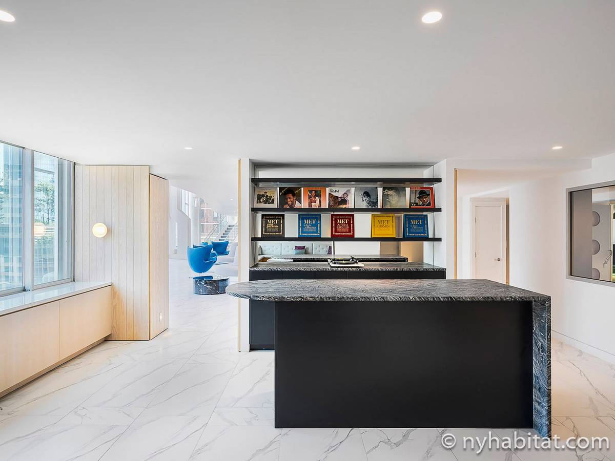 Situato al 23° piano (equivalente al 22° piano in Europa) di un grattacielo di trentacinque piani con portiere, vicino all'incrocio tra West End Avenue e West 64th Street, questo appartamento in affitto ha una superficie di 85 m². L'edificio dispone di un ascensore e una palestra, mentre all’interno dell'appartamento sono presenti aria condizionata, lavatrice, asciugatrice e – per sfruttare l'altezza – un balcone.