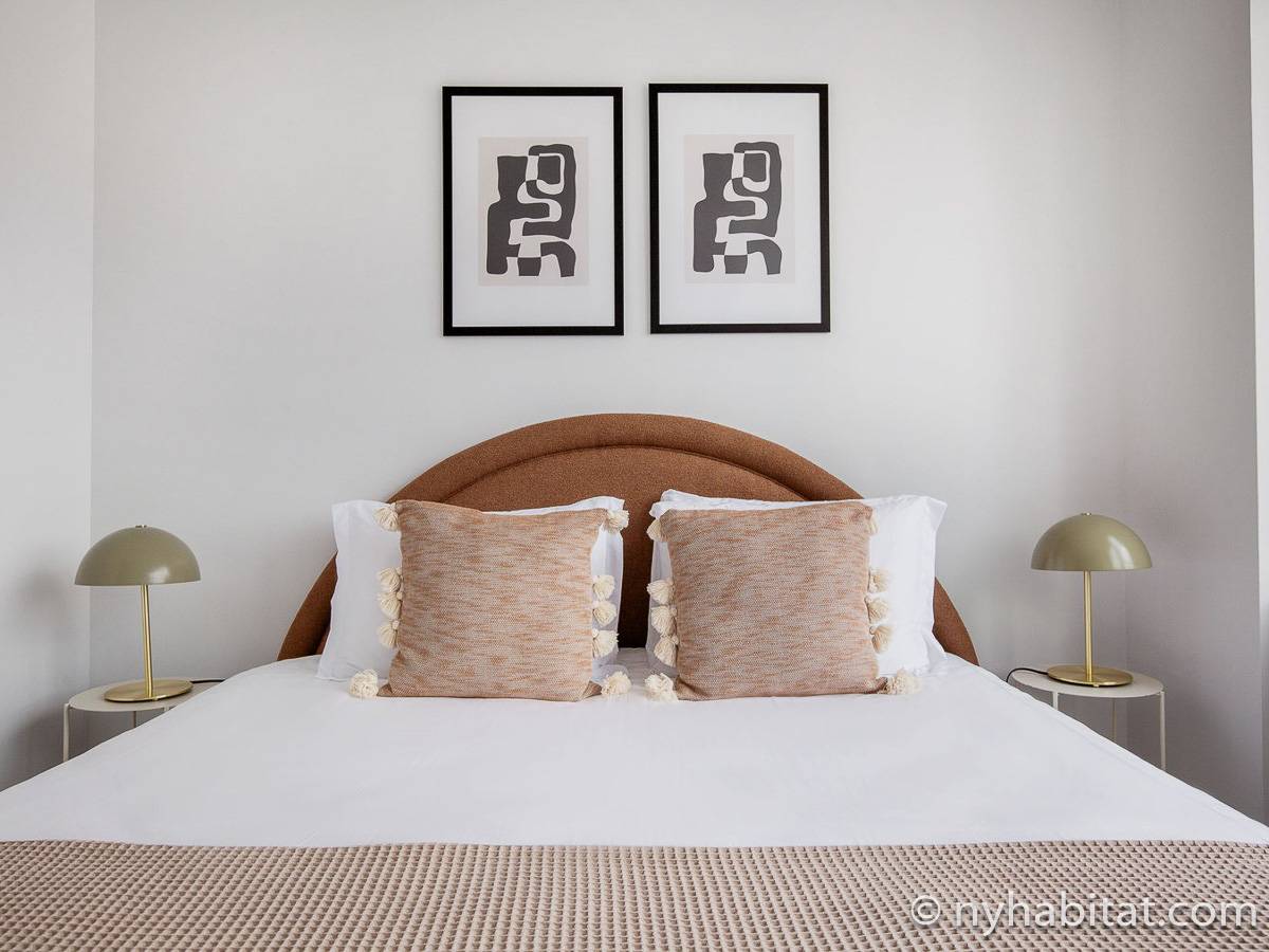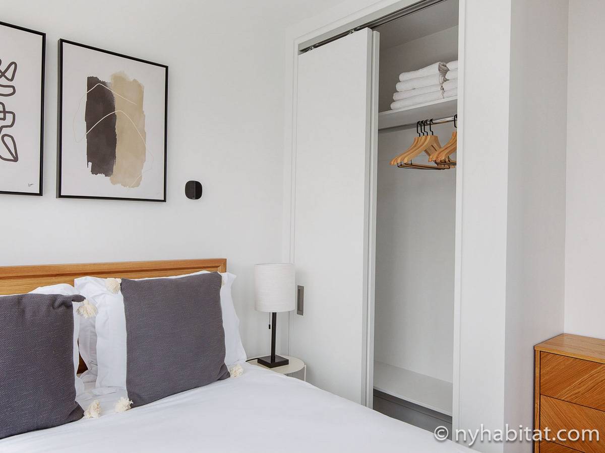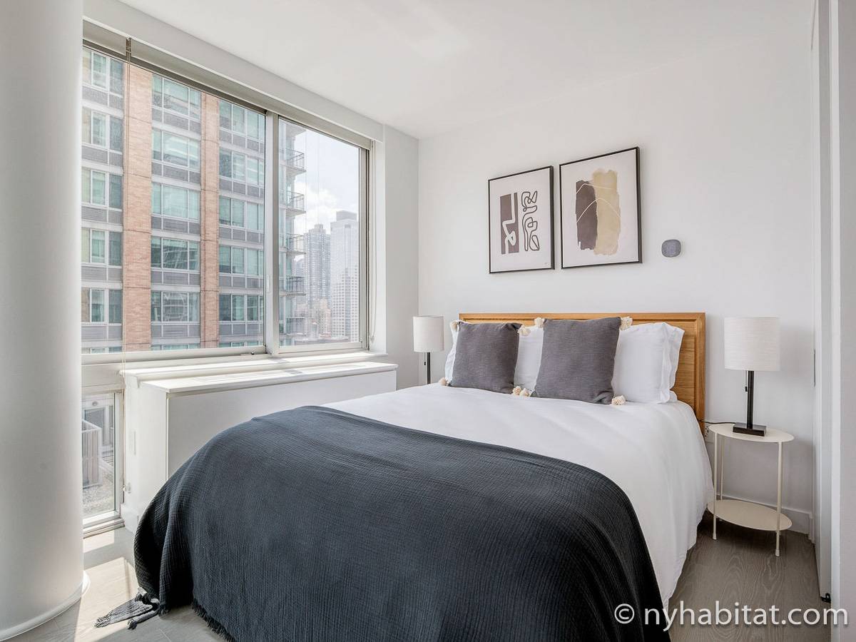Nel soggiorno, una serie di finestre offrono una vista sul panorama metropolitano. Questo soggiorno dispone di di un divano, una TV, una sala da pranzo, una scrivania/spazio da lavoro e accesso al balcone. La luminosa cucina indipendente è dotata di forno, tostapane, macchina da caffè, microonde, frigorifero, congelatore e lavastoviglie. Entrambe le camere da letto hanno un comò e una grande finestra che consente l’accesso alla luce naturale. La prima camera è dotata di un letto king-size e uno specchio a figura intera, mentre la seconda di un letto queen-size. Entrambi i bagni presentano piastrelle in marmo e una doccia, uno dei due ha una vasca da bagno integrata.