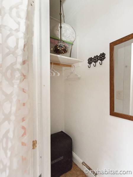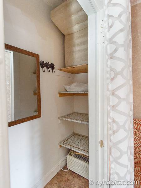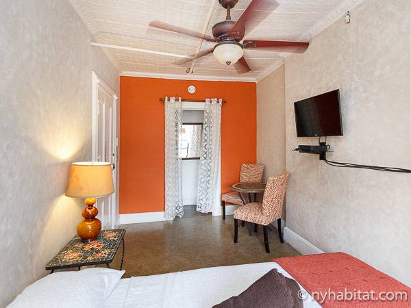 Questa stanza in affitto si trova all’ultimo piano di un brownstone di tre piani senza ascensore che risale al periodo precedente alla guerra. Qui troverete un letto ad una piazza e mezzo con lenzuola pulite e profumate alla lavanda, per garantire un ambiente confortevole. Gli arredi color pesca creano un’atmosfera calorosa e accogliente— con tocchi classici come, ad esempio, il soffitto in stagno pressato. Nel locale troverete anche un piccolo tavolo da pranzo, un comò con televisore e un armadio ad incasso dove potrete riporre i vostri oggetti. Un’ampia finestra con lunghe tende bianche si affaccia sul cortile e permette il ricambio d’aria nella stanza.