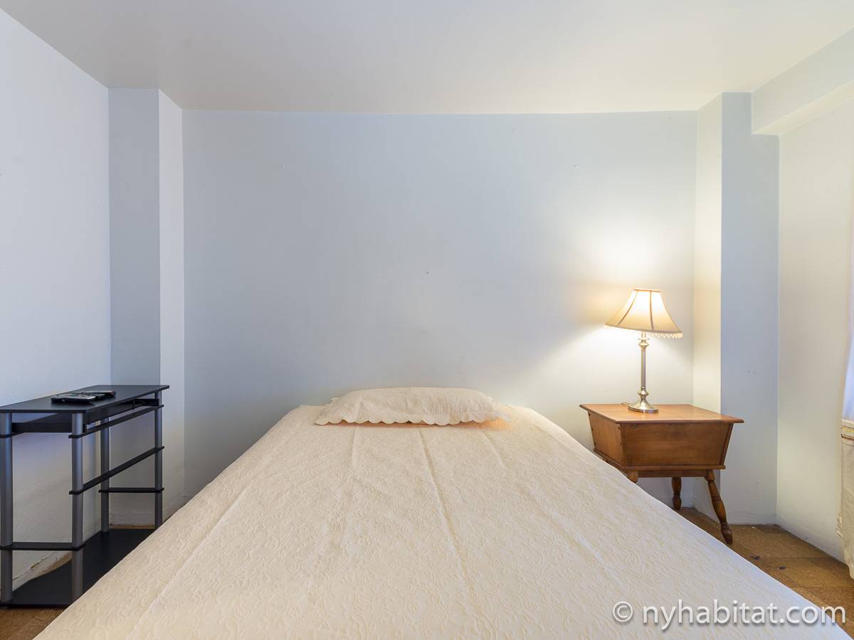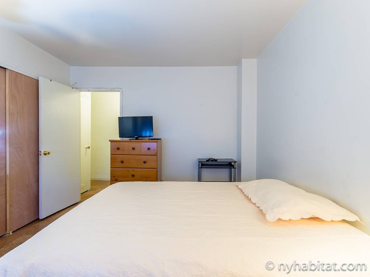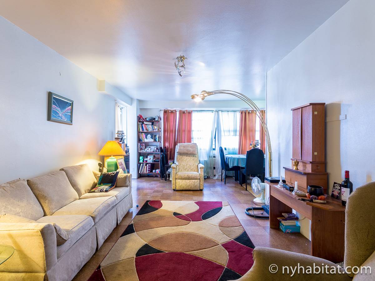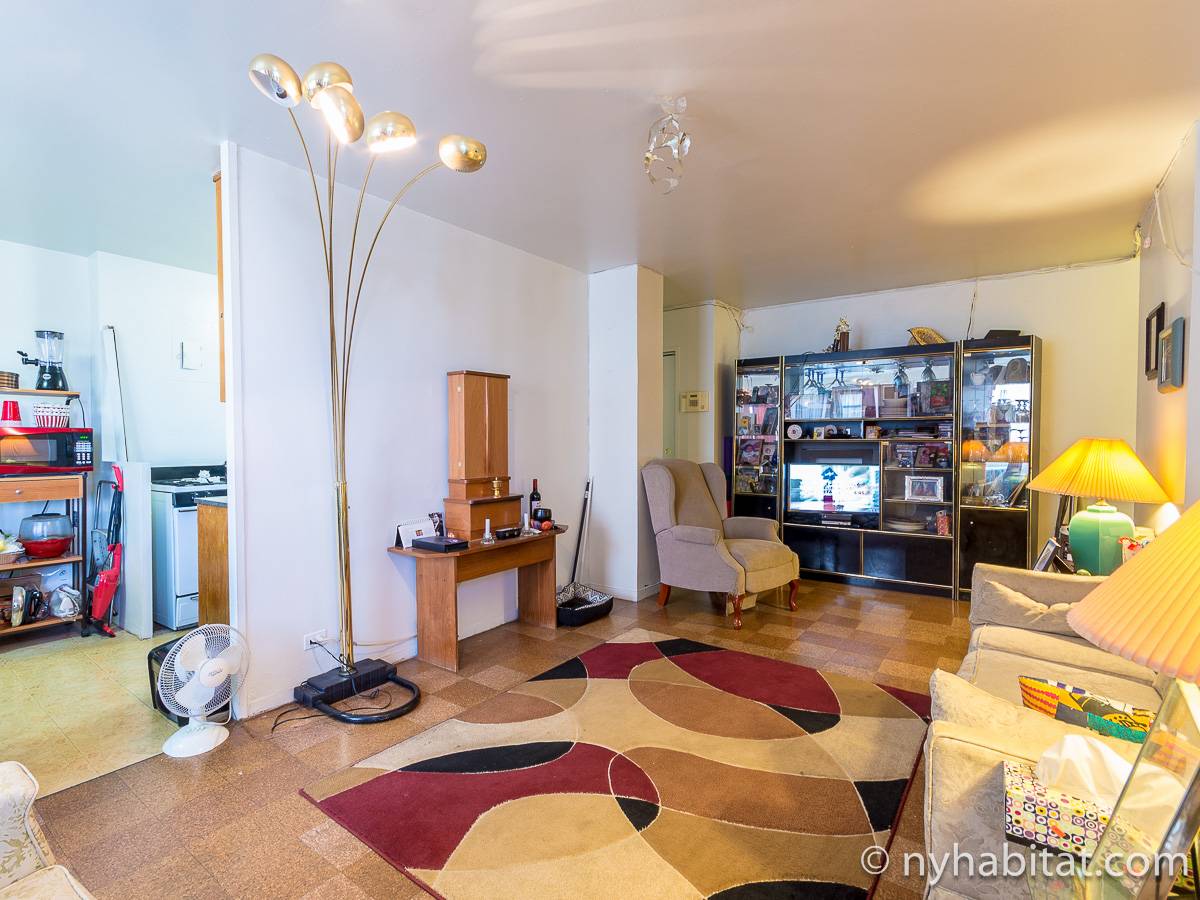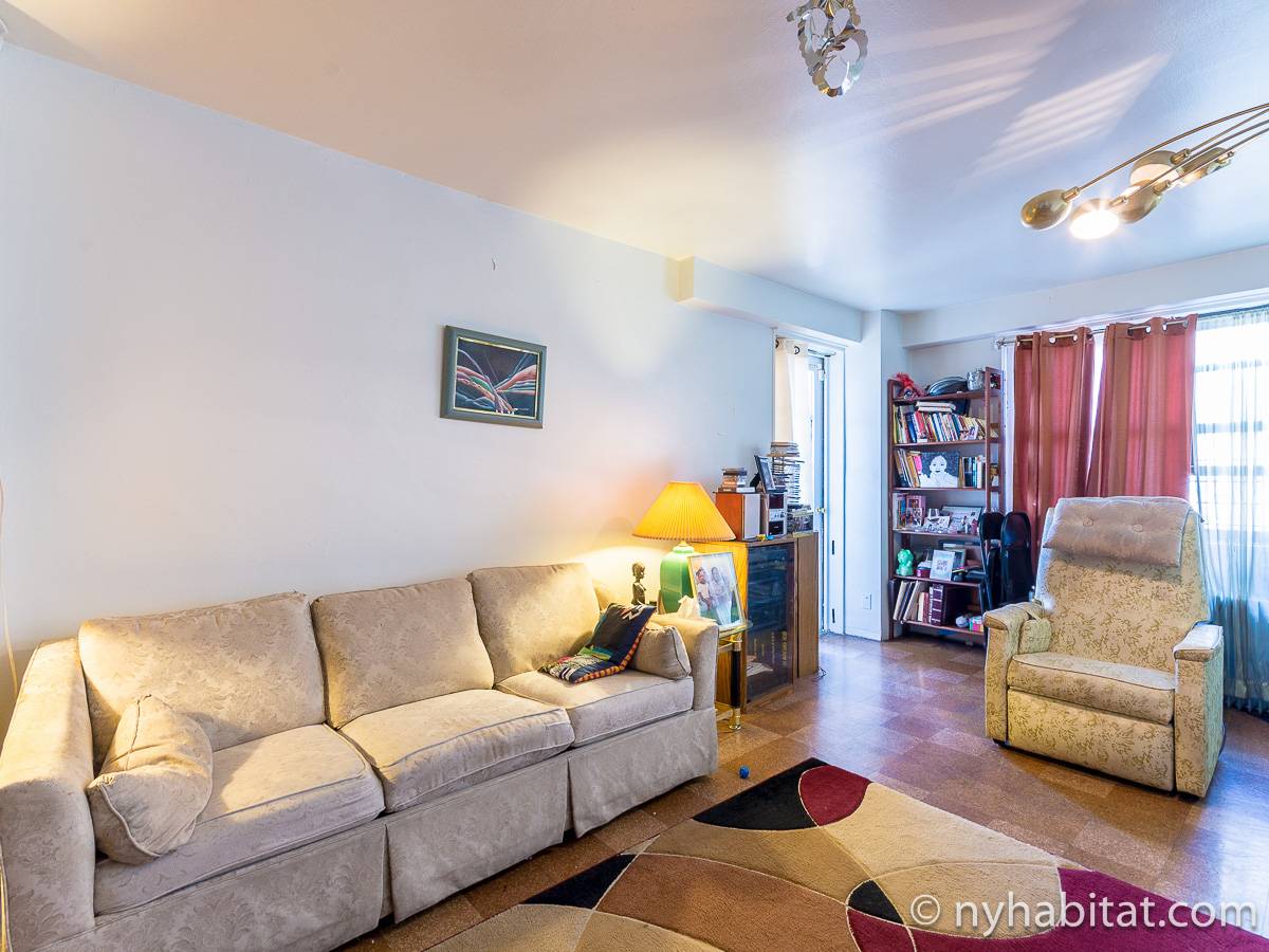 La stanza ha una finestra affacciata sul balcone che offre una vista su Prospect Park e i tetti di New York fino a Manhattan. La stanza comprende un letto matrimoniale, un televisore con collegamento via cavo e un telefono. Il bagno, il soggiorno, la cucina e il balcone sono condivisi con l’altro inquilino dell’appartamento, che occupa la seconda camera da letto. Il soggiorno ha dei comodi arredi e un moderno tappeto, con la cucina dietro l’angolo.