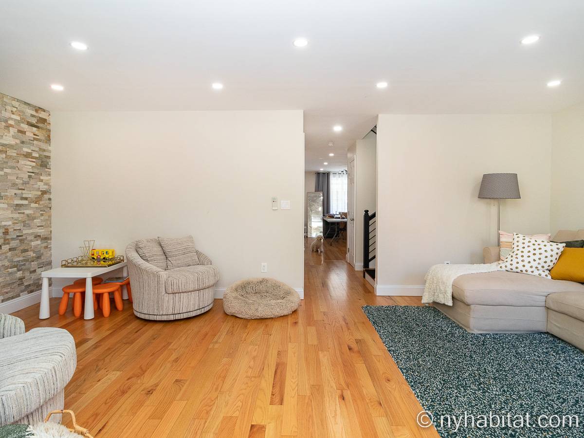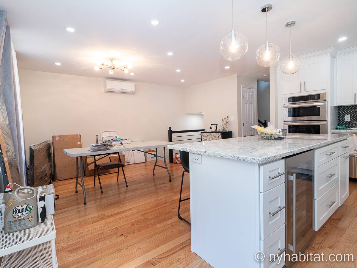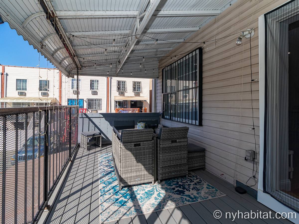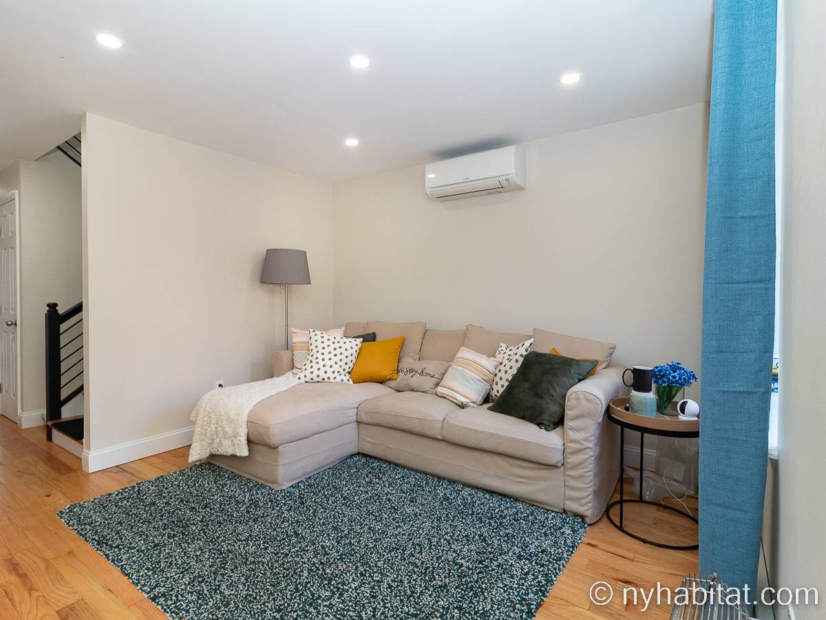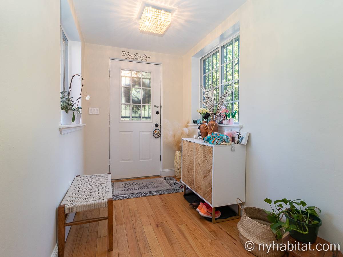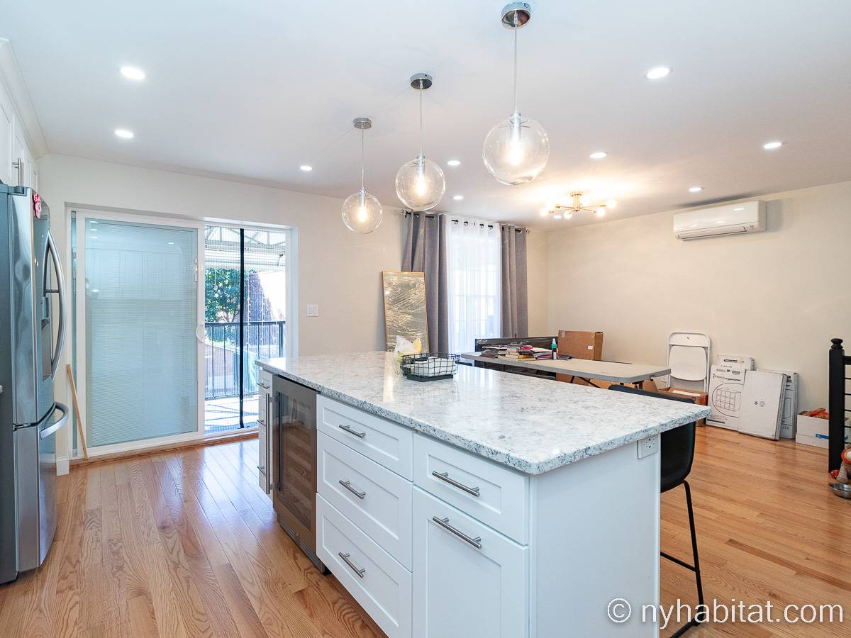La stanza in affitto disponibile si trova in questo appartamento con tre camere da letto, due bagni e un bagno di servizio, situato tra Bergen Street e Saratoga Avenue, nel quartiere di Bedford-Stuyvesant, a Brooklyn. Questo duplex ammobiliato si estende tra il secondo e il terzo piano (equivalenti al primo e al secondo piano europei) di una tipica townhouse newyorkese priva di ascensore. L’appartamento da condividere ha una superficie di 172 m2 e ha accesso ad una terrazza coperta e un cortile esterno.