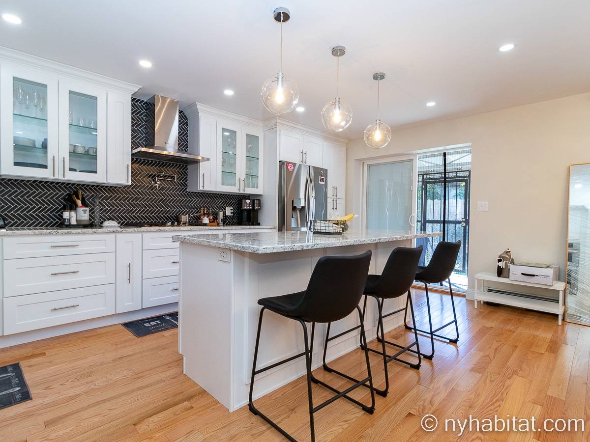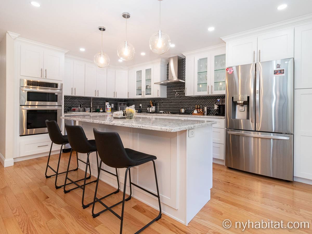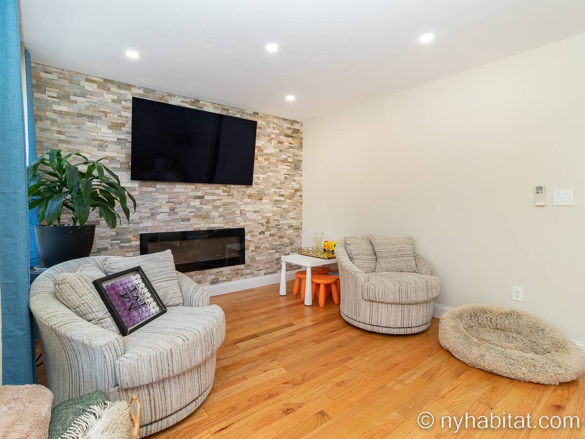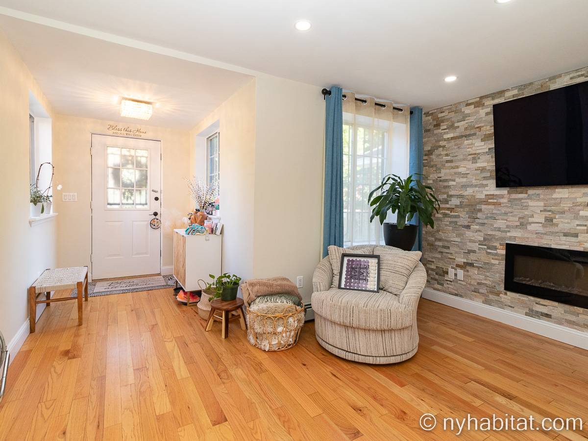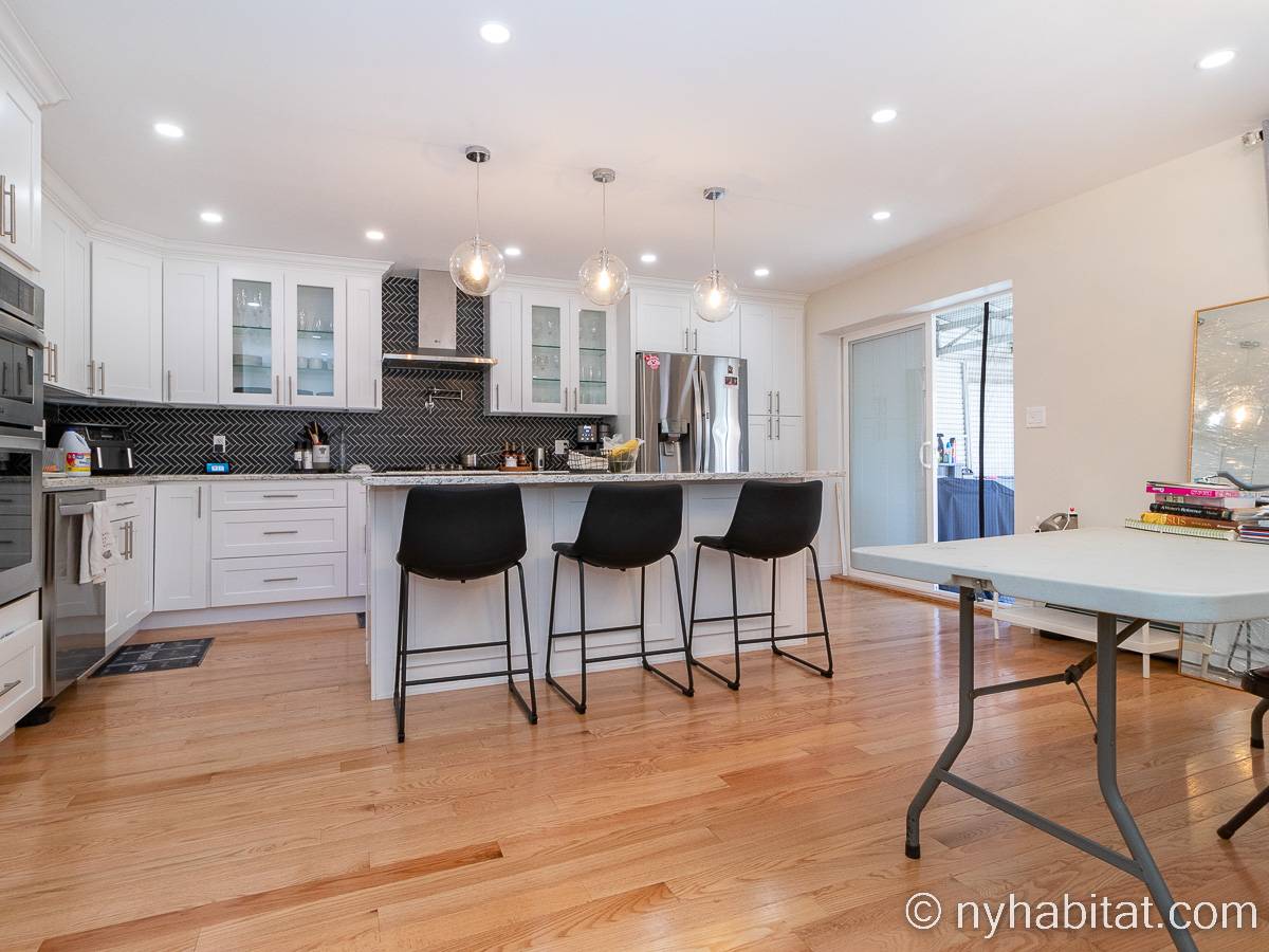 La stanza in affitto disponibile si trova in questo appartamento con tre camere da letto, due bagni e un bagno di servizio, situato tra Bergen Street e Saratoga Avenue, nel quartiere di Bedford-Stuyvesant, a Brooklyn. Questo duplex ammobiliato si estende tra il secondo e il terzo piano (equivalenti al primo e al secondo piano europei) di una tipica townhouse newyorkese priva di ascensore. L’appartamento da condividere ha una superficie di 172 m2 e ha accesso ad una terrazza coperta e un cortile esterno.