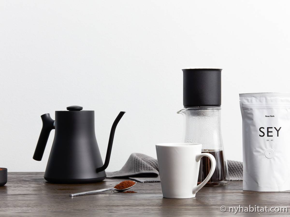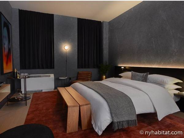 Entrando nel soggiorno ammobiliato, troverete un divano, un condizionatore, una TV via cavo, due grandi finestre e un letto king-size con lenzuola! Questo appartamento ammobiliato dispone anche di un telefono e la zona giorno comprende tende scure e un muro grigio estetico. La cucina open space possiede una zona in cui mangiare, un forno, un frigorifero con congelatore, un forno a microonde, una macchina per il caffè e una lavastoviglie! Il bagno con piastrelle e pareti bianche è comprensivo di doccia, vasca, wc e asciugamani!
