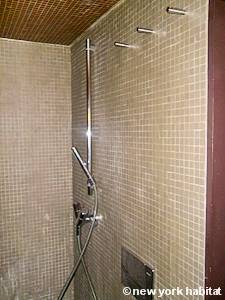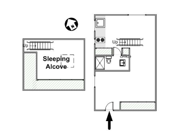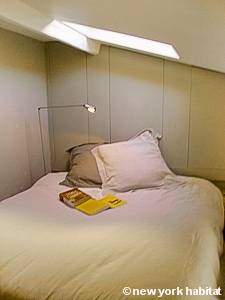 Salendo una scala che parte dal soggiorno potrete raggiungere il piano mezzanino del vostro appartamento monolocale, sui cui troverete un letto matrimoniale. Parte del livello mezzanino è dotata di una tenda per garantire ulteriore privacy. Sul livello del soggiorno c’è un bagno dotato di box doccia e un lavandino con un grande specchio.