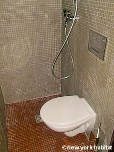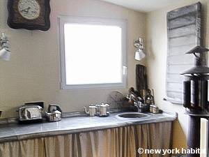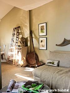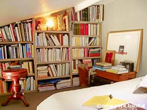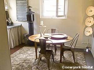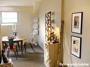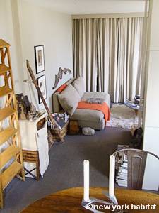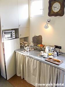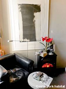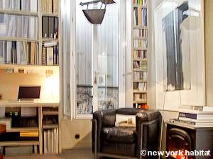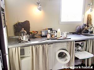 Entrando nell’appartamento vi troverete nella stanza principale, che ha pareti che servono anche come libreria a tutta altezza. Un divano ed alcune poltrone rendono lo spazio molto caldo e confortevole. In un angolo, vicino ad una finestra troverete un tavolo da pranzo per quattro persone. In cucina, situata vicino al soggiorno, ci sono tutti gli elettrodomestici necessari per cucinare in casa; ci sono un piano cottura con due fornelli, un forno, un forno a microonde e addirittura una lavastoviglie!