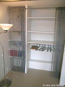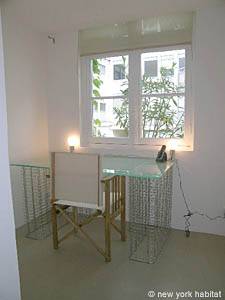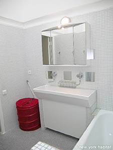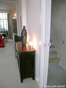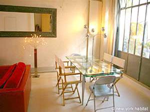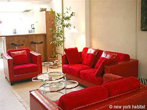 Nel soggiorno, gli smaglianti divani rossi offrono lo spazio ideale per rilassarsi, specialmente perché si trovano di fronte alla TV via cavo con lettore DVD. Gli scaffali per i libri, le opera d’arte moderna e alcune piantine nei vasetti, riempiono le pareti bianche. Un’ampia finestra alta quasi fino al soffitto illumina l’ambiente e un delicato tavolo da pranzo in vetro offre lo spazio necessario per riunire la famiglia a mangiare. Tra gli altri confort ci sono un tavolino da caffè in vetro, degli scaffali per riporre i propri accessori e uno specchio.