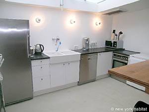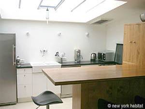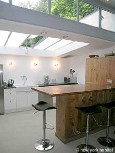La cucina aperta presenta elettrodomestici in acciaio inox e mobilio di color bianco. A dividere la cucina dalla zona giorno c’è un lungo bancone da colazione con quattro sgabelli, perfetti per mangiare un boccone, lavorare a computer o per qualche gioco in scatola! È disponibile anche una lavastoviglie. Il Bagno 1 (situato al piano terra) propone pareti in piastrelle bianche e un lucernario, oltre a una doccia, una vasca e asciugamani puliti. La finestra permette il cambio d’aria.