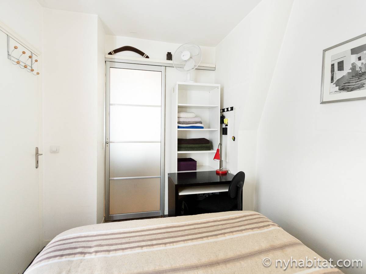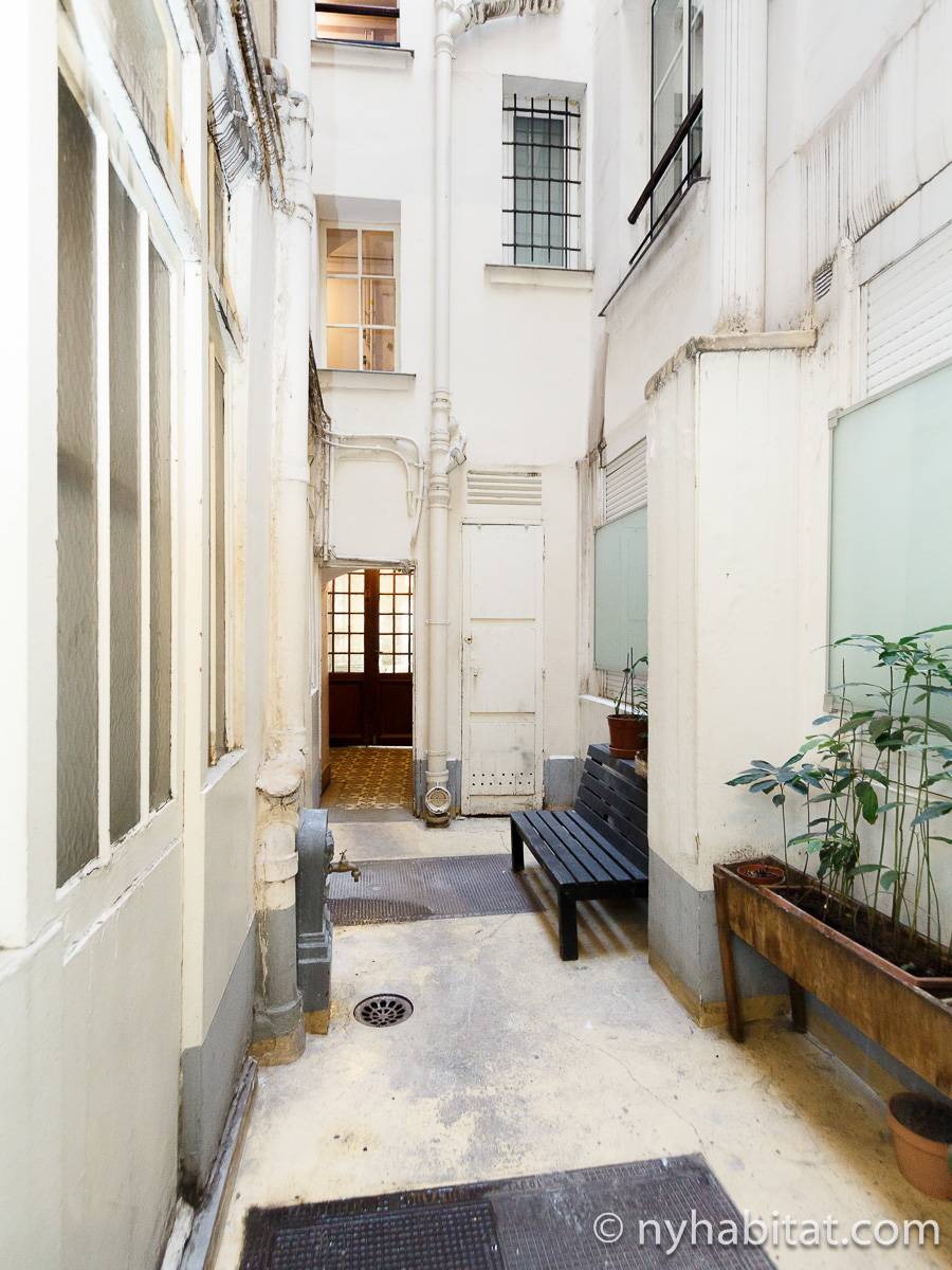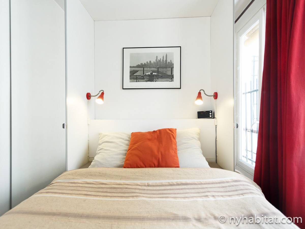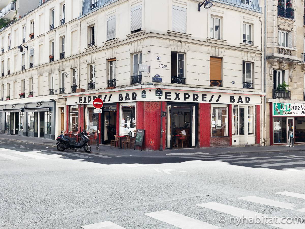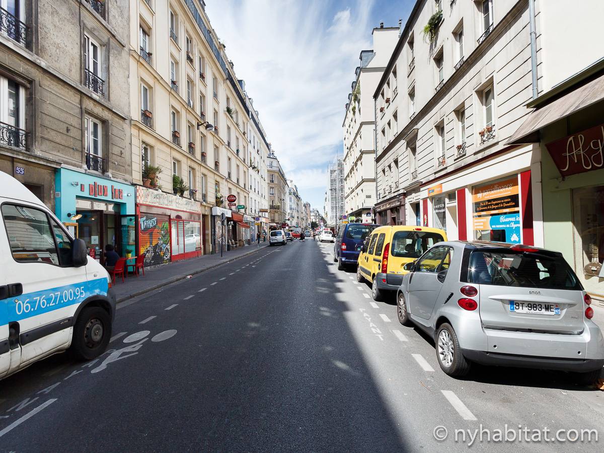 Questo appartamento con una camera da letto arredato in affitto su Rue Saint Maur a Parigi, nel quartiere di Oberkampf, movimentato e alla moda, si trova al quinto piano di un edificio senza ascensore del diciannovesimo secolo. È provvisto di citofono.