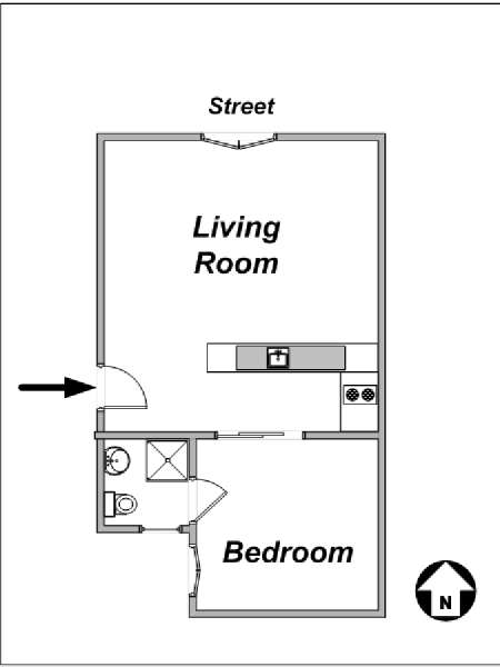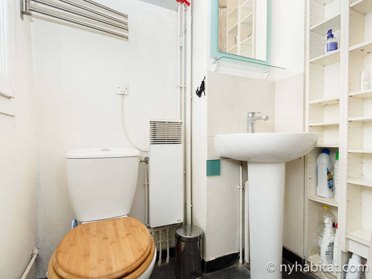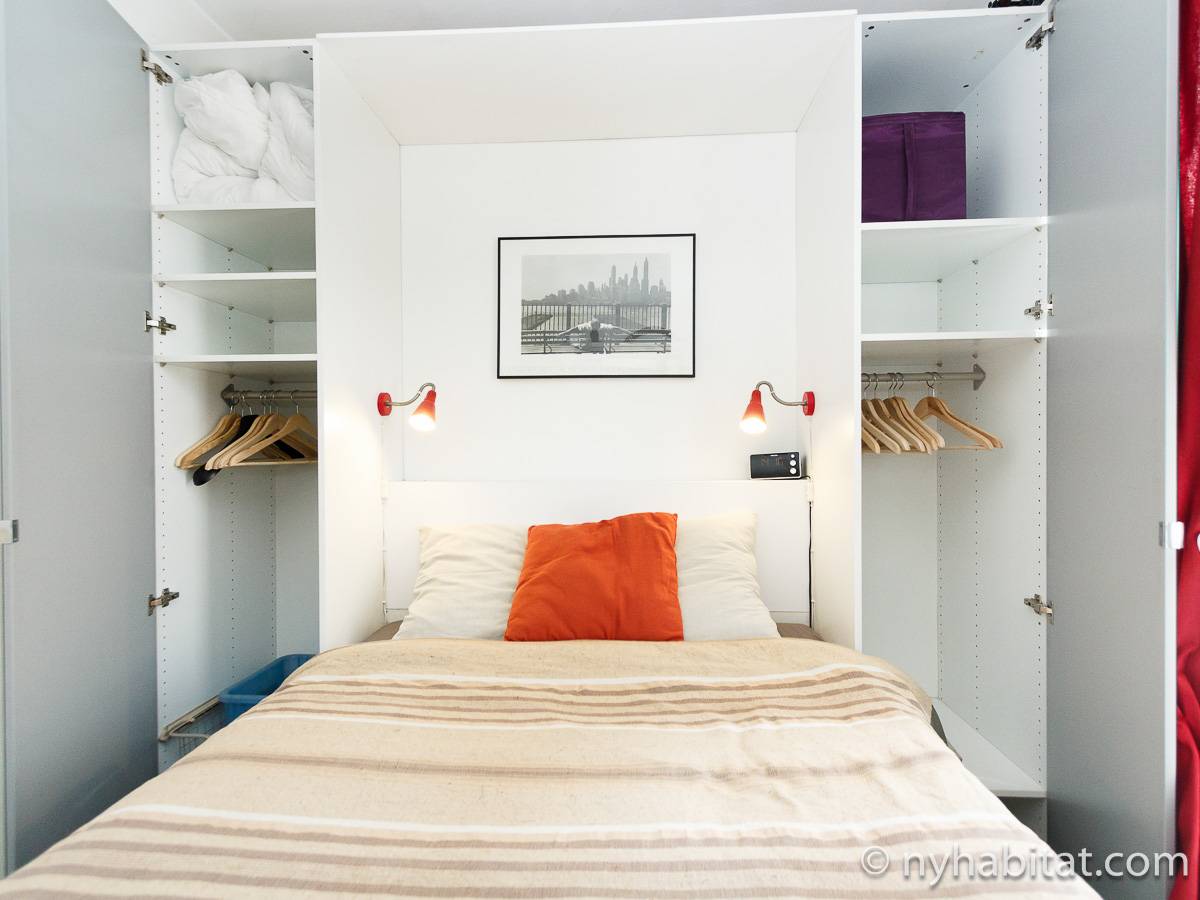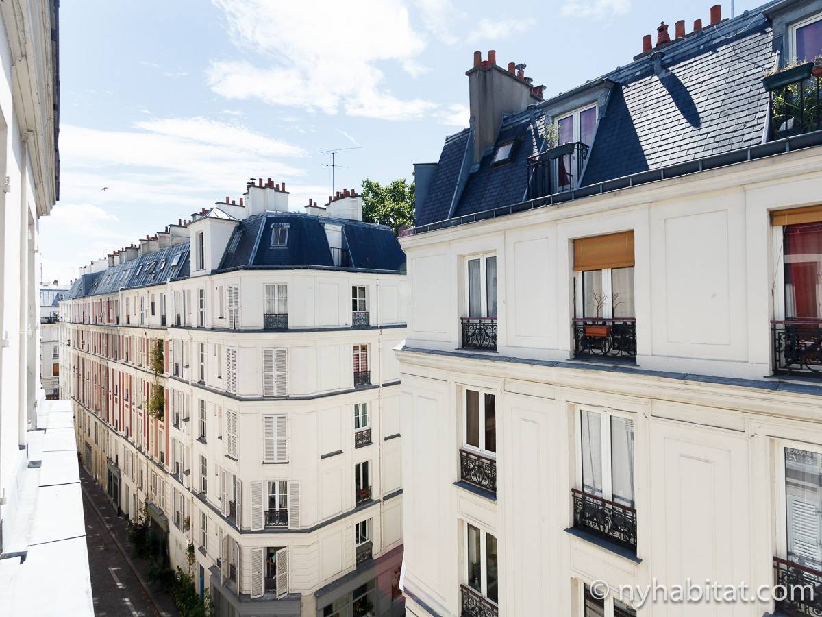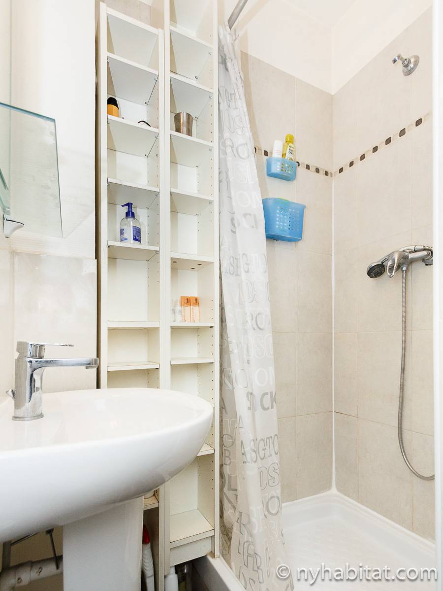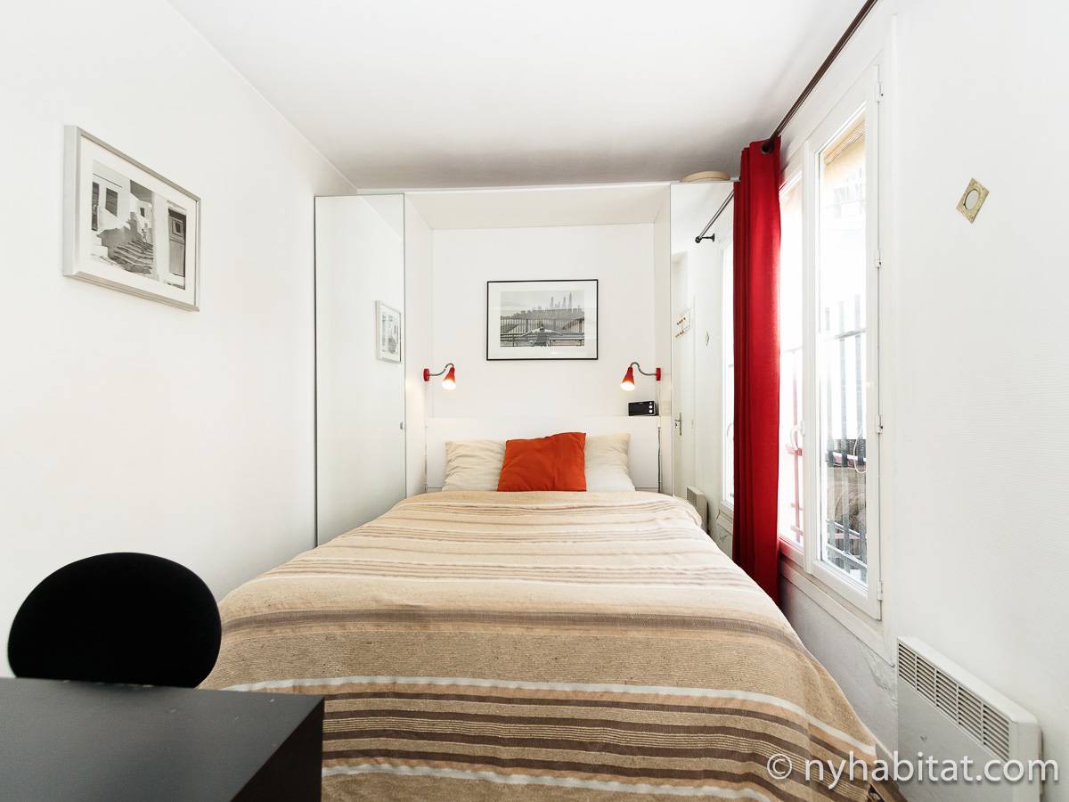 Questo appartamento con una camera da letto arredato in affitto su Rue Saint Maur a Parigi, nel quartiere di Oberkampf, movimentato e alla moda, si trova al quinto piano di un edificio senza ascensore del diciannovesimo secolo. È provvisto di citofono.