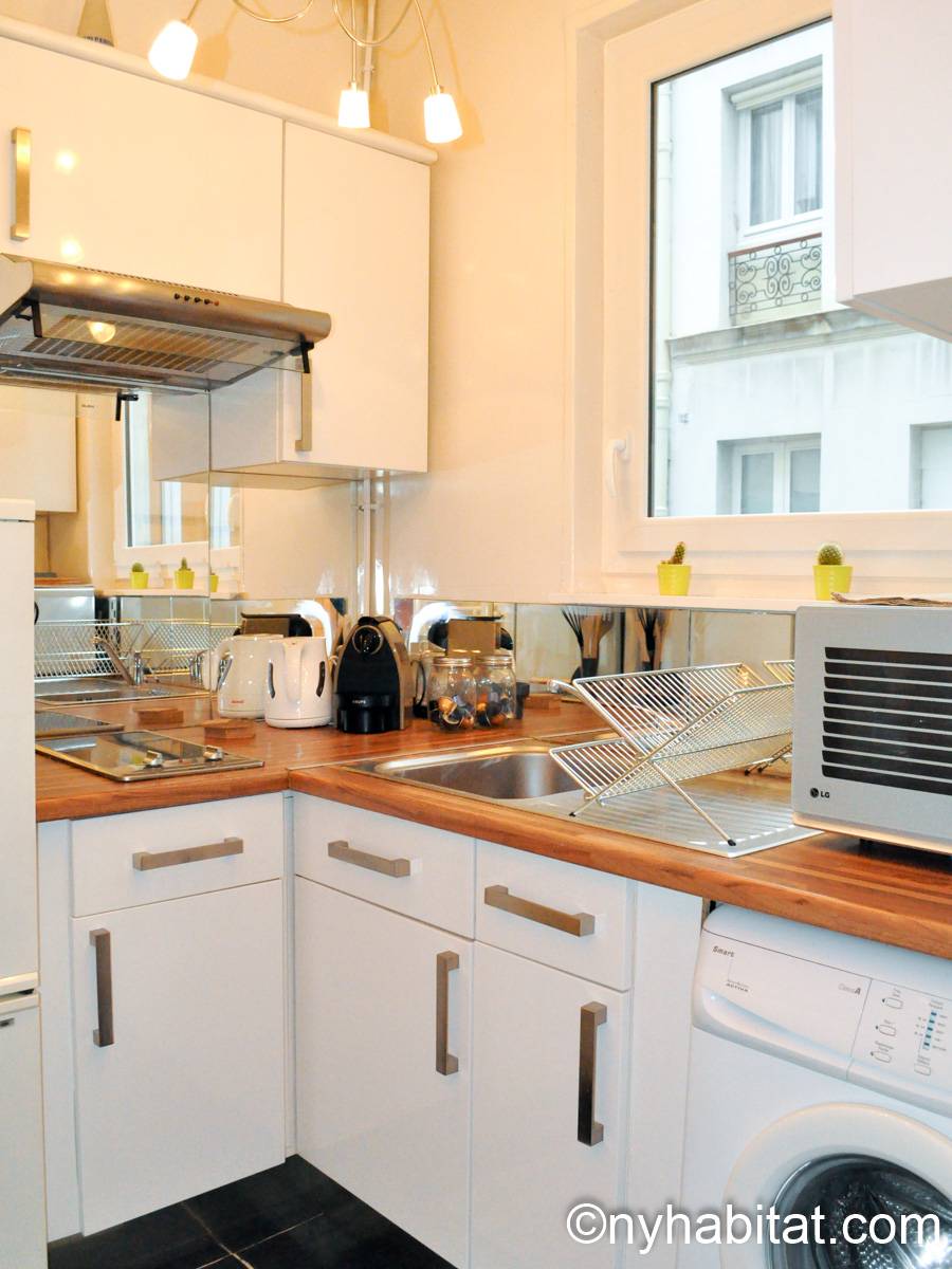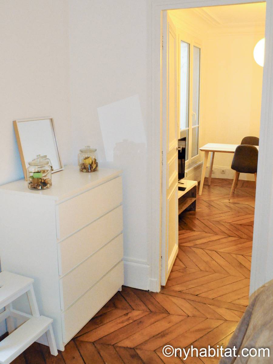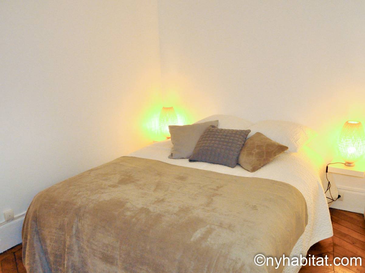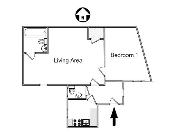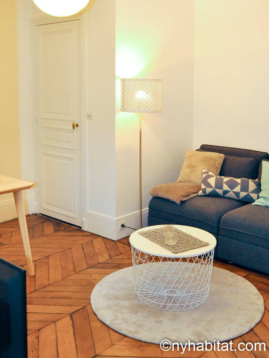 Quest'appartamento con una camera da letto mescola lo stile tradizionale con il moderno in maniera spontanea. Pareti chiare, parquet e soffitti alti fanno della casa una dimora arieggiata e confortevole. Il soggiorno, completamente ammobiliato in stile contemporaneo, dispone di un divano, una scrivania e una TV a schermo piatto. La camera da letto è ammobiliata in bianco con un letto matrimoniale "queen" e una luce debole. L'appartamento in affitto ha un bagno e mezzo: un bagno completo con mattonelle blu, una doccia verticale e il water, vicino alla cucina. La cucina è stata da poco rimodernata con banconi in quercia e armadietti bianchi. La casa è attrezzata con l'essenziale: un aspirapolvere, un ferro da stiro, l'asciugacapelli etc.