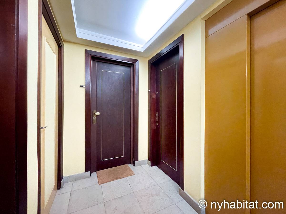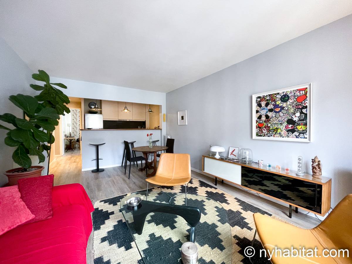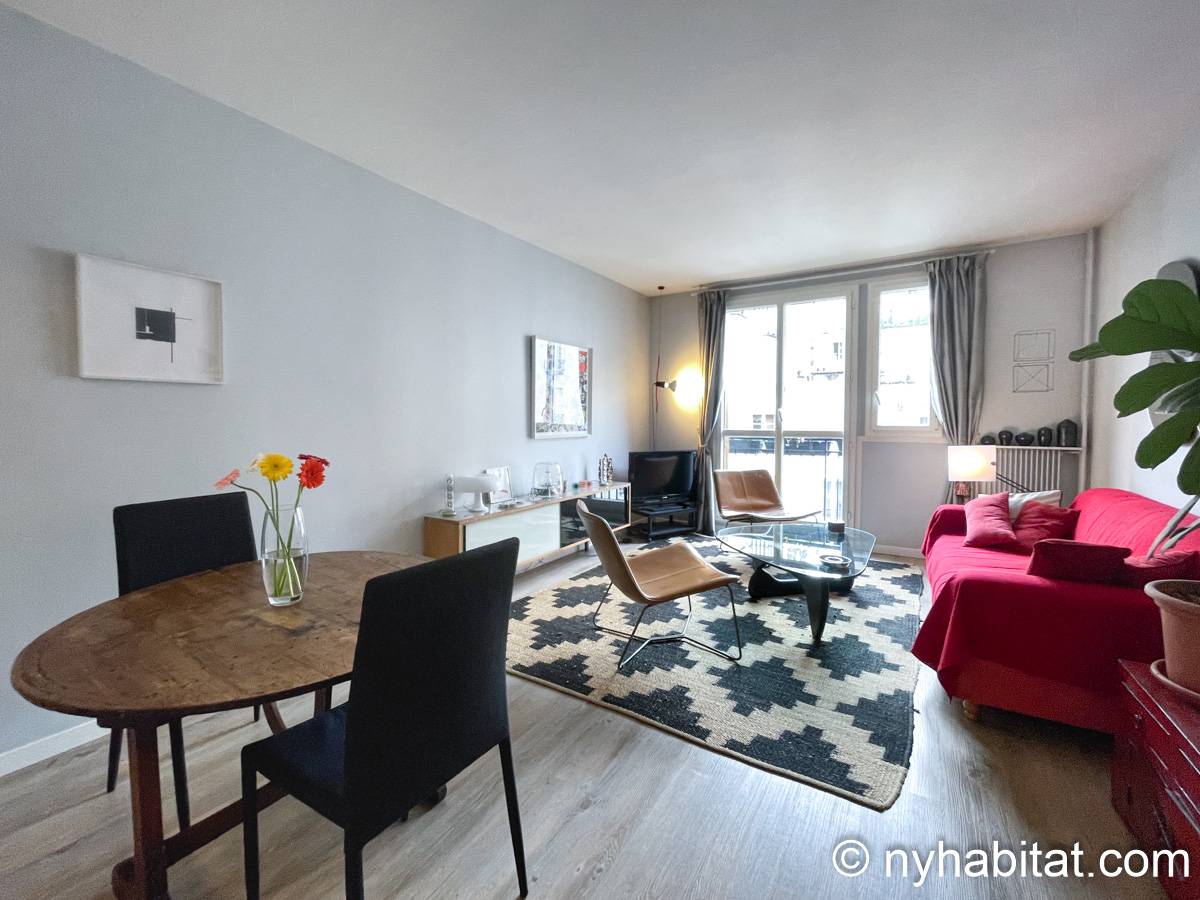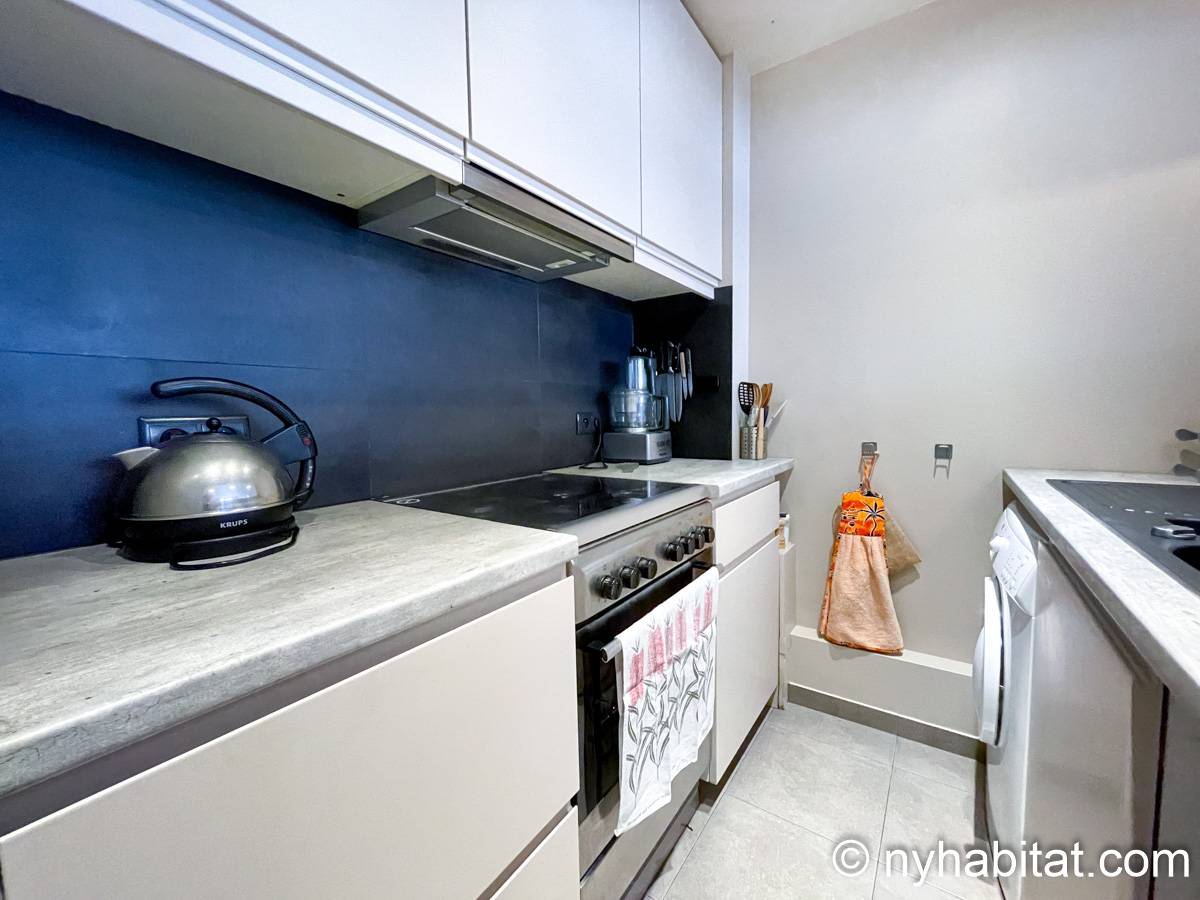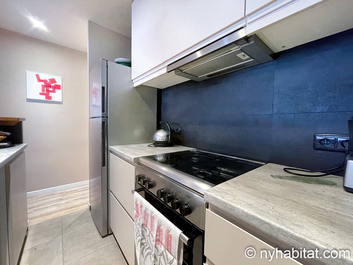 Il soggiorno di questo appartamento con una camera da letto è caratterizzato da pavimenti di in parquet ed un design contemporaneo. La stanza è graziosamente arredata con un sofà e poltrone, ed ha delle vetrate che permettono di riempirla di luce naturale. Potete aprire le finestre ed affacciarvi dal piccolo balcone per apprezzare ancor di più la bellezza della via. C’è un piccolo tavolo da pranzo nell’angolo e sgabelli per gustare un piccolo snack sul bancone della cucina. La cucina open space dell’appartamento è dotata di accessori in acciaio e tutti gli utensili e le stoviglie necessarie. La moderna sala da bagno offre delle bellissime piastrelle in terra cotta, uno specchio retroilluminato e una vasca. Il WC è separato. Nella camera da letto di questo appartamento, di fronte al televisore a schermo piatto a muro, si trova un letto ad una piazza e mezzo e un ampio armadio.