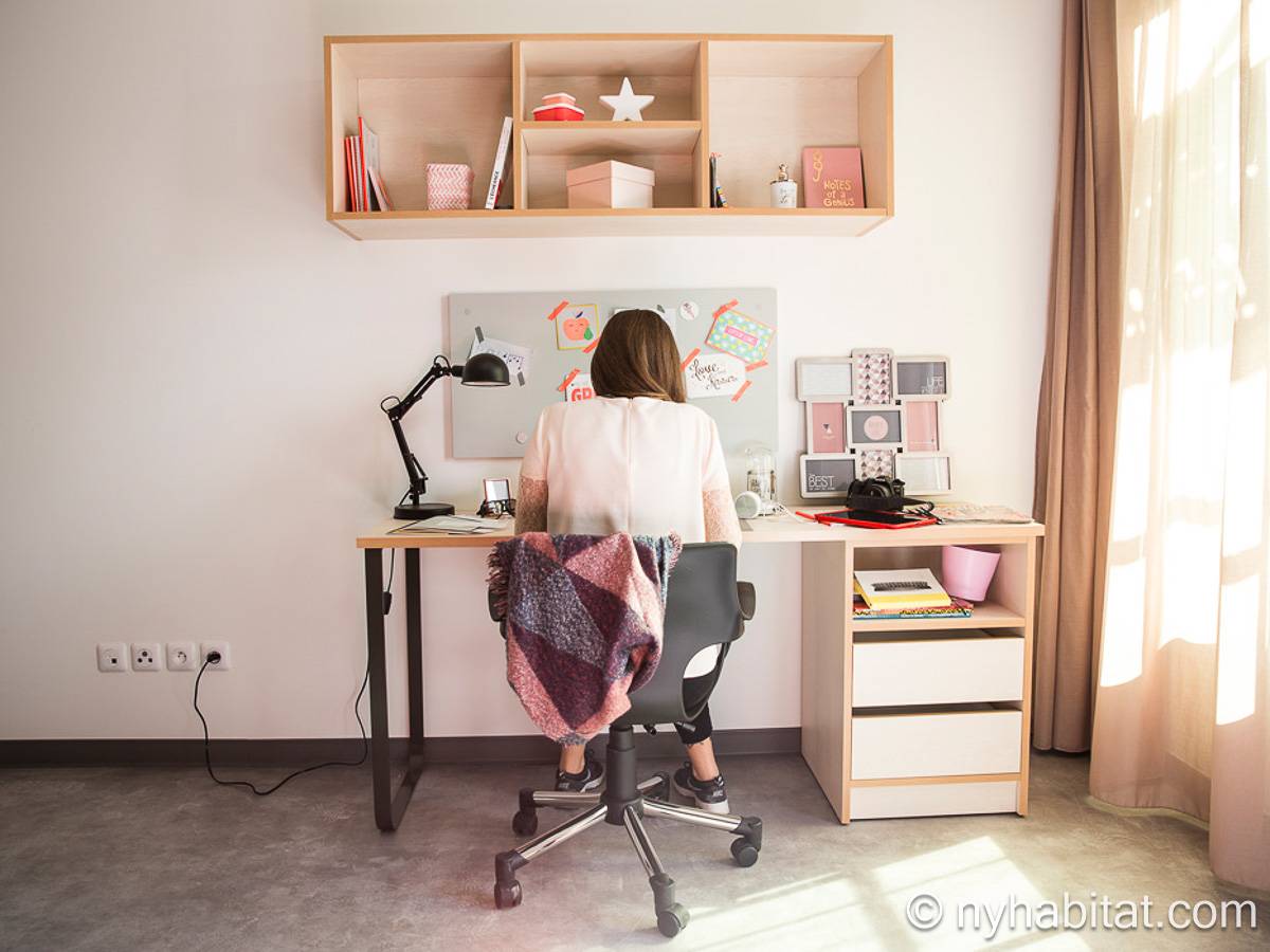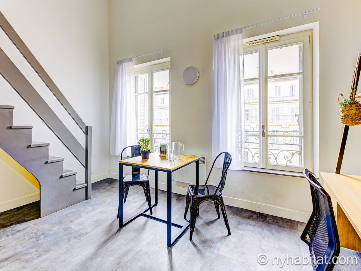 Ristrutturato nel 2013, questo appartamento di circa 60 mq è luminoso e calmo. Le finestre offrono una bella vista sia su una corte interna alberata che sulla strada frontale. Il soggiorno di questo appartamento in affitto presenta una pavimentazione in mattoni rossi e dei muri bianchi, ed è arredato con un divano rosso e un pouf dello stesso colore, una lampada da terra e un tavolino. La cucina abitabile, in una stanza indipendente, è equipaggiata con un frigorifero/refrigeratore, un forno, un piano cottura e stoviglie, e offre spazio sufficiente sia sui piani di lavoro che all’interno degli armadietti. Inoltre, si può trovare un tavolo per quattro persone. La camera da letto, invece, presenta un letto matrimoniale e un armadio. Qui un bagno offre una doccia e un lavabo, ma il wc si trova in una stanza a parte.
