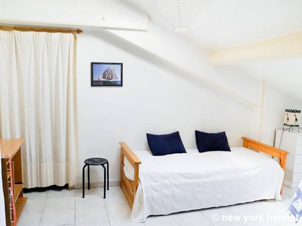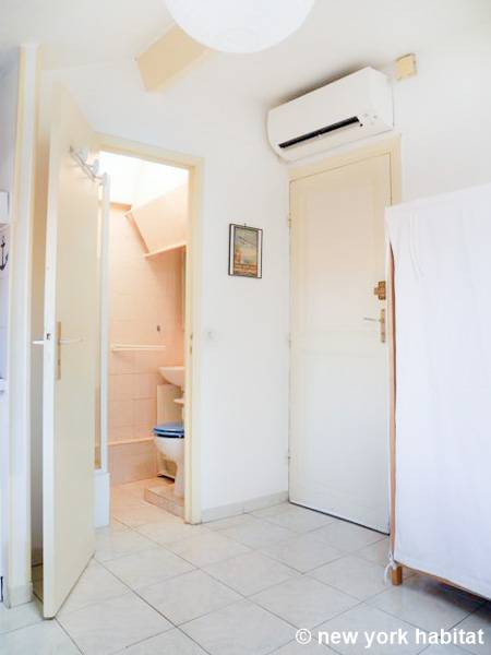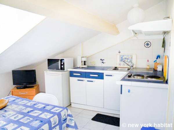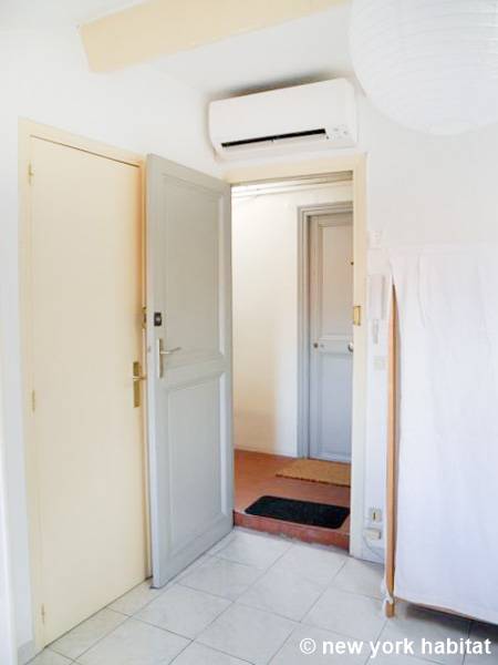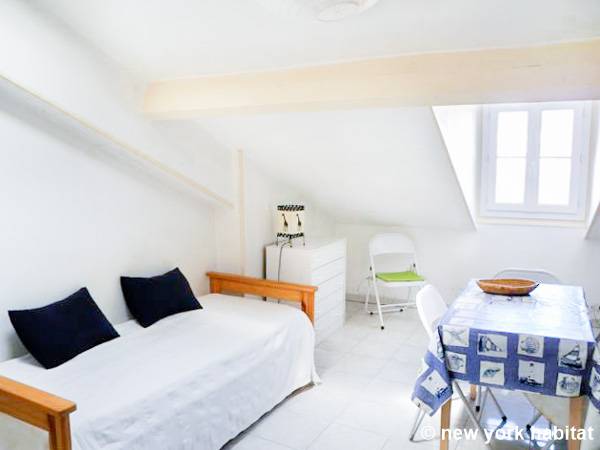 Gli interni dell’appartamento monolocale sono arredati seguendo uno stile mediterraneo molto moderno, tipico della Francia del sud, con pareti bianche e tocchi di colore qua e là, soffitti inclinati e viste sulle colline dietro la città, a nord. Il letto estraibile ad una piazza e mezzo può fungere da zona giorno trasformandosi in un comodo divano rivolto verso una TV a schermo piatto.