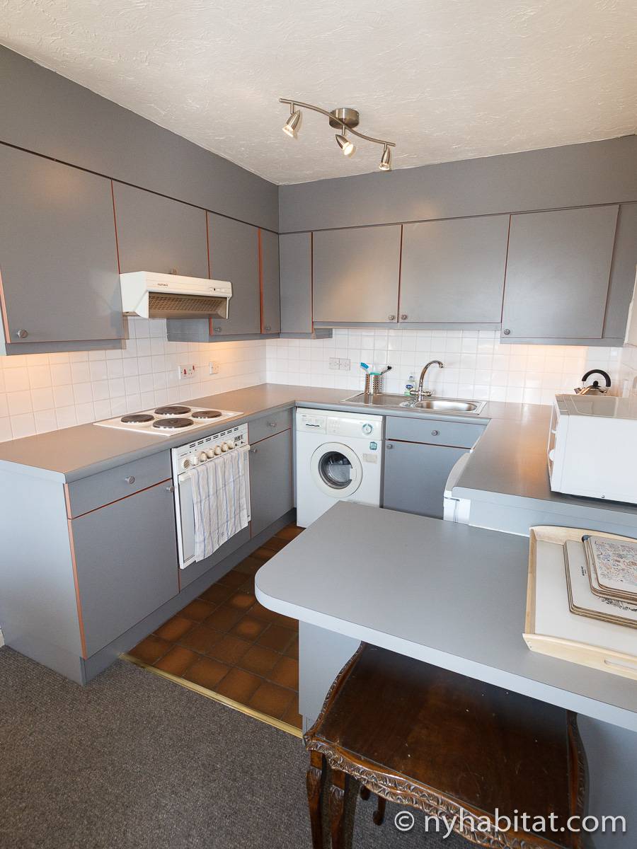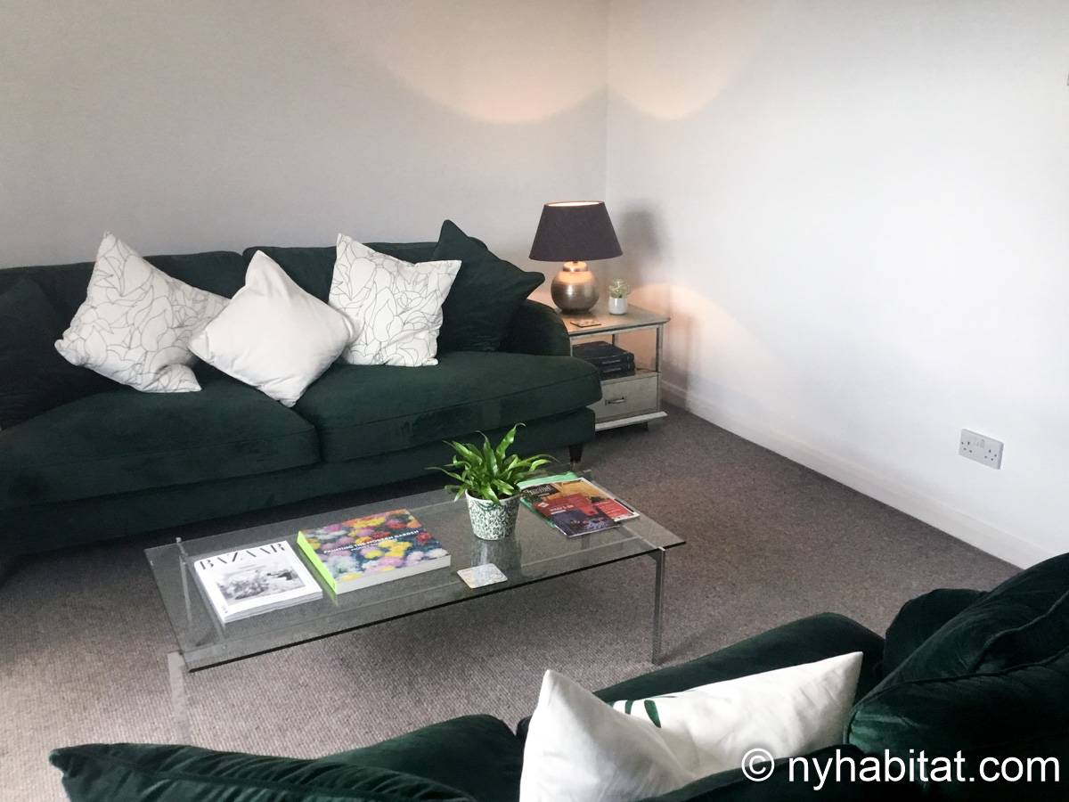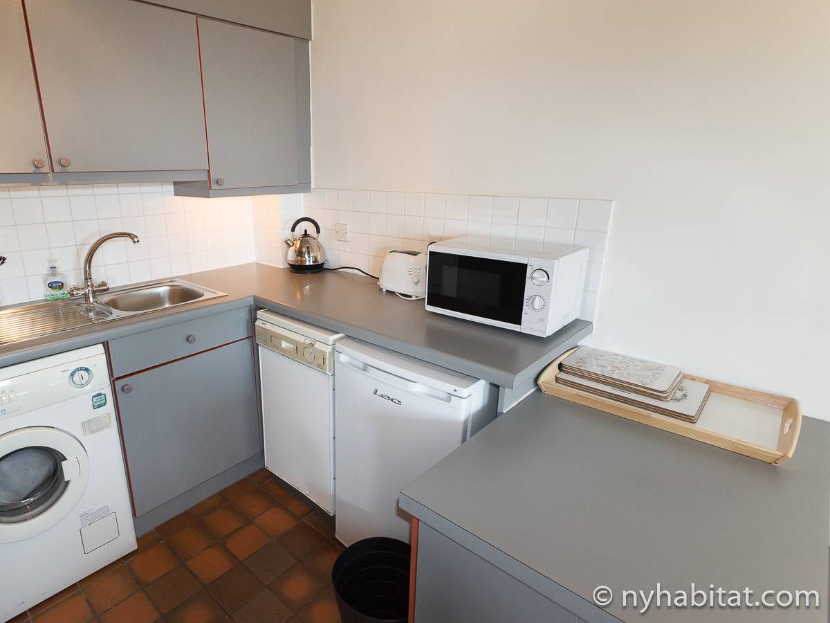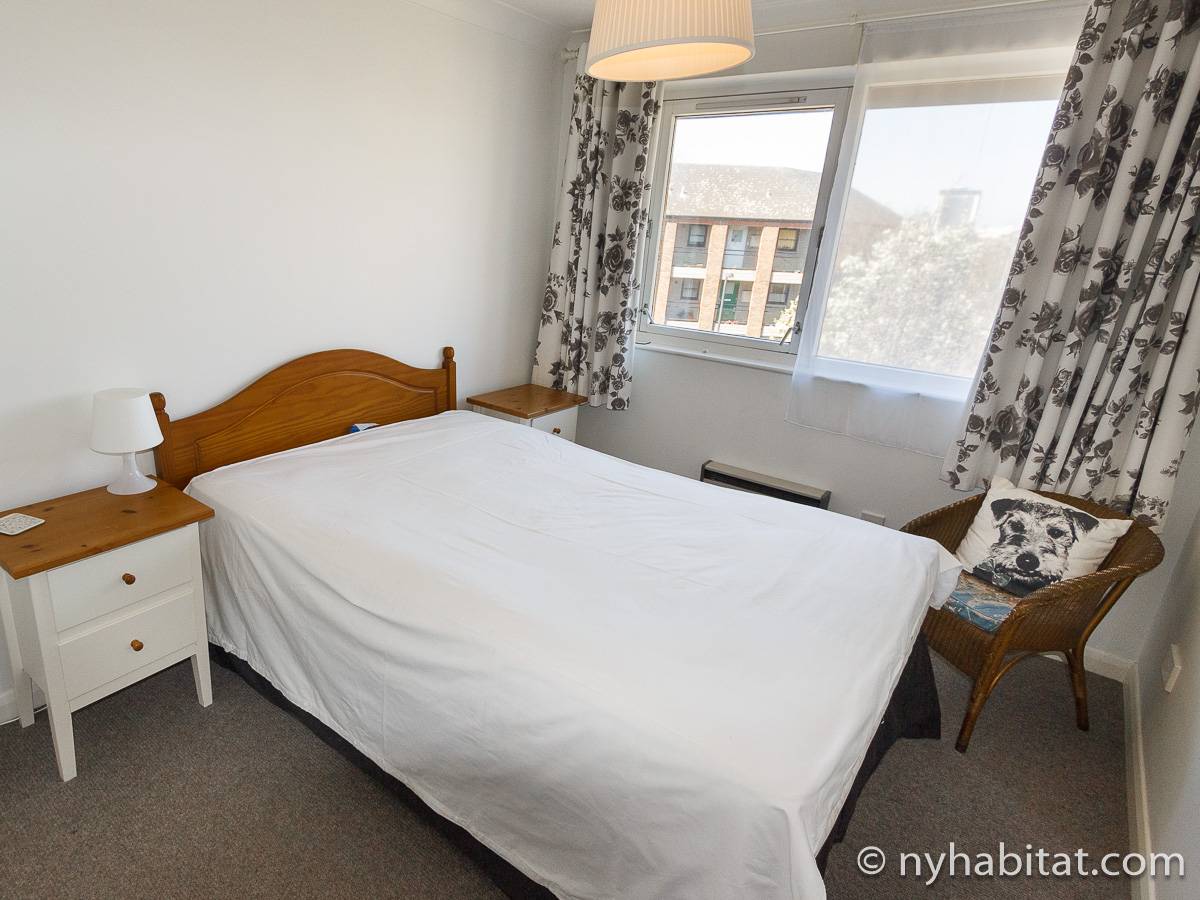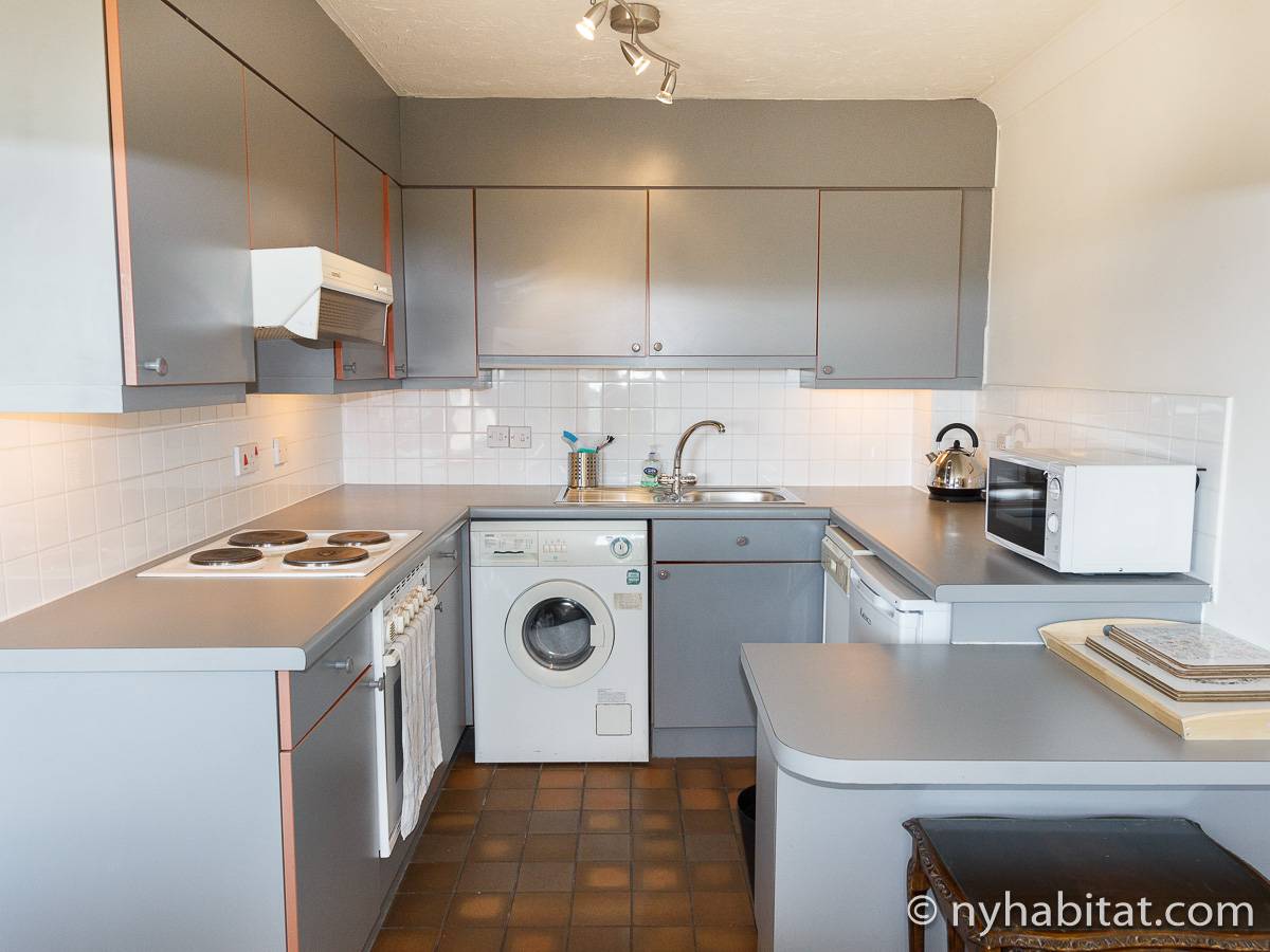 This London apartment features modern décor and offers ample natural light. The living room is furnished with a sofa and a dining table for six people. The open kitchen is equipped with an oven, fridge, microwave, toaster and a dishwasher. The bathroom has a bathtub, WC and a sink. The two bedrooms are furnished with full sized beds and nightstands. This apartment also has the convenience of a washing machine.