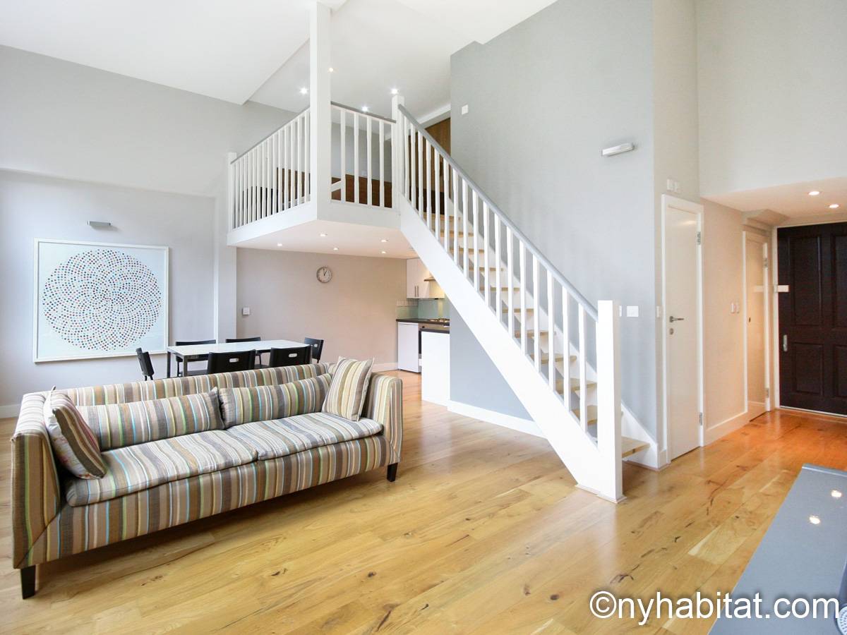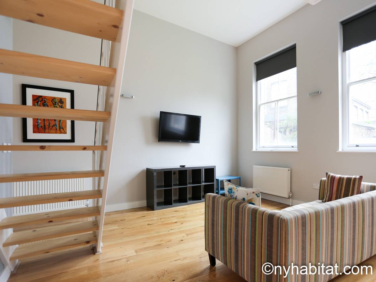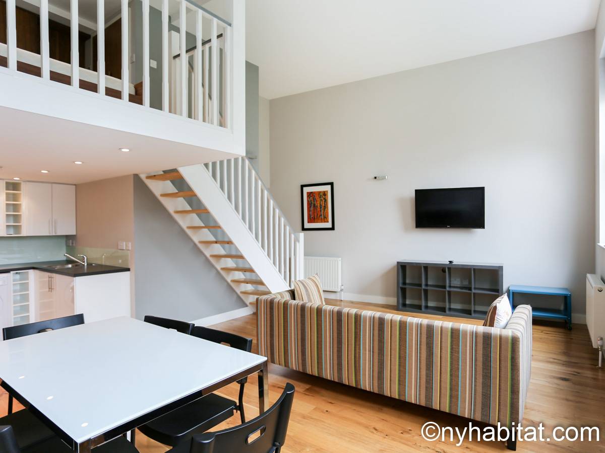 The London apartment is furnished with contemporary décor, complemented by hardwood flooring, in a space that with excellent natural light. The living area features a sofa and TV for entertainment as well as a dining table capable of seating six people.
