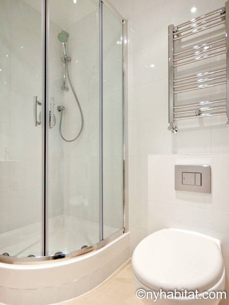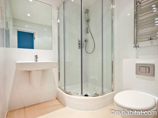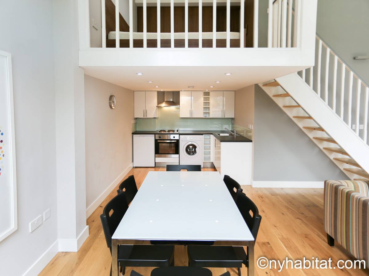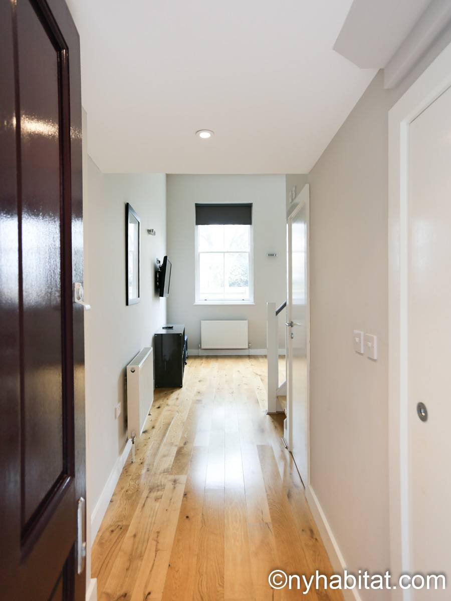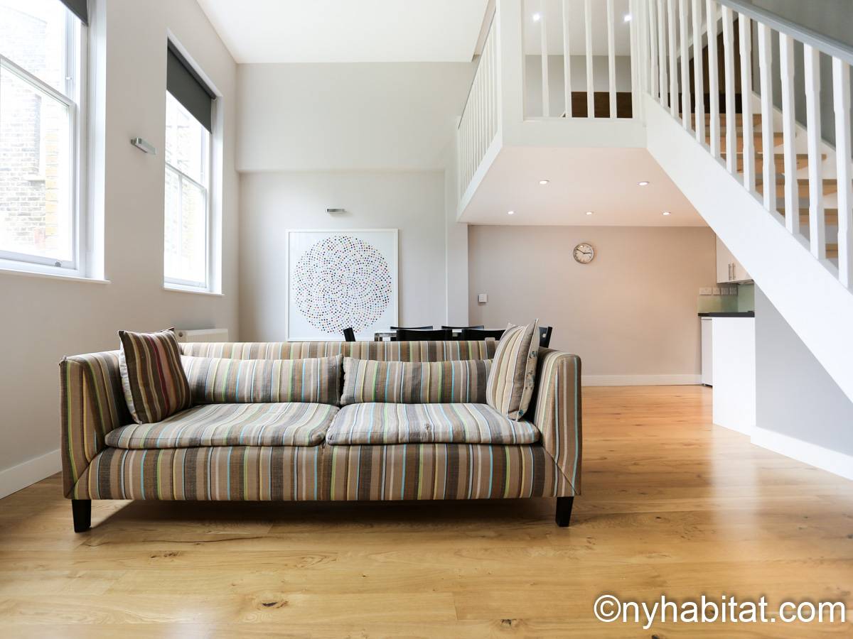 The London apartment is furnished with contemporary décor, complemented by hardwood flooring, in a space that with excellent natural light. The living area features a sofa and TV for entertainment as well as a dining table capable of seating six people.