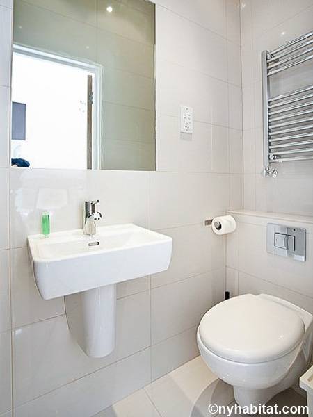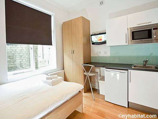 An open plan furnished studio apartment is a contemporary vision for a student or professional. You will have the basics such as a full sized bed, open kitchenette with microwave and fridge, and a WC. The space has a large window, armoire closet, and hardwood floors. Watch TV from the bed or above the stool in the eat-in kitchen. The modern bathroom is complete with a WC. Security is also provided by a door entry system.