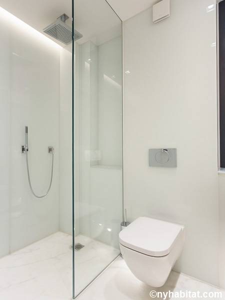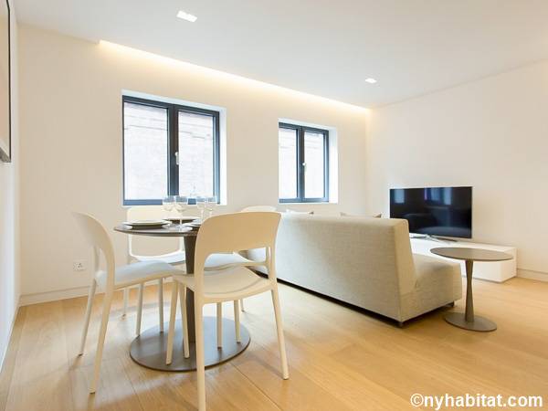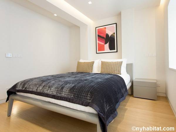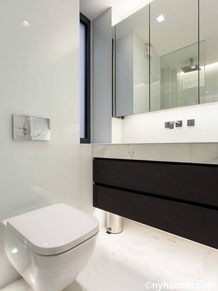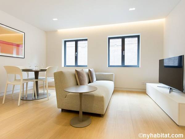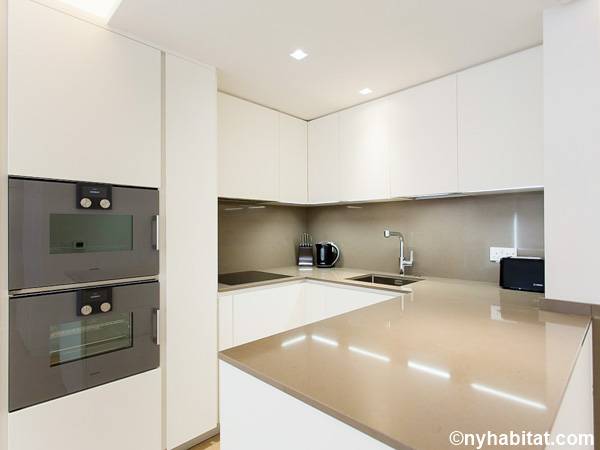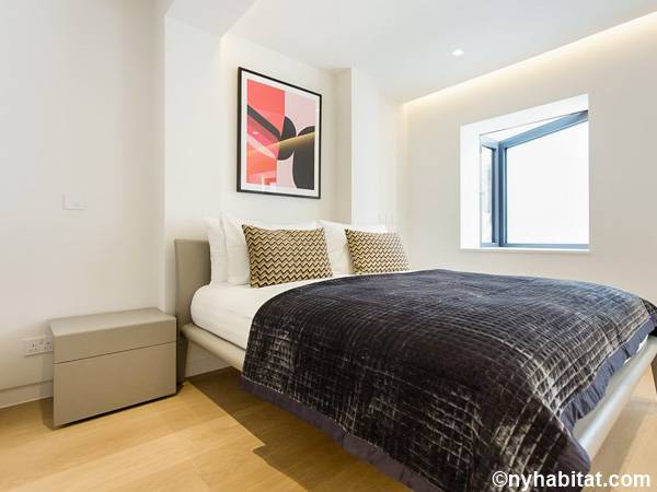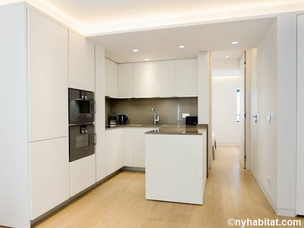 Move into this chic one bedroom apartment in the trendy London neighborhood of Soho. Decorated in a contemporary style, there is a strong emphasis on line and form which gives this apartment its vitality. The open floor plan and minimalist furnishings present itself as a blank canvas to make your own. From the relaxing living room with elegant backlighting, you can easily access the kitchen which is furnished with designer appliances, custom shelving, a deep sink, and a wrap-around counter top. The bathroom includes a separate water closet, marble features, and a rainfall shower head. The bedroom includes a double bed and modern art to compliment the smooth profile and natural light defining the room.