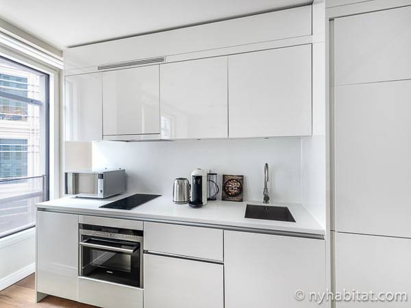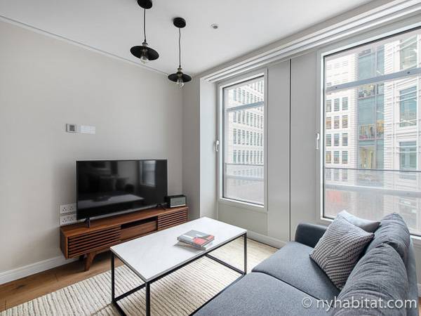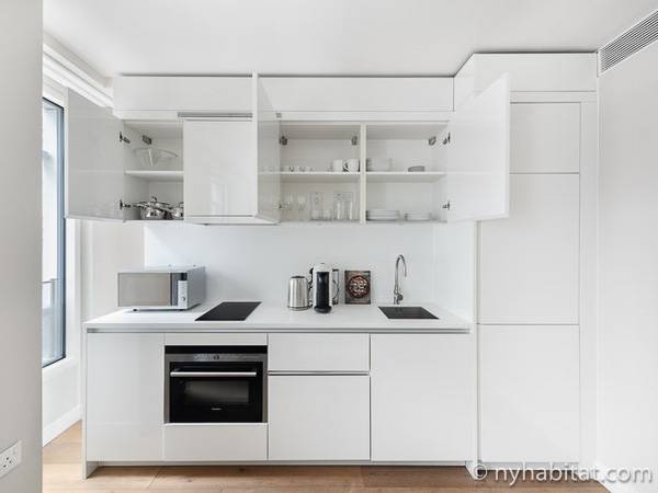 The open plan living space combines the dining room, kitchen and living room area with big windows to really brighten up this great space! The all-white kitchen is pristine and equipped with modern appliances. The living area has a comfortable couch, sturdy coffee table & a wide, flat screen TV.