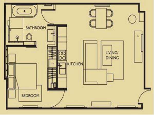 Located between Ireland Yard and Carter Lane in the Blackfriars area, this 1 Bedroom/1 Bath furnished London apartment is located in an elevator building consisting of 12 apartments with a video security camera system at the entrance. Designed in a modern style to emphasize light and space, this sleek corporate-style apartment offers the luxury of modern fixtures and designer Italian furniture. Any modern apartment has to be fitted with the latest technology to keep up with this fast paced international city and major world business center. Your apartment is equipped with wireless broadband internet, and telephone with voicemail to keep up with business, but all work and no play does get boring so in your downtime you can enjoy 2 flat screen TVs with satellite channels (one in the bedroom and one in the living room), a DVD player and i-pod docking station. There is also a well-equipped gym in the vicinity. The units in this building have been cleverly designed with views over a tree-lined courtyard to provide peace in the middle of the big city of London. The living space emphasizes serenity from the living room with plush sofa to the zen-like ambiance of the glass and tiled en suite bathroom you'll spend far too much time in. Off the relaxing, light filled living room is the open kitchenette area equipped with a microwave, dishwasher, coffee maker and toaster. The perfect set up to prepare a home cooked meal and sit down at your dining table for four (invite friends!).