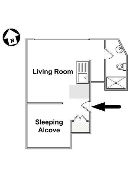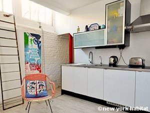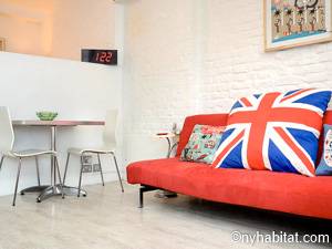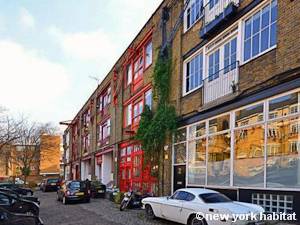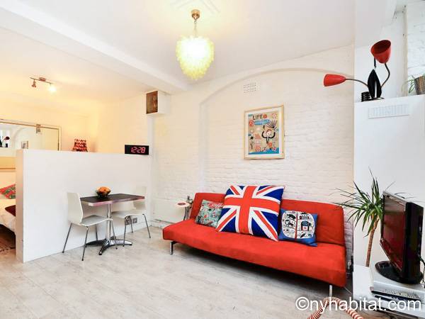 This quirky furnished alcove studio vacation rental is located in Shoreditch, London. This area is found in the fashionable Hackney - East End area of the city. Secured with a security system, this apartment is on the basement level of a four floor refurbished warehouse building that was used as a frame workshop in the 1920s. The high ceilings and exposed brick walls serve as charming reminders of this apartment's past life, but don't worry -- it has been completely renovated to accommodate guests.