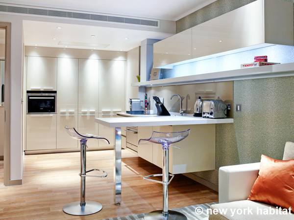 Your fully furnished Tower Hill vacation rental consists of a bedroom, bathroom, kitchen and living room. The living room offers plenty of room to sit back after a long day of exploring London. The sofa and TV offer the perfect combination to relax and watch a movie. The kitchen is open and the features include a fridge, freezer, oven, coffeemaker, toaster and more! There are also barstools in the kitchen for enjoying meals at home. The bedroom offers a double sized bed in addition to modern-style furnishings. The bathroom offers a tub with shower, toilette, sink, and a large mirror.