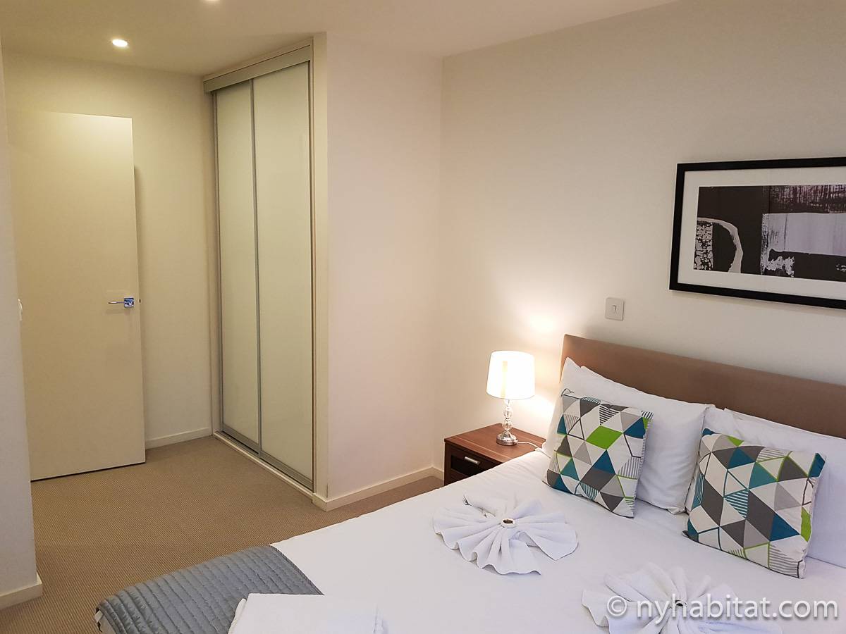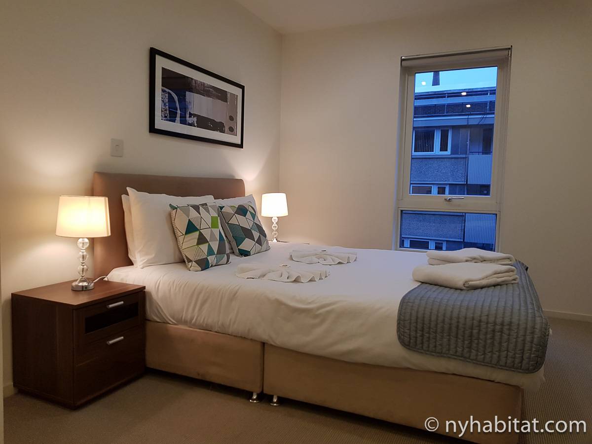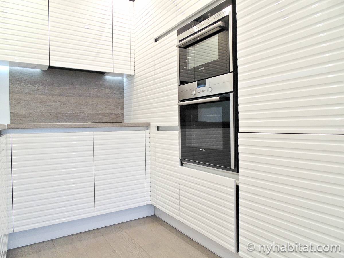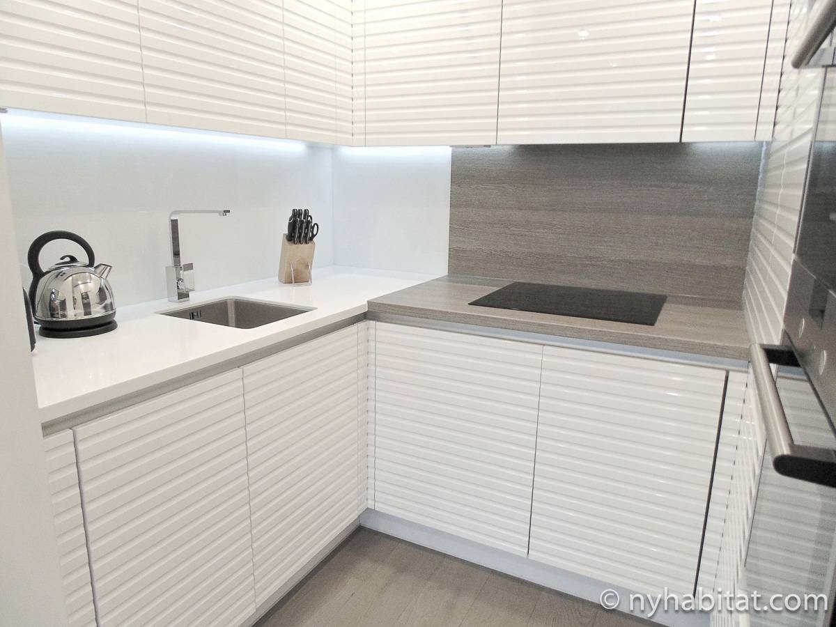 The living room found in this vacation rental is a perfect place to relax with the floor to ceiling windows letting in a ton of natural light. The soft design elements offer an oasis as you sit on the sofa to read or watch TV. The dining table for four is the perfect place to enjoy a meal that was cooked in the open fully equipped kitchen. There are stainless steel appliances, modern designed cabinetry, and a kettle to make your Earl Grey tea. There is light wood flooring throughout the living space and carpeting in the bedroom. Modern pot lighting adds to the contemporary feeling in this apartment. The bathroom is immaculate with a washbasin, chrome faucets, and eye-level mirrors that wrap around.