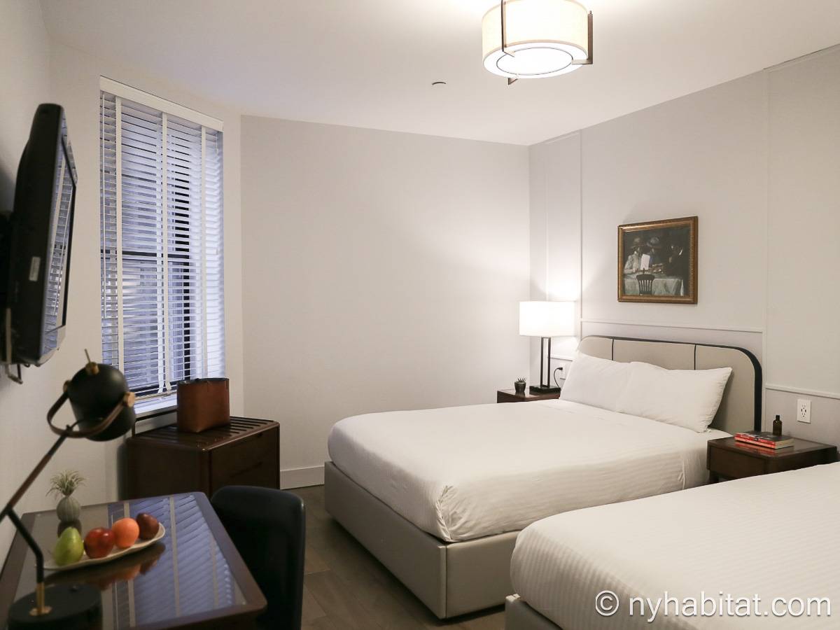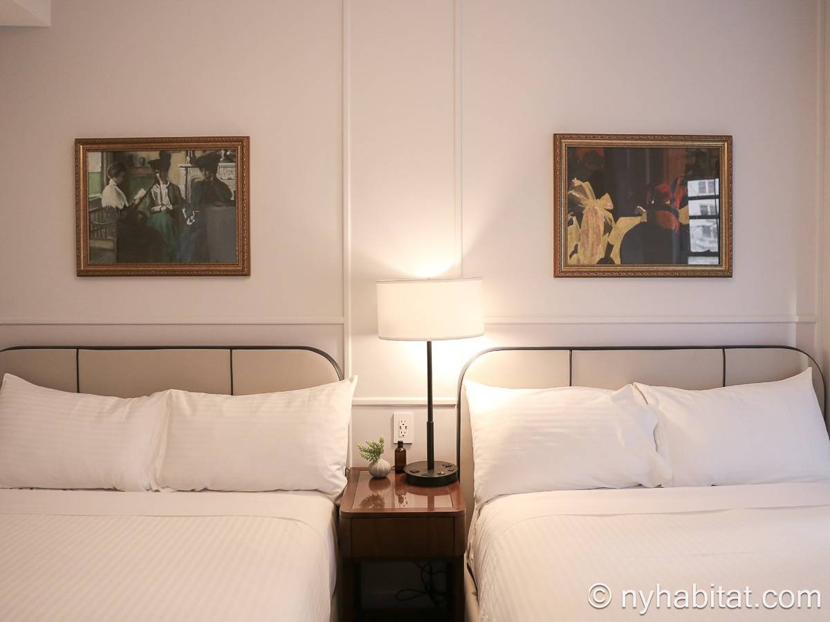 Step inside this studio rental and you find a space with two double-size beds. Each bed has a nightstand with a lamp. Across from these beds, there is a TV mounted on the wall, and a small table with chairs. There is air conditioning and a marble bathroom with a showerhead.